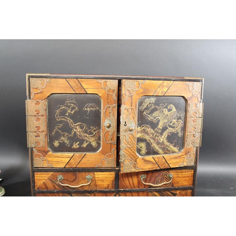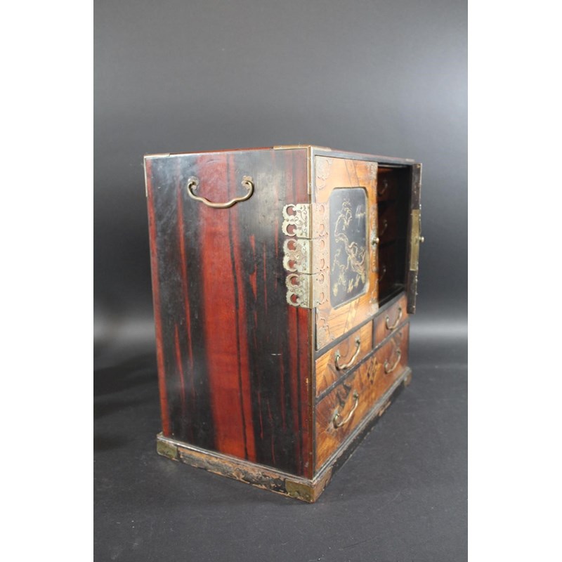 a large wooden table cabinet with lacquer panel doors decorated with birds within a landscape, with inlaid wooden decoration and internal and external drawers with brass handles. With brass hinges and carrying handles, 43cms high, 44cms across