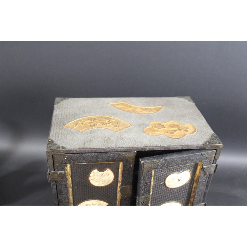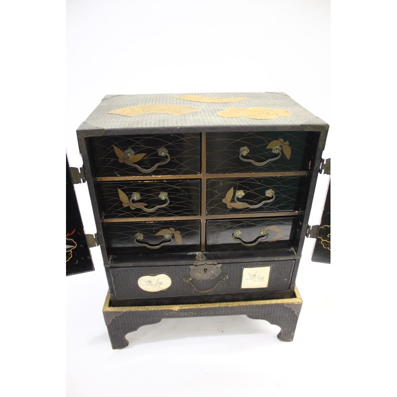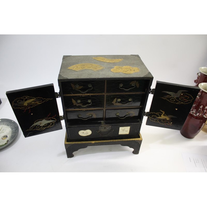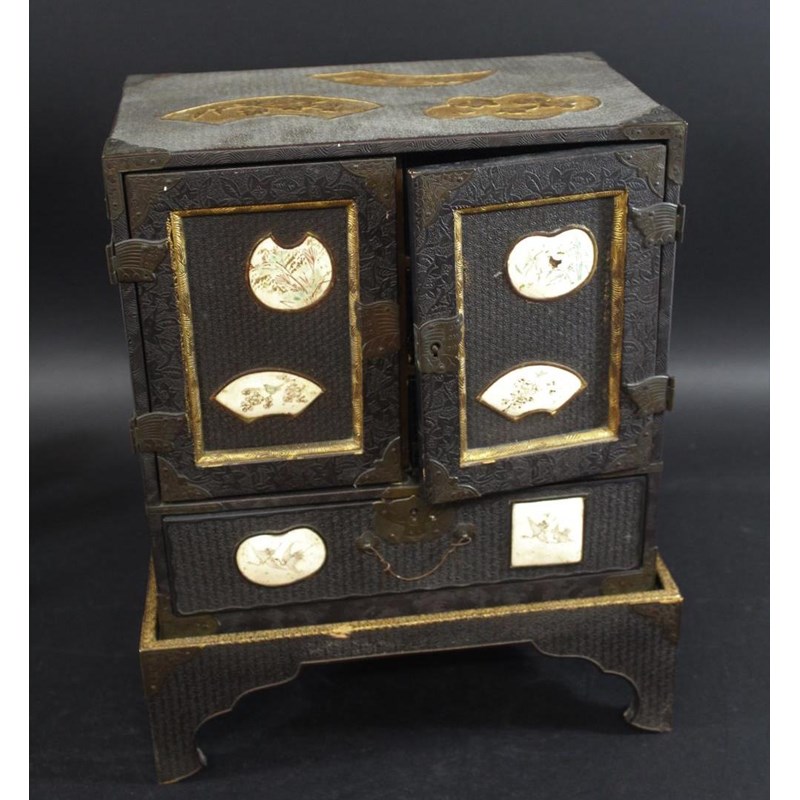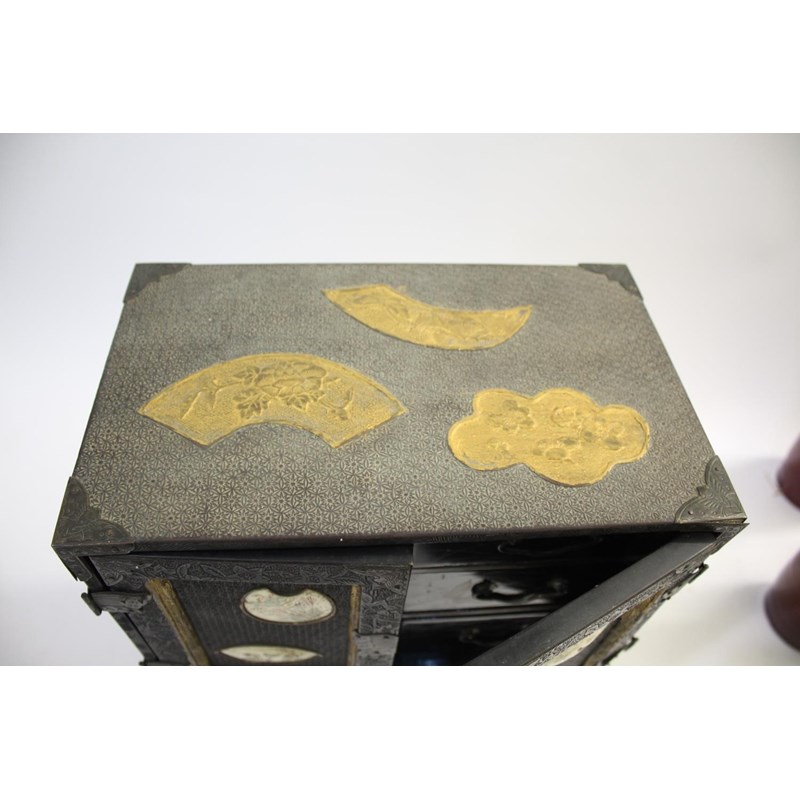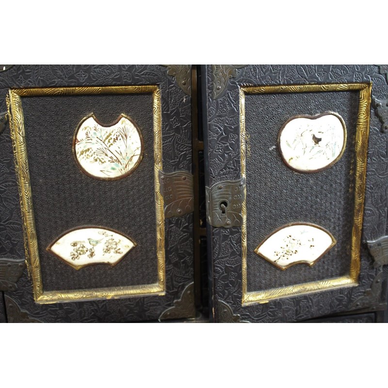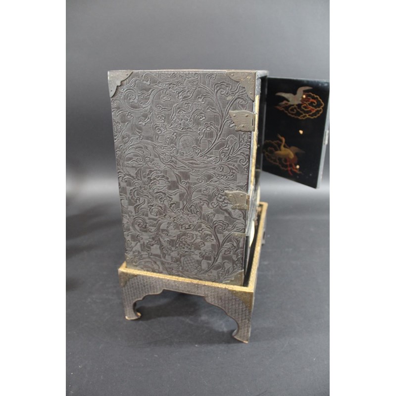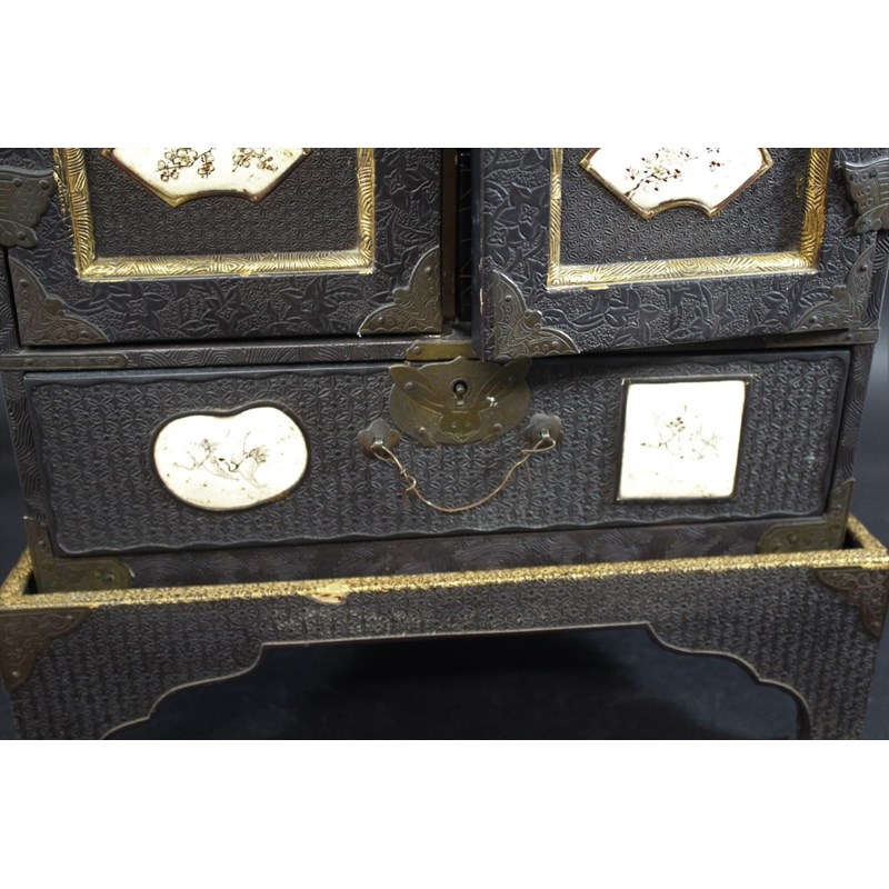 Meiji period, a lacquer and wooden table cabinet with inset satsuma pottery plaques painted with birds and flowers, with a raised foliate design to the front and sides and gilded panels to the top. With a fitted interior with drawers and further birds. On a stand, 39.5cms high