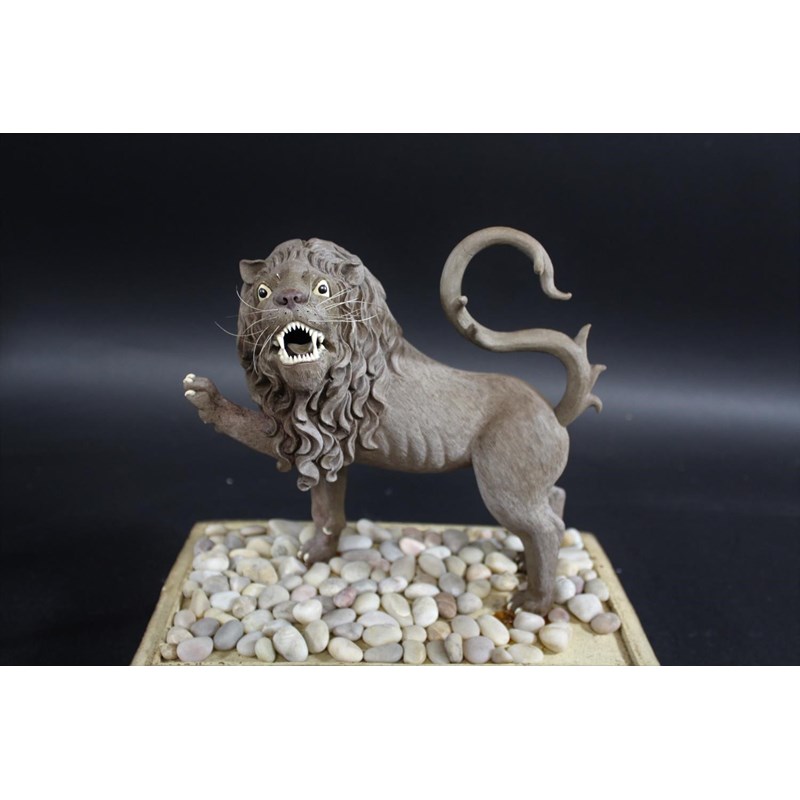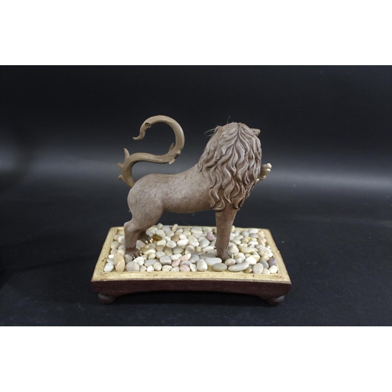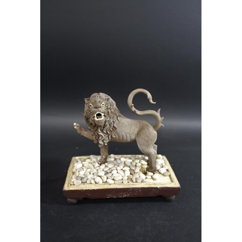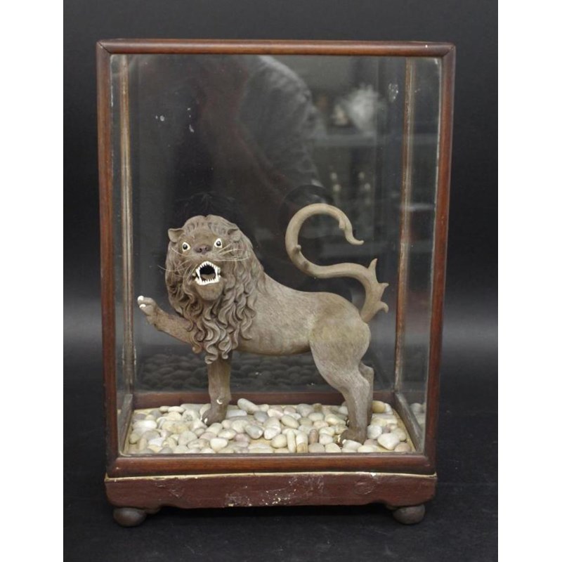 ORIENTAL TERRACOTTA LION & GLASS CASE a terracotta figure of a roaring lion with one foot raised, on a pottery base with loose stones and in a glazed case. Case 37cms high