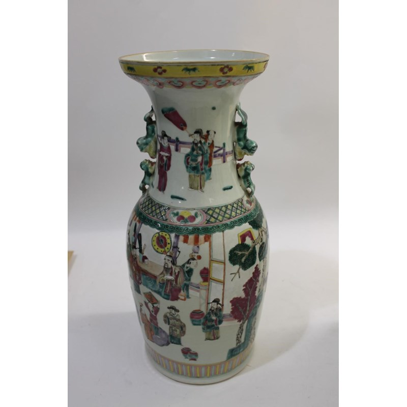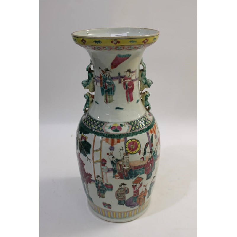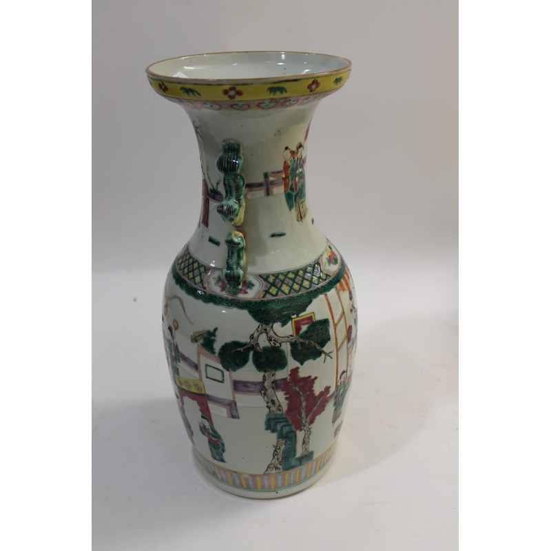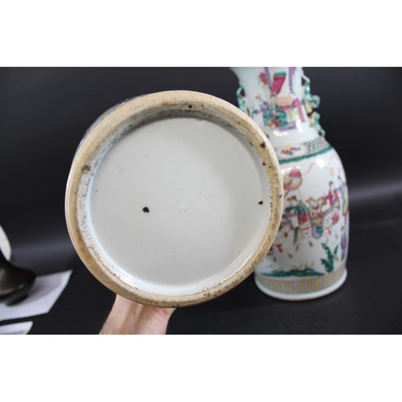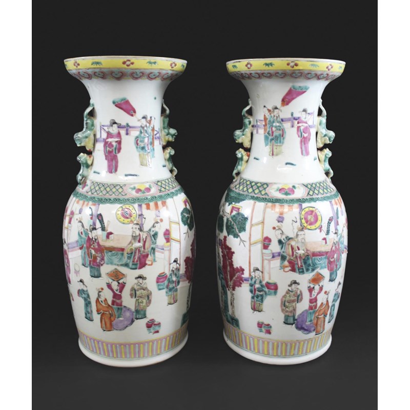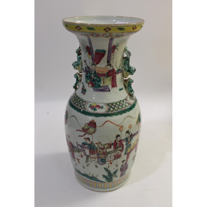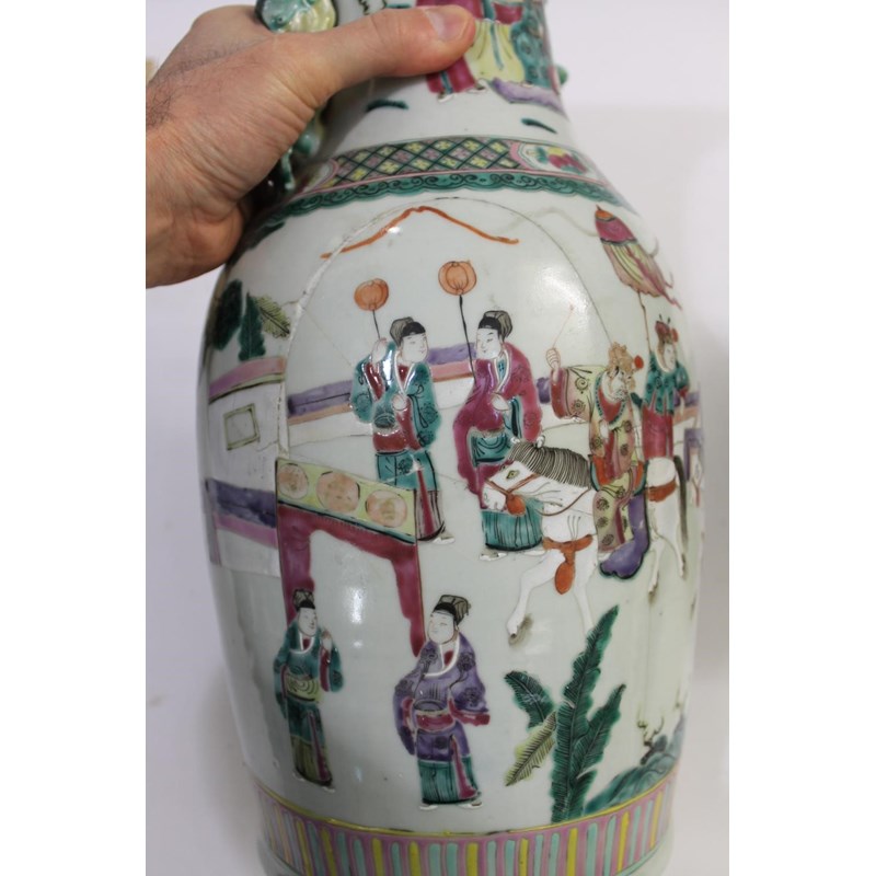 a large pair of Chinese export vases, each painted with a variety of figures including scholars, figures in conversation, and figures on horseback, with applied chilong to each side of the neck. One vase with some damage, 45cms high. (2)