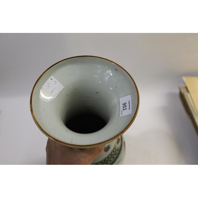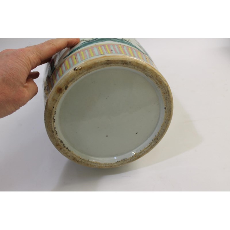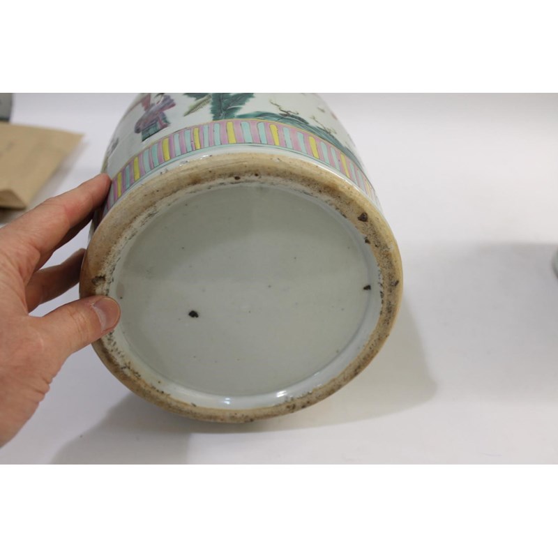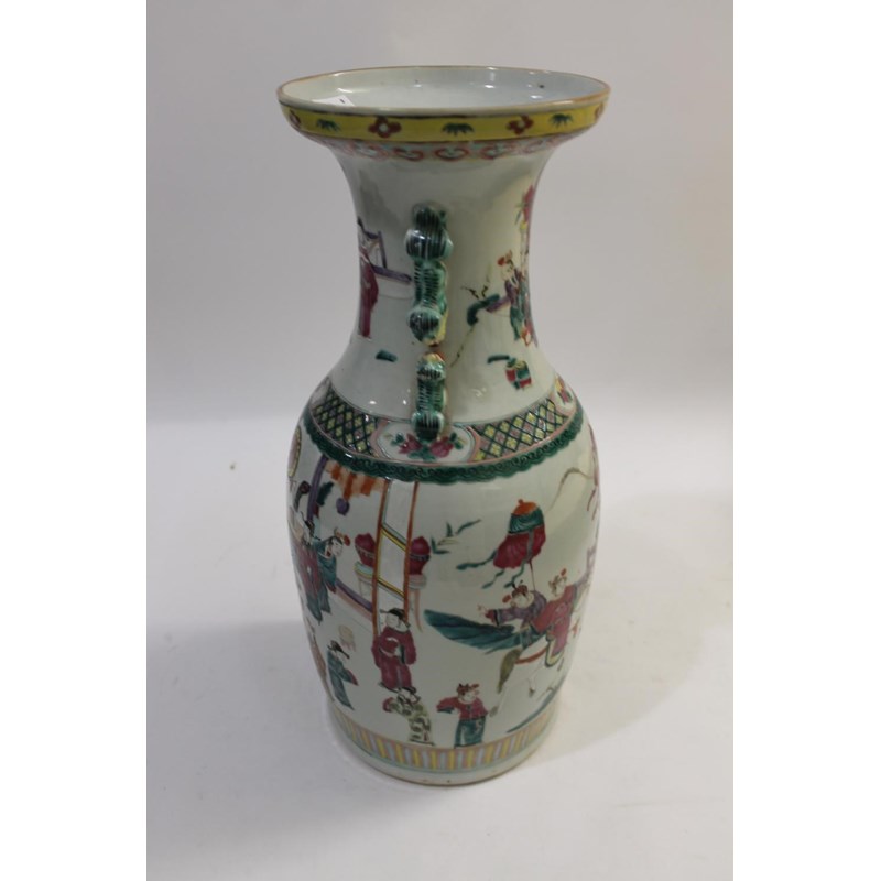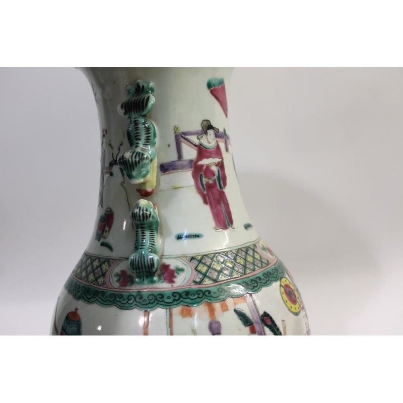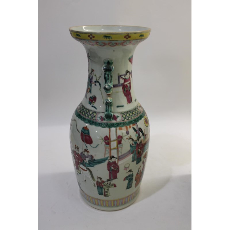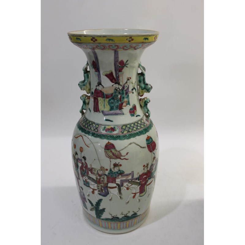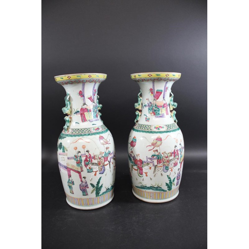 a large pair of Chinese export vases, each painted with a variety of figures including scholars, figures in conversation, and figures on horseback, with applied chilong to each side of the neck. One vase with some damage, 45cms high. (2)