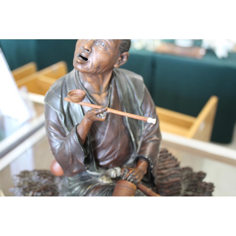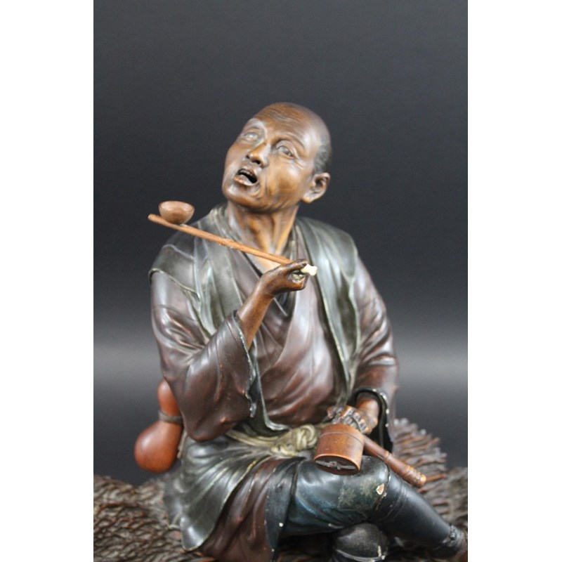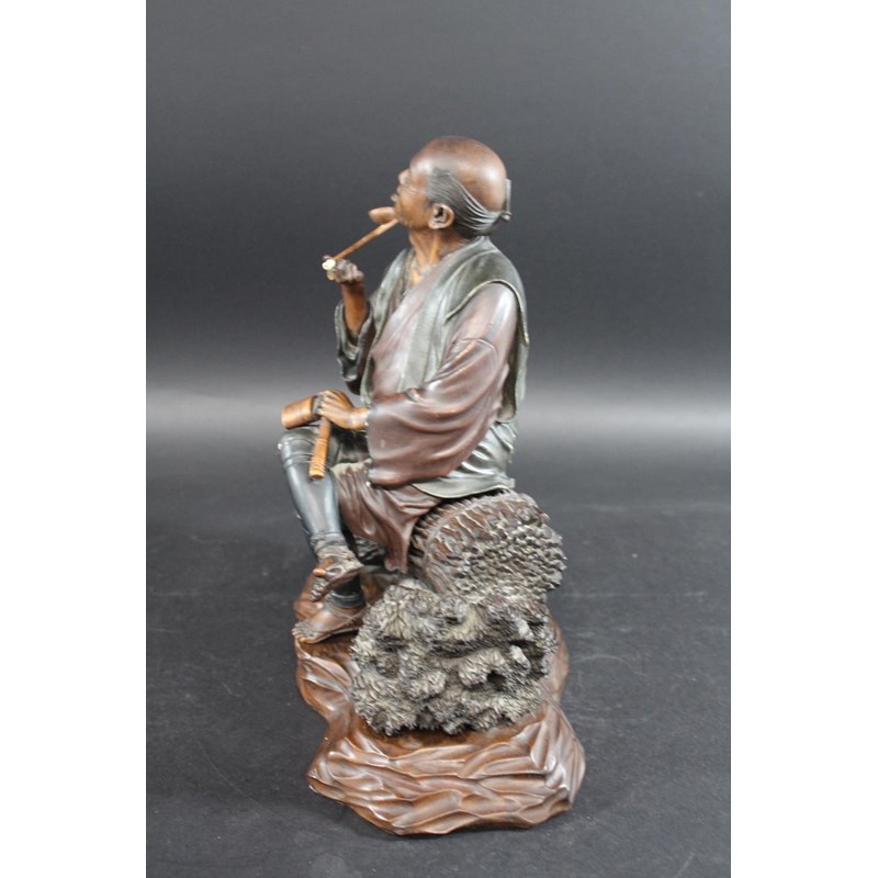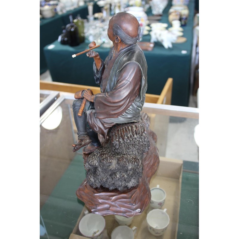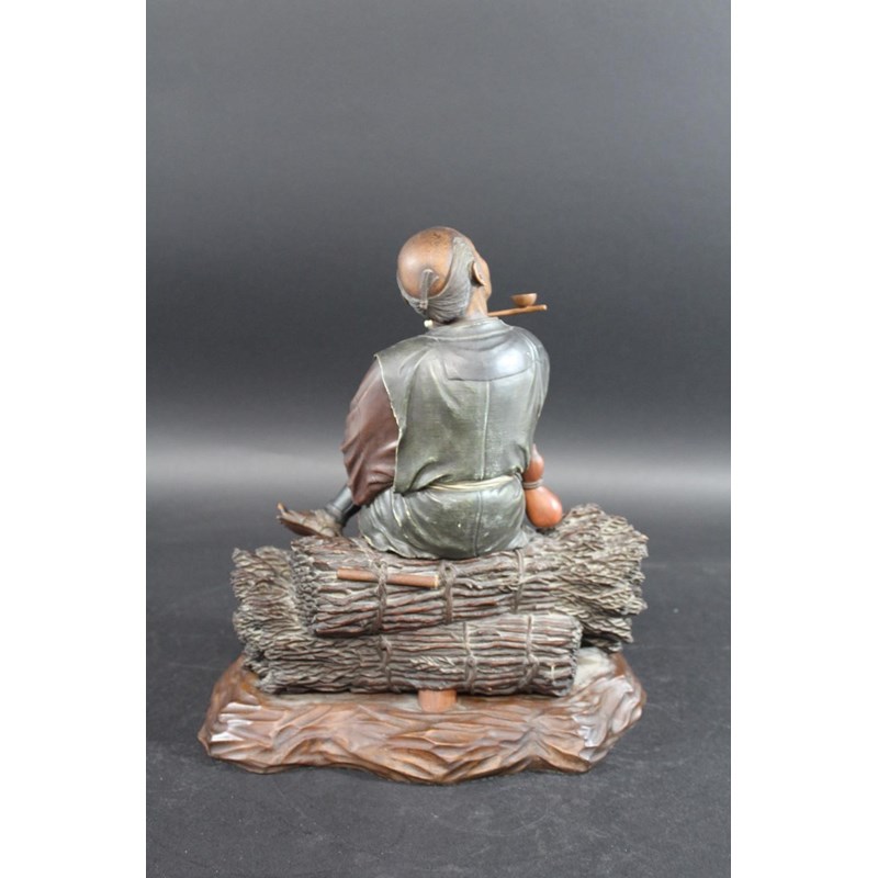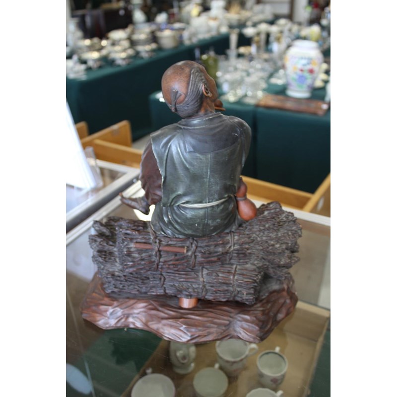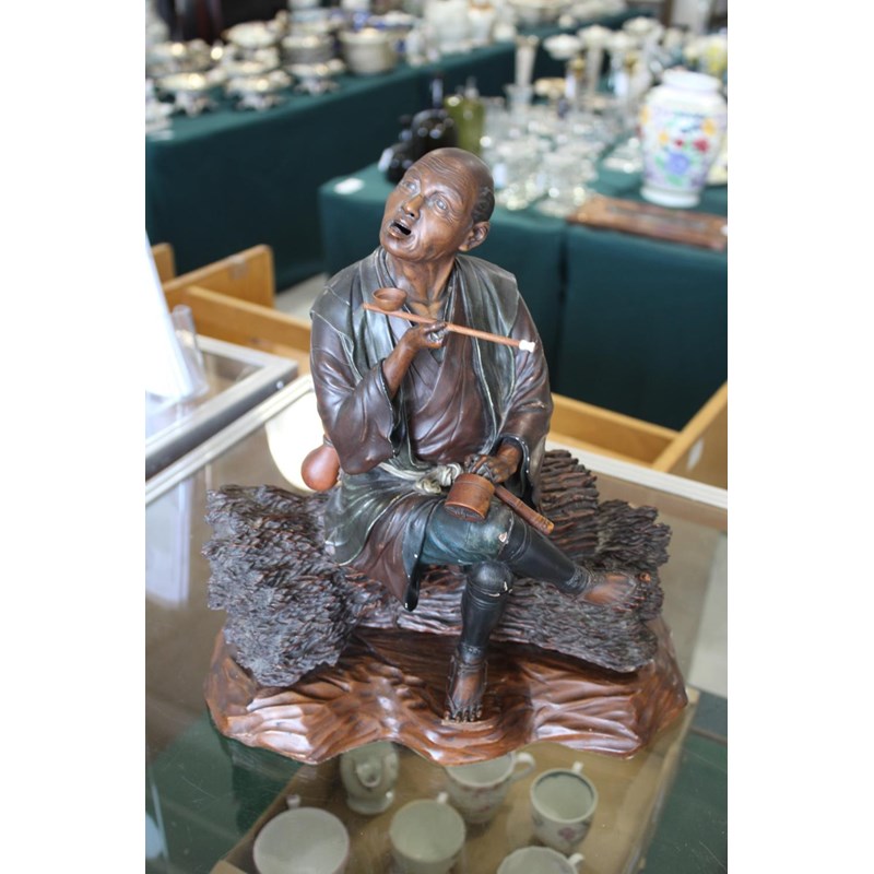 Meiji period, a large and well carved figure of a gentleman holding a pipe and seated on sheaves of wheat or sticks. Mounted on a separate wooden stand, 34.5cms high