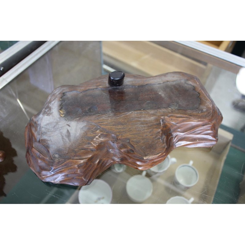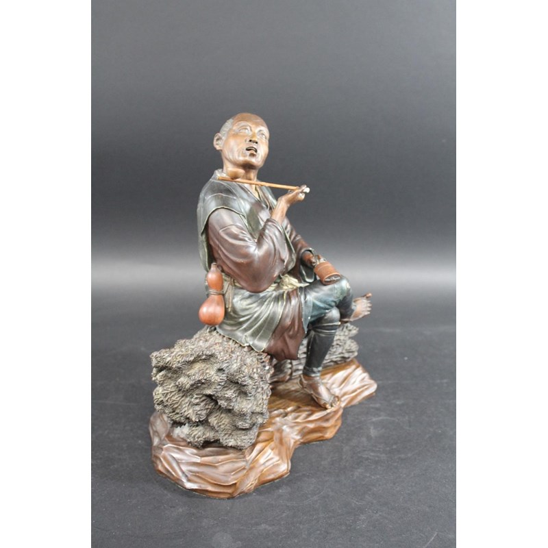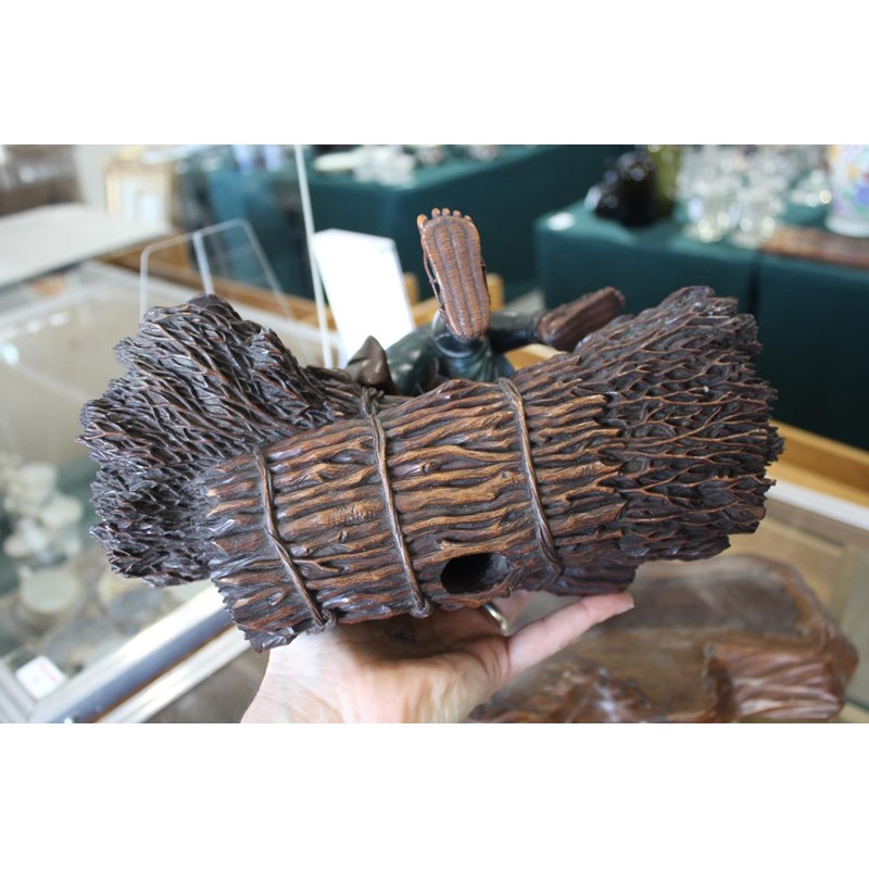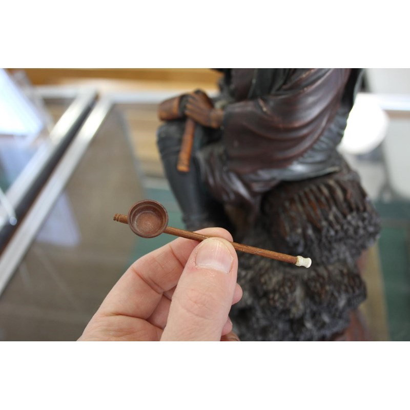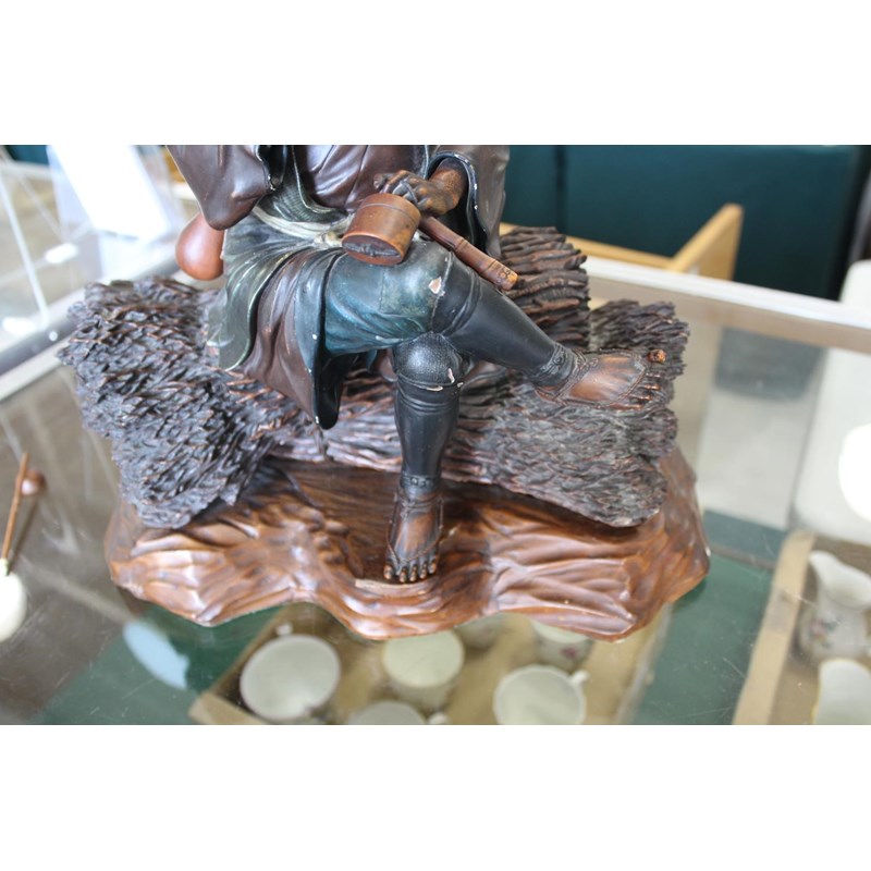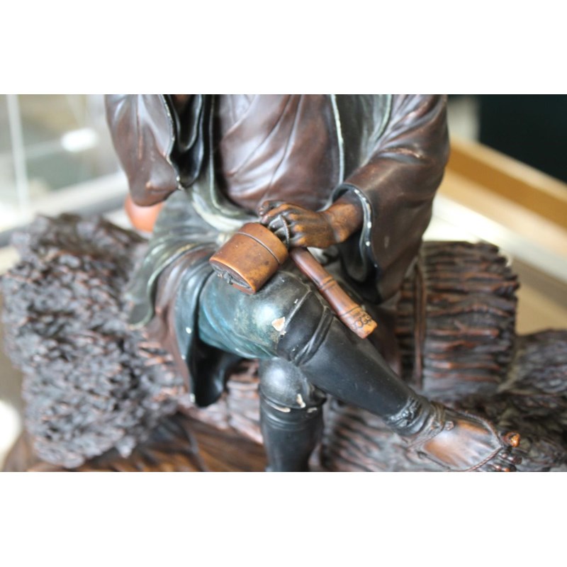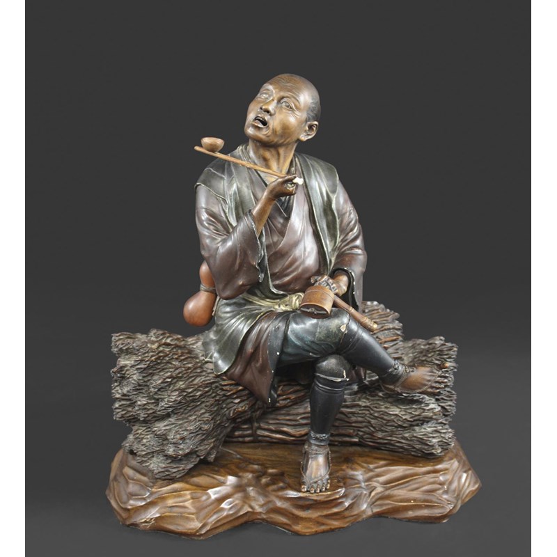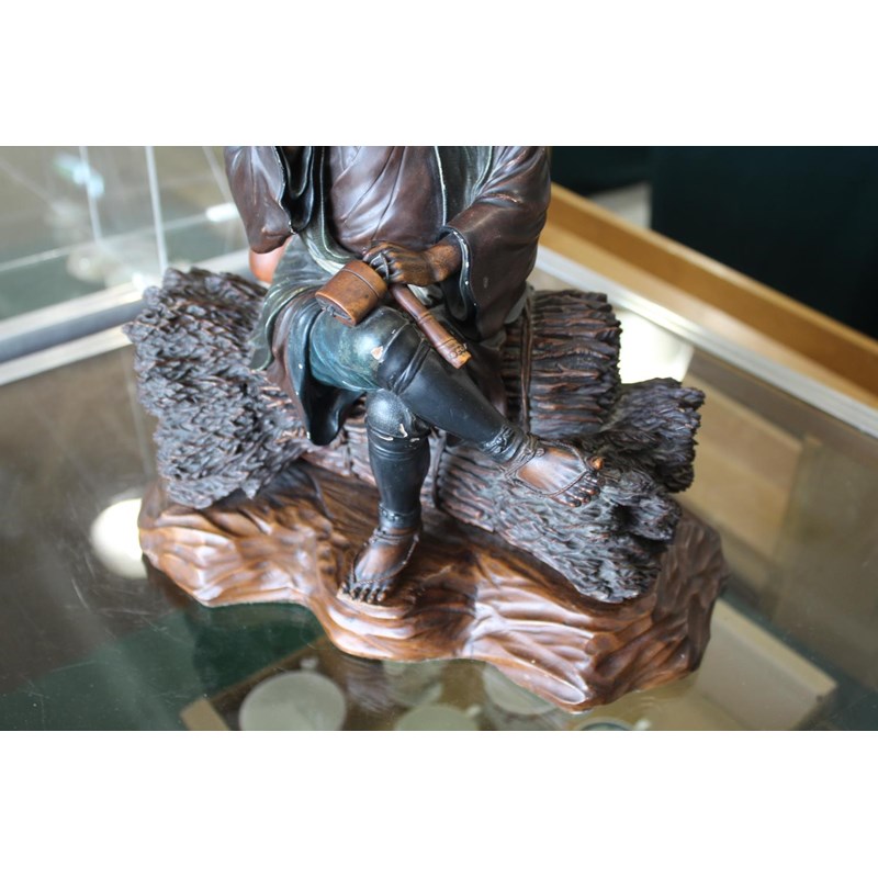 Meiji period, a large and well carved figure of a gentleman holding a pipe and seated on sheaves of wheat or sticks. Mounted on a separate wooden stand, 34.5cms high