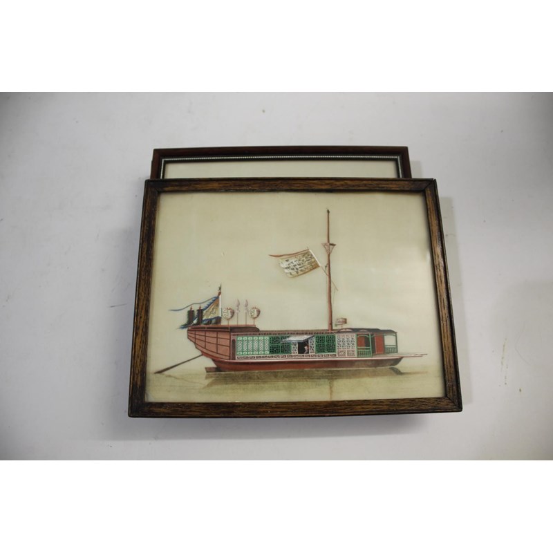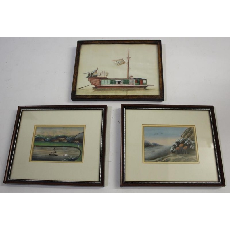 CHINESE PITH PAINTINGS three small framed paintings on rice paper, including one of a boat (19cms by 14cms), a small painting of a steamer on the water, and a landscape scene (10.5cms by 7.5cms). (3)