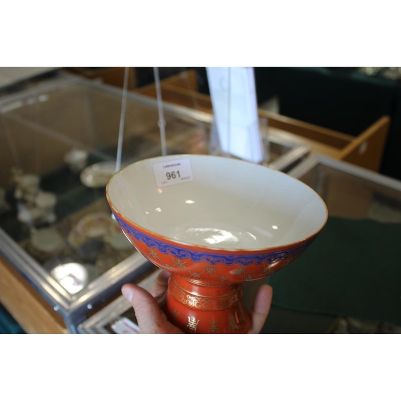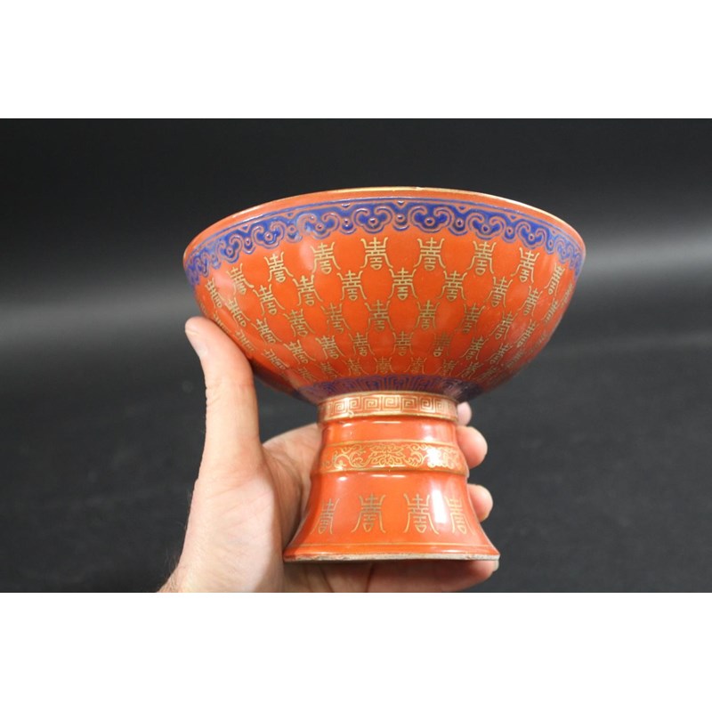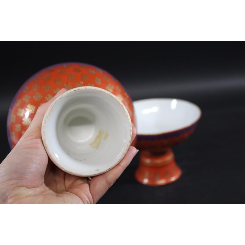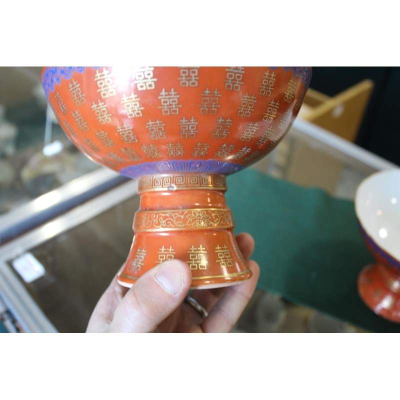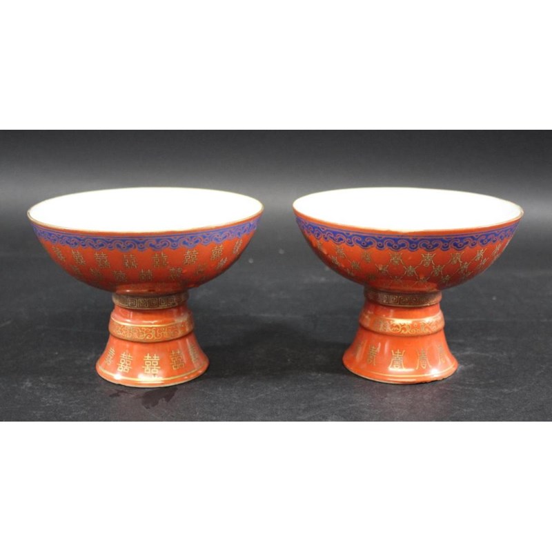 PAIR OF CHINESE CORAL STEM BOWLS 19thc, the circular bowls supported on tapering bases, with a variety of gilded Chinese symbols on a coral ground, and bands of blue painted decoration. 12.5cms high, 16.5cms diameter. (2)
