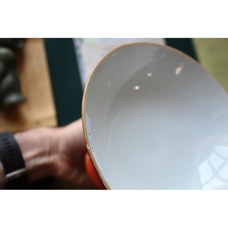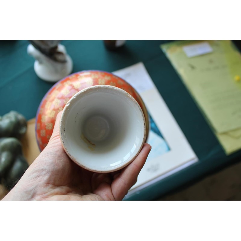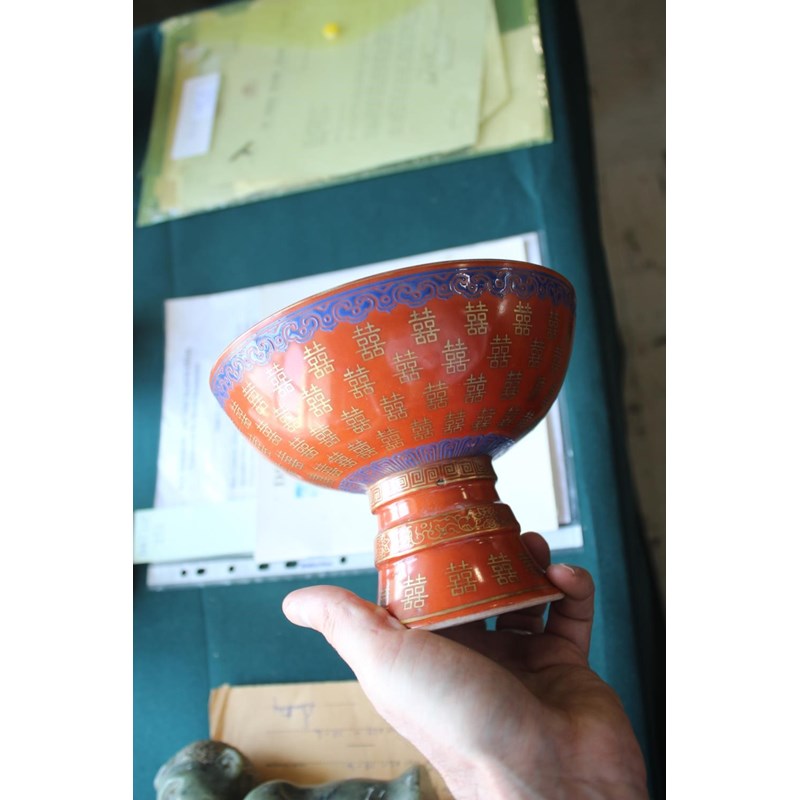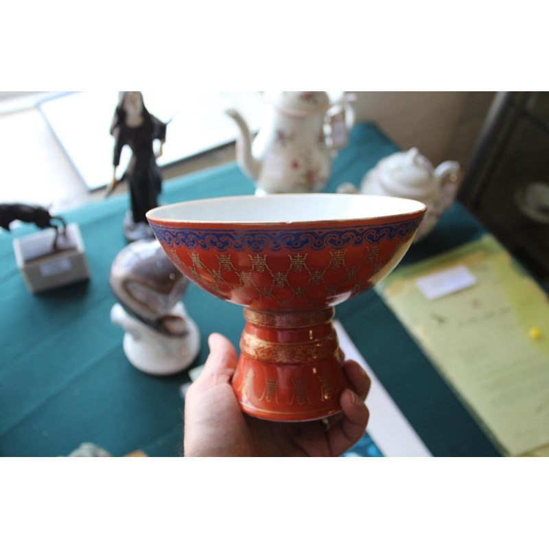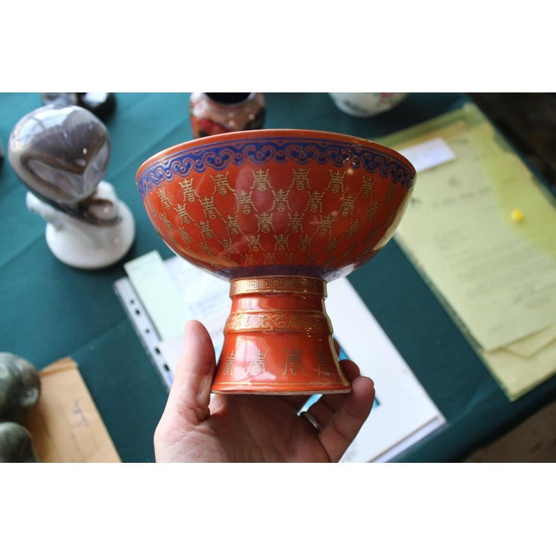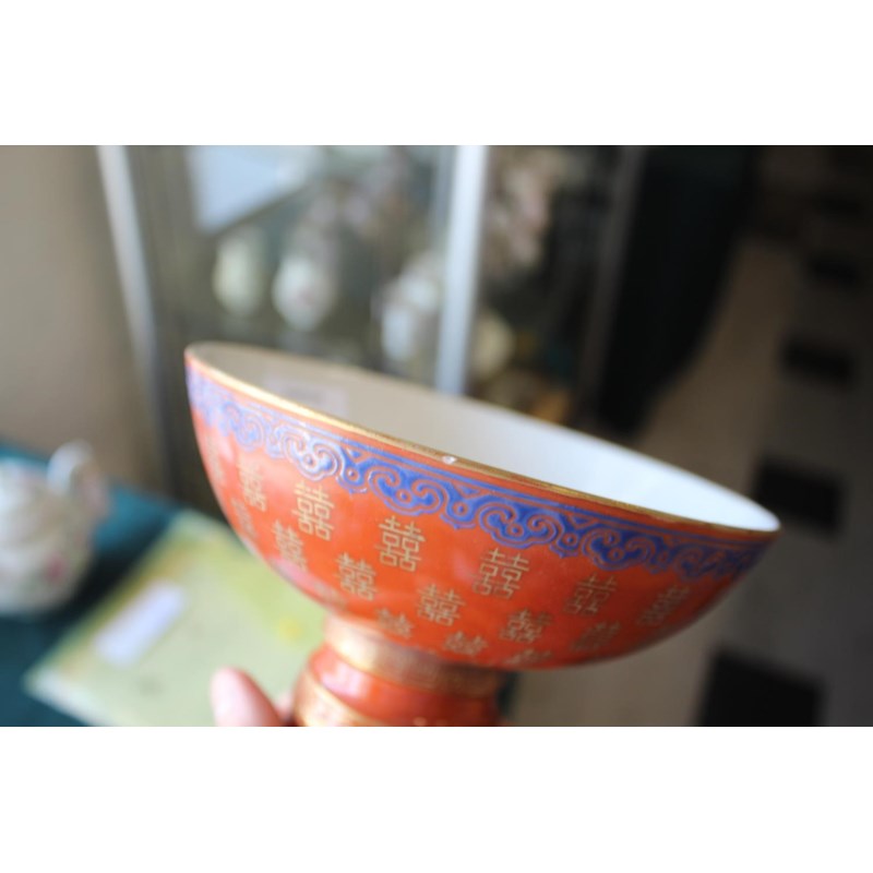 PAIR OF CHINESE CORAL STEM BOWLS 19thc, the circular bowls supported on tapering bases, with a variety of gilded Chinese symbols on a coral ground, and bands of blue painted decoration. 12.5cms high, 16.5cms diameter. (2)