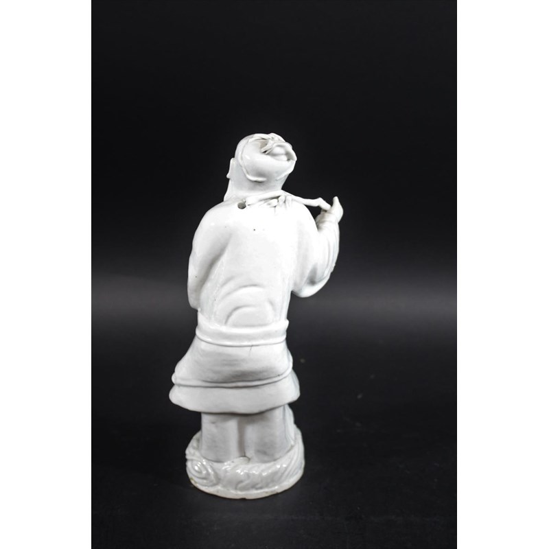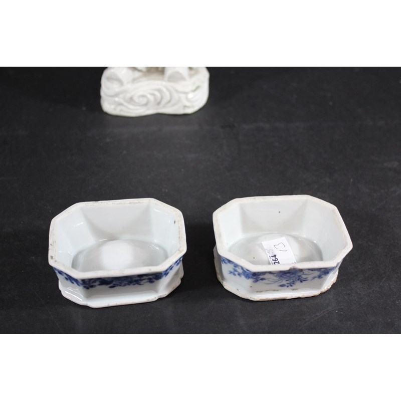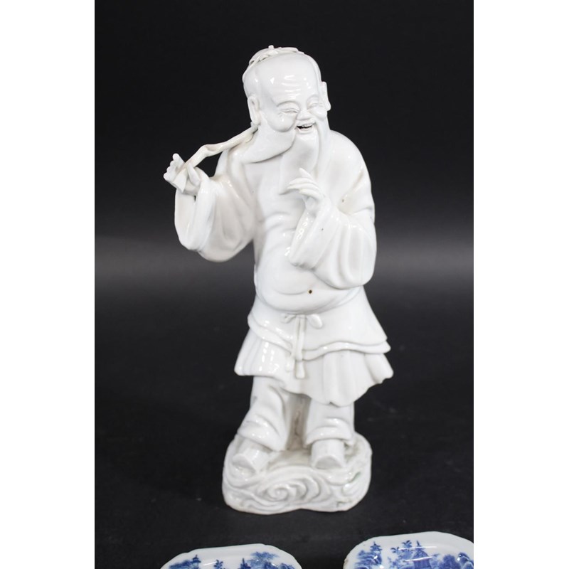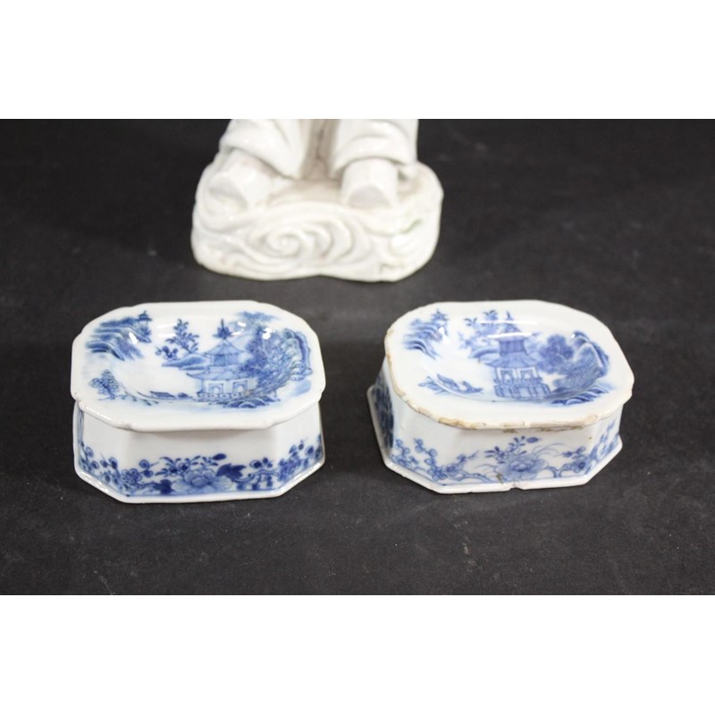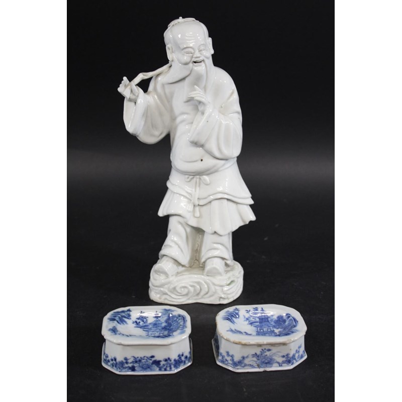18thc, the tops painted with a building within a landscape scene and with flowers around the bodies, both with chips in places, 7.5cms across. Also with a 19thc Chinese Dehua figure of an immortal, some chips to the stick and hand etc, 26.5cms high. (3)
