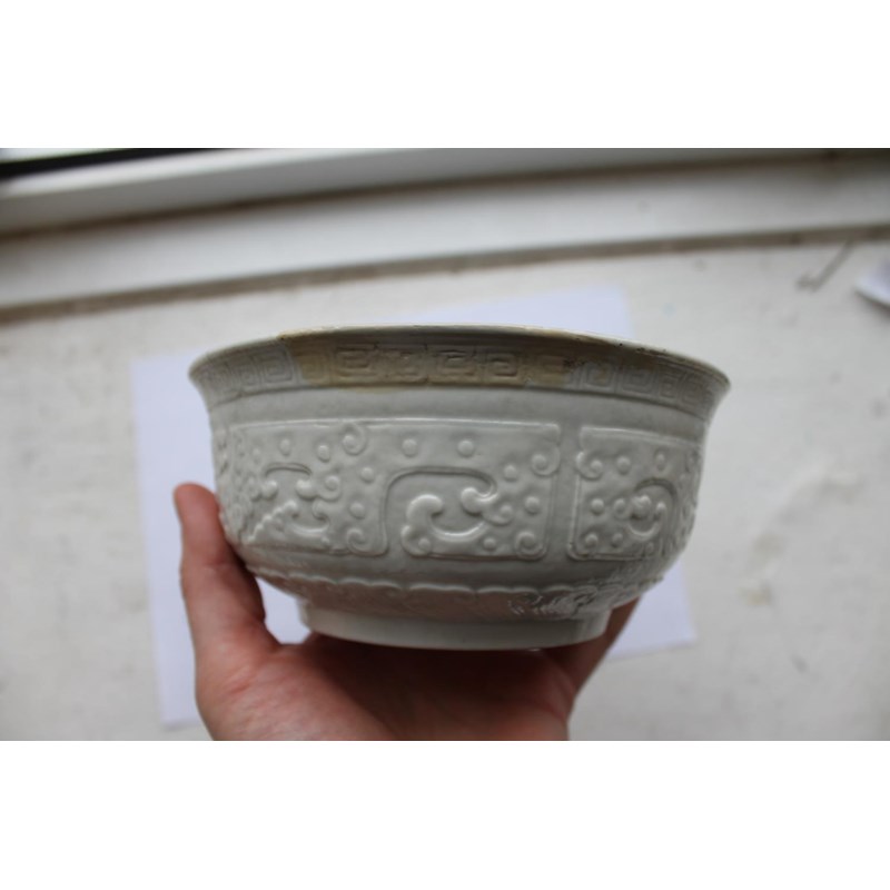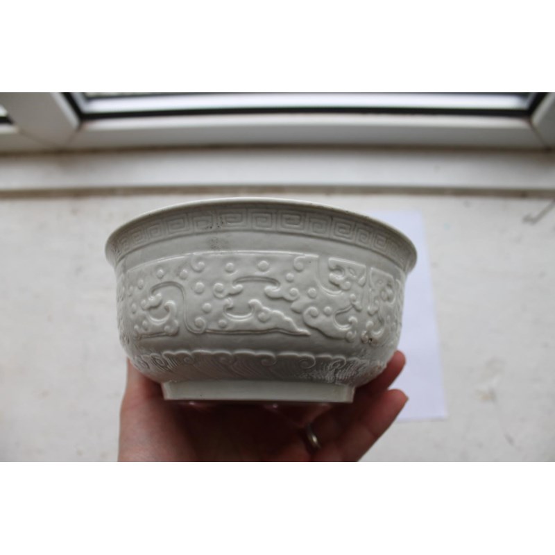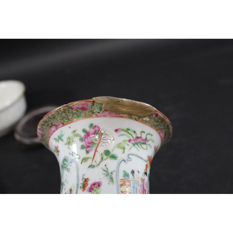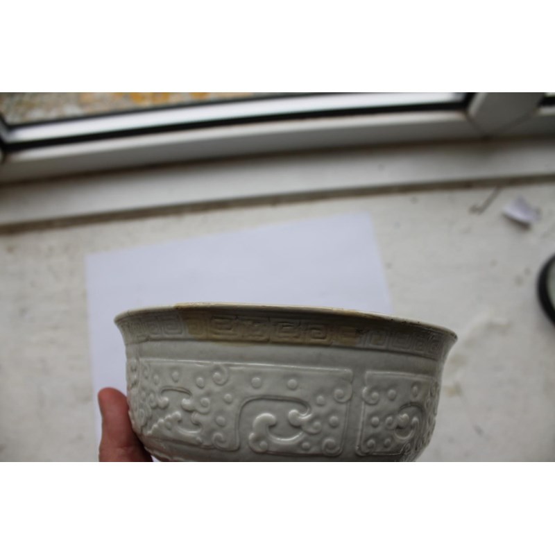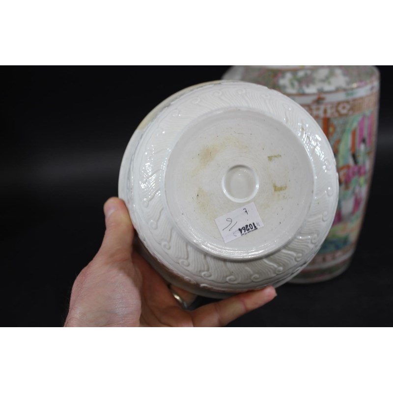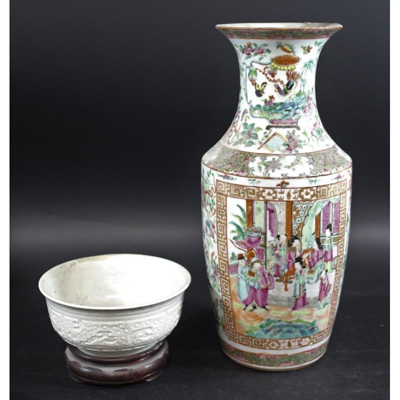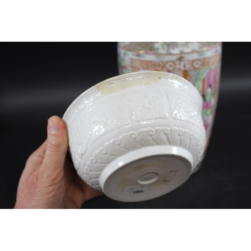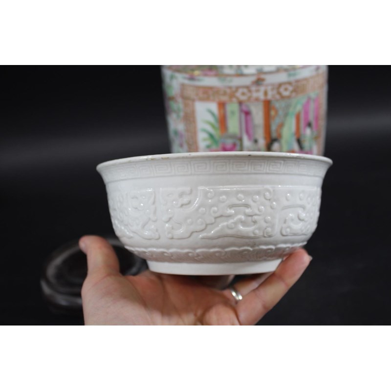 the bowl with a slightly flared rim and straight foot, with moulded decoration including key fret design around the rim and other decoration (cracked, and area of rim patched over, 16cms diameter. Also with a large 19thc Cantonese famille rose vase, with panels painted with various figures, birds and flowers (filled in areas to the rim which need restoring, 36.5cms high). (2)