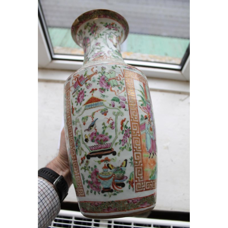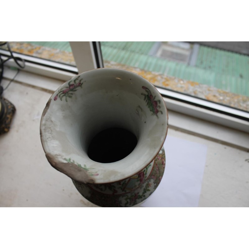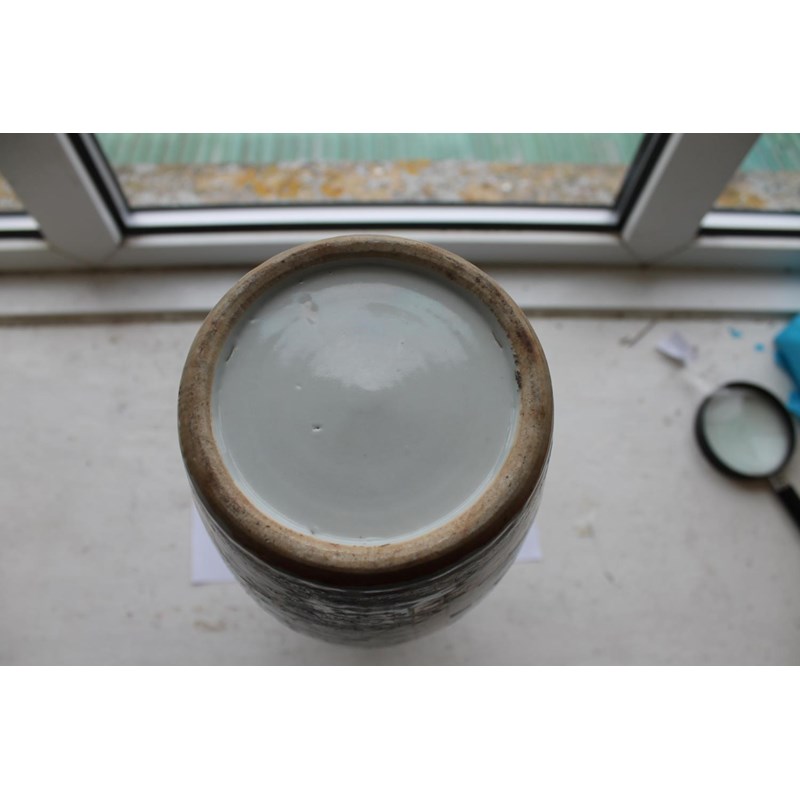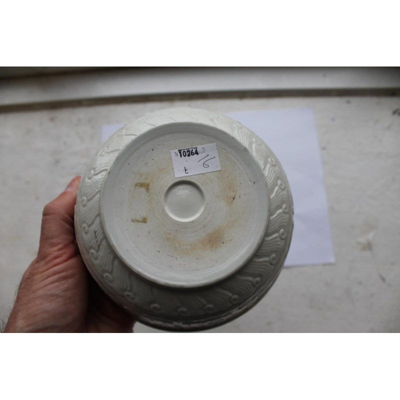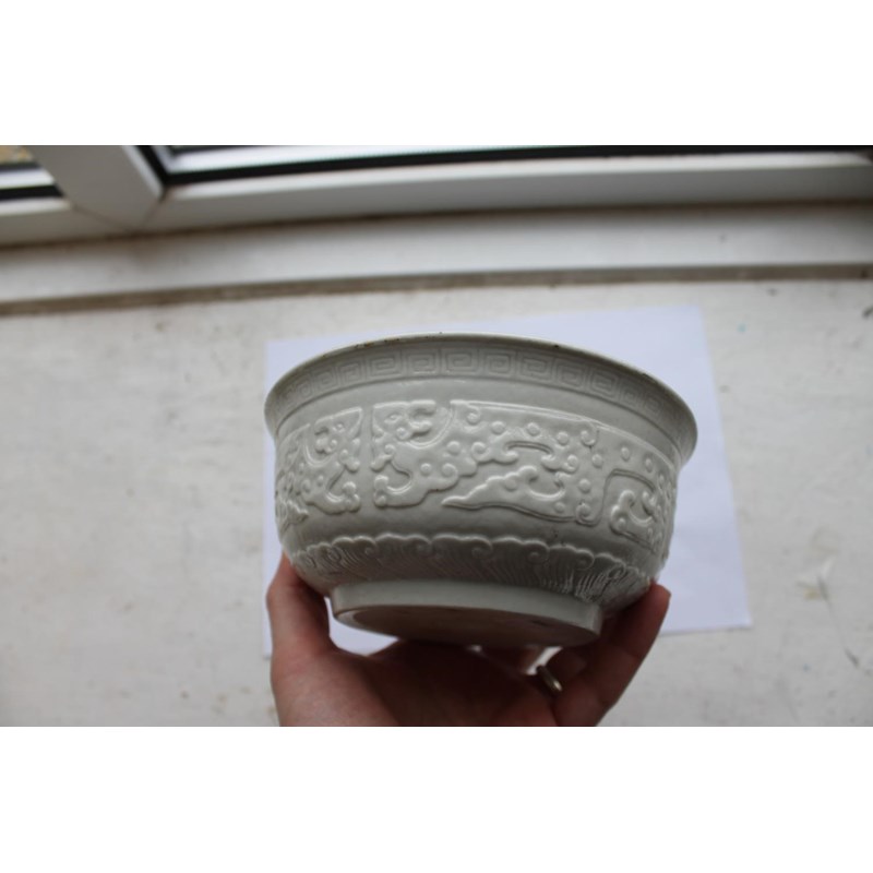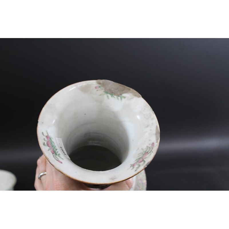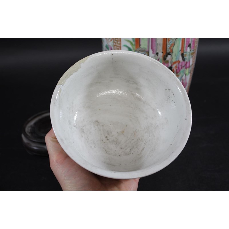 the bowl with a slightly flared rim and straight foot, with moulded decoration including key fret design around the rim and other decoration (cracked, and area of rim patched over, 16cms diameter. Also with a large 19thc Cantonese famille rose vase, with panels painted with various figures, birds and flowers (filled in areas to the rim which need restoring, 36.5cms high). (2)