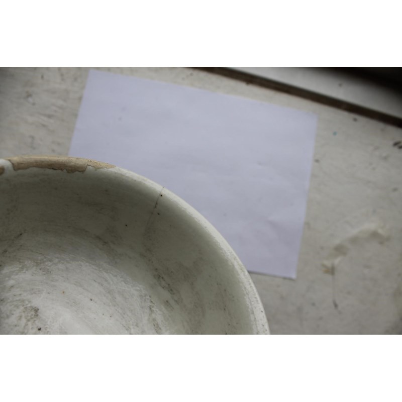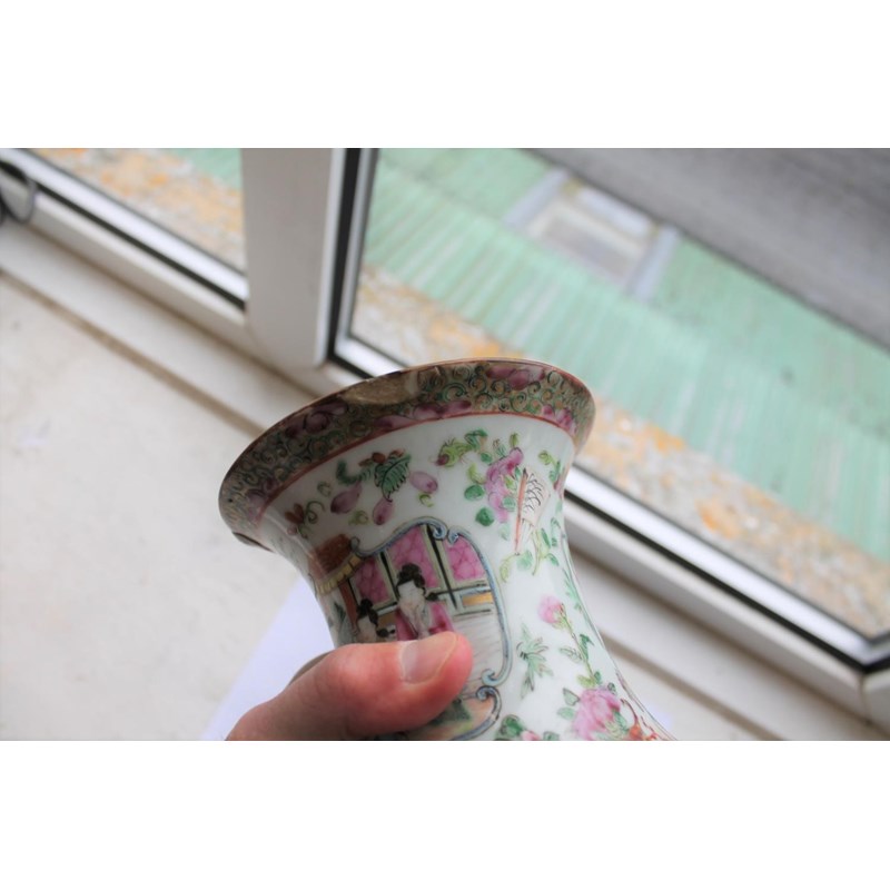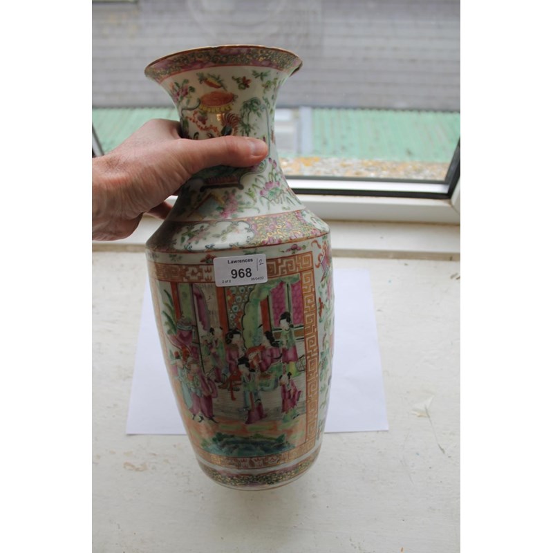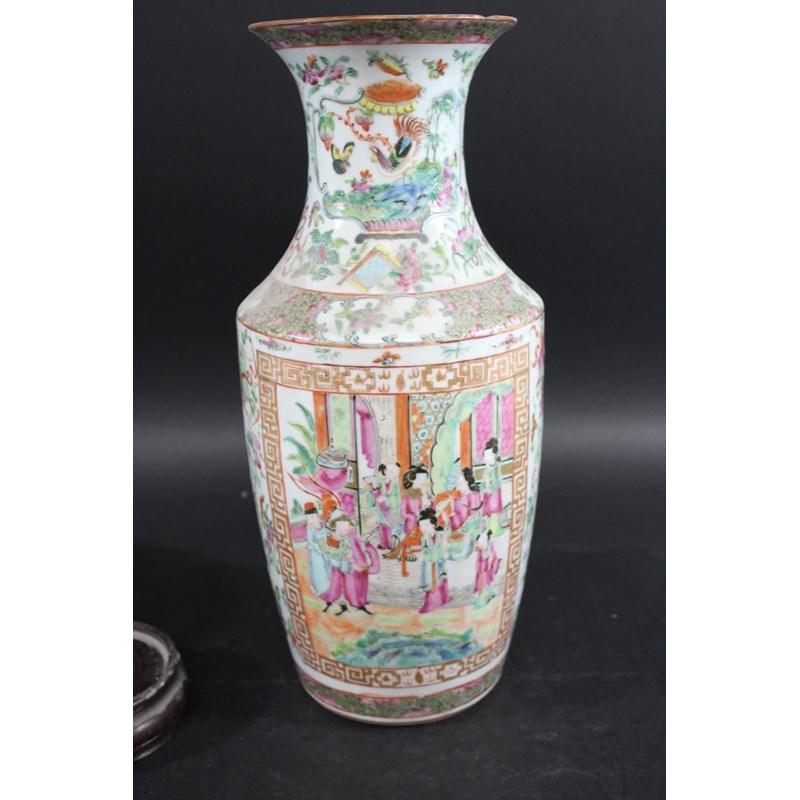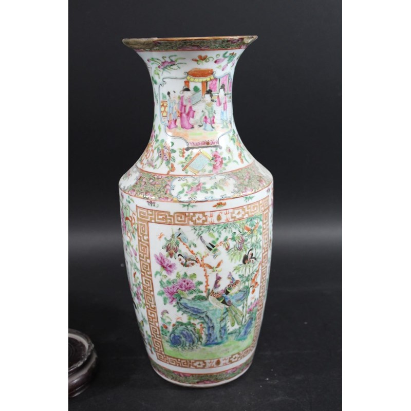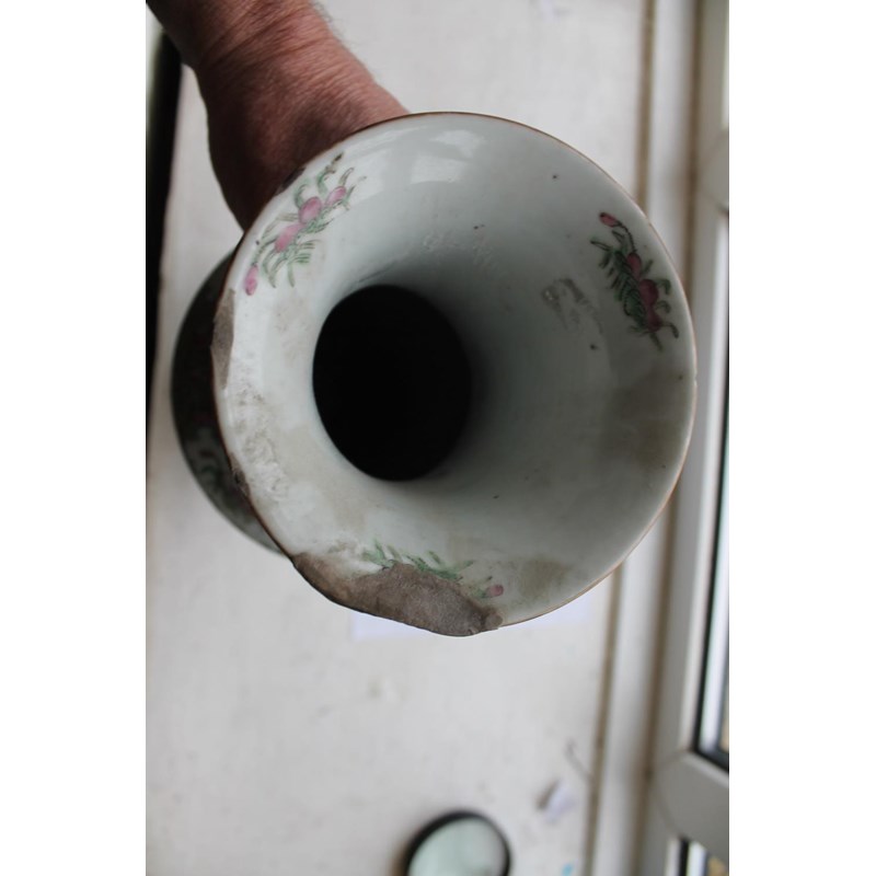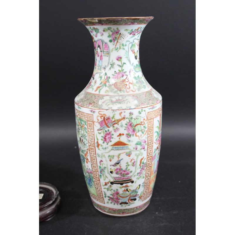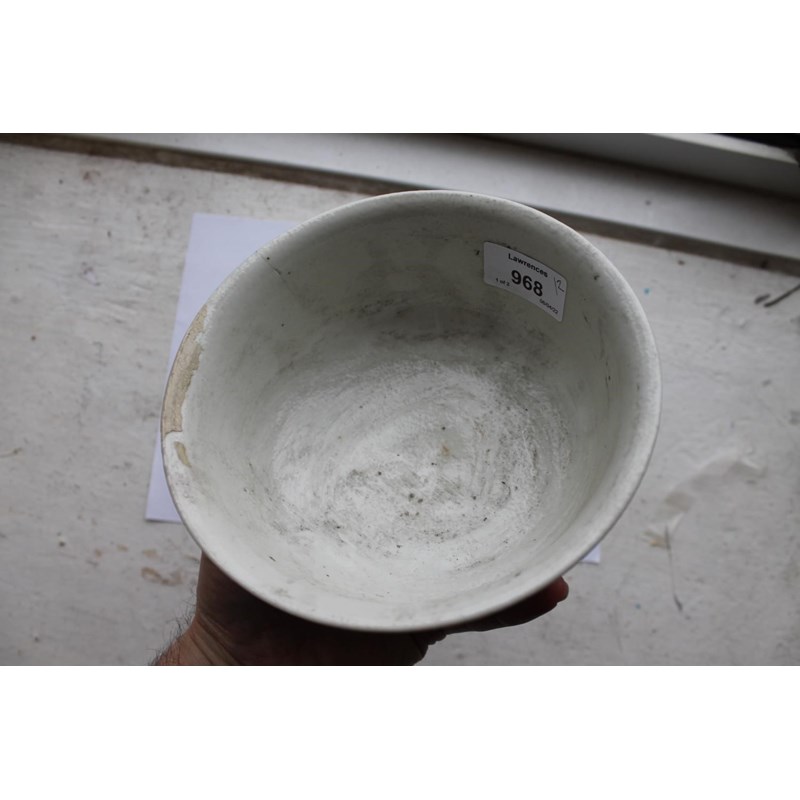the bowl with a slightly flared rim and straight foot, with moulded decoration including key fret design around the rim and other decoration (cracked, and area of rim patched over, 16cms diameter. Also with a large 19thc Cantonese famille rose vase, with panels painted with various figures, birds and flowers (filled in areas to the rim which need restoring, 36.5cms high). (2)