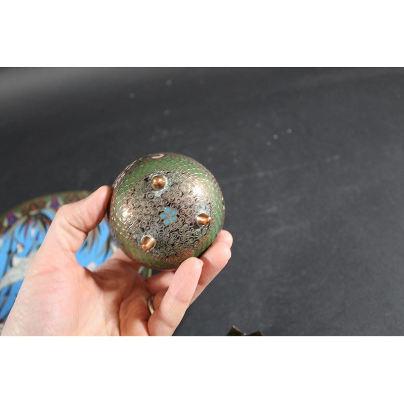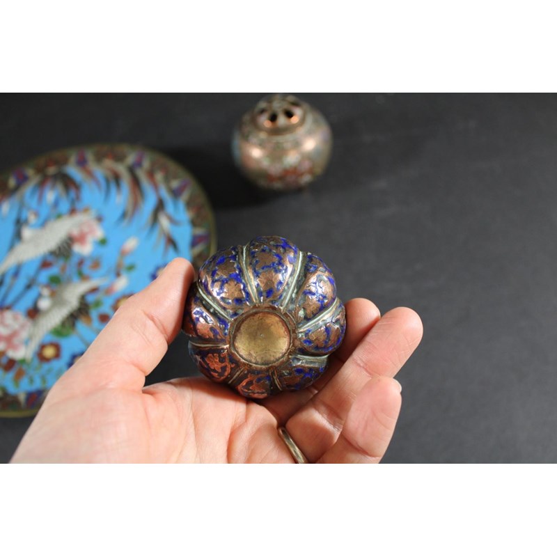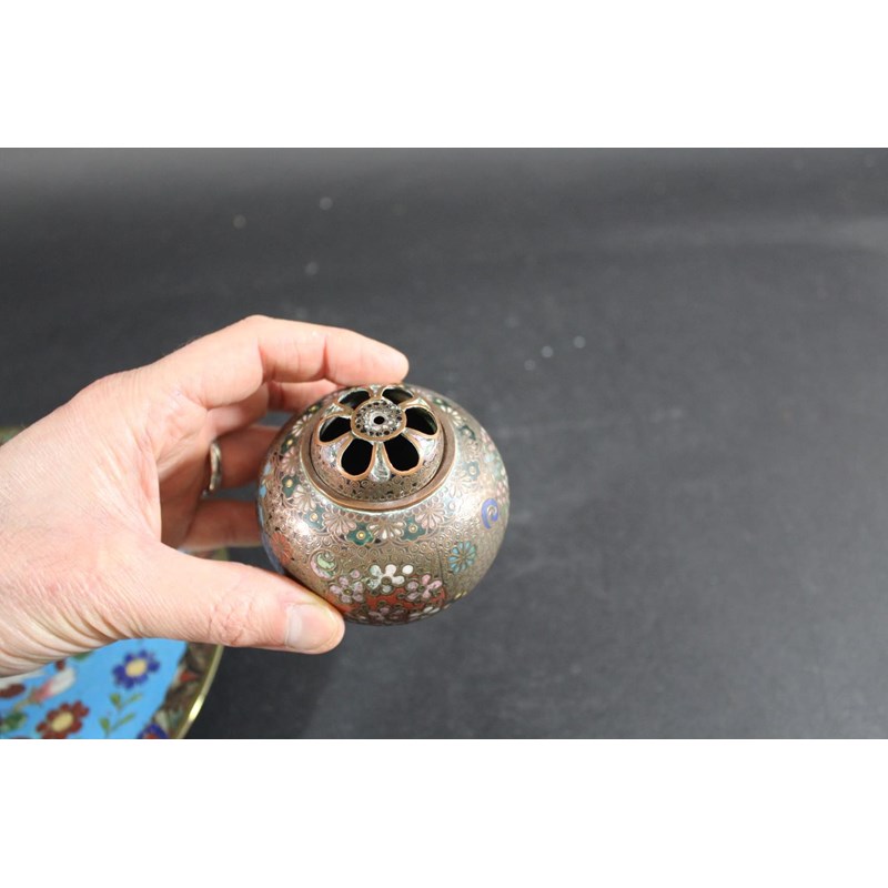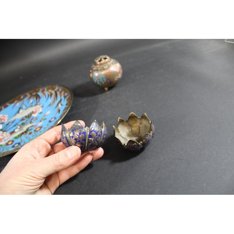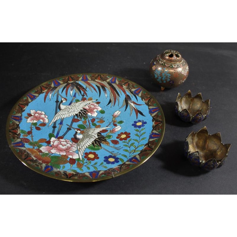 the plate decorated with stork's, flowers and foliage, 24cms diameter. Also with a small cloisonne koro (8cms high), and a pair of small copper and enamel pots in the form of a flower petal, possibly Persian (6cms across). (4)