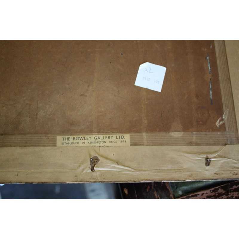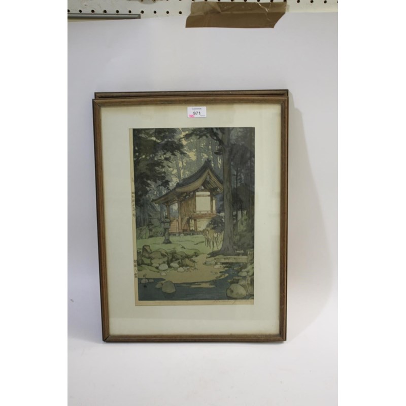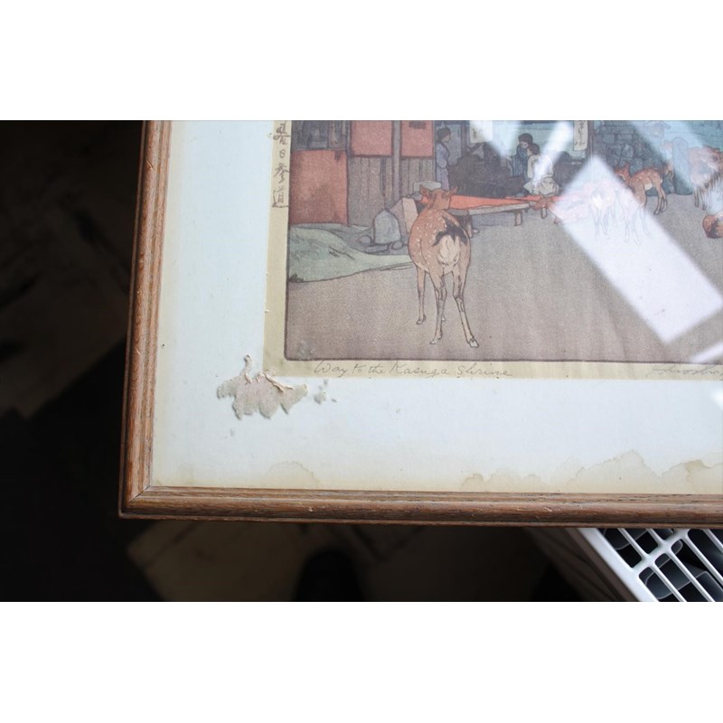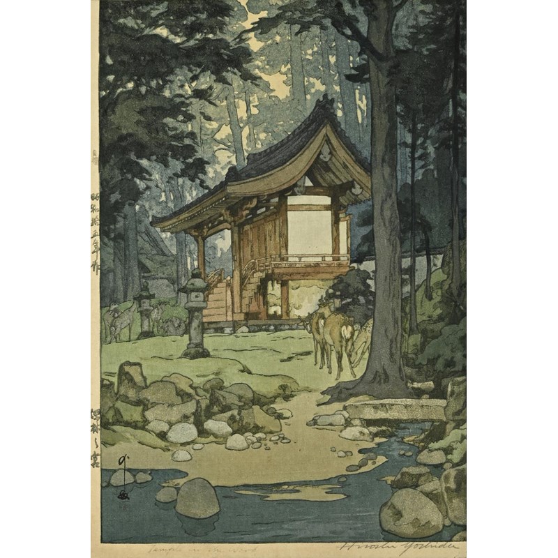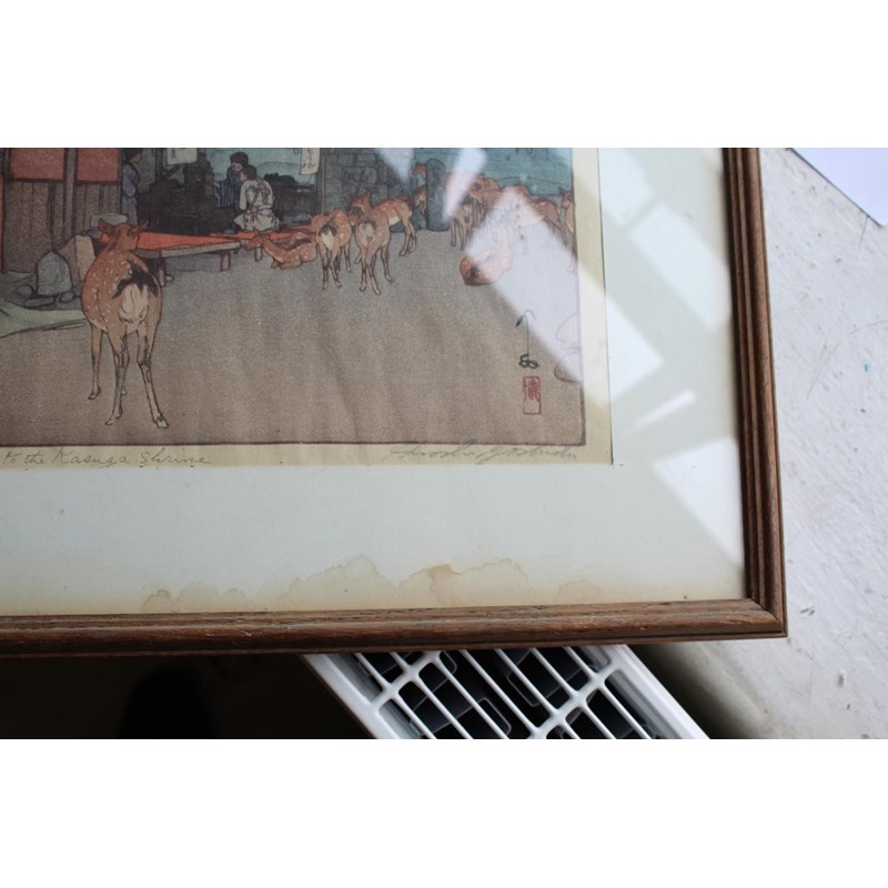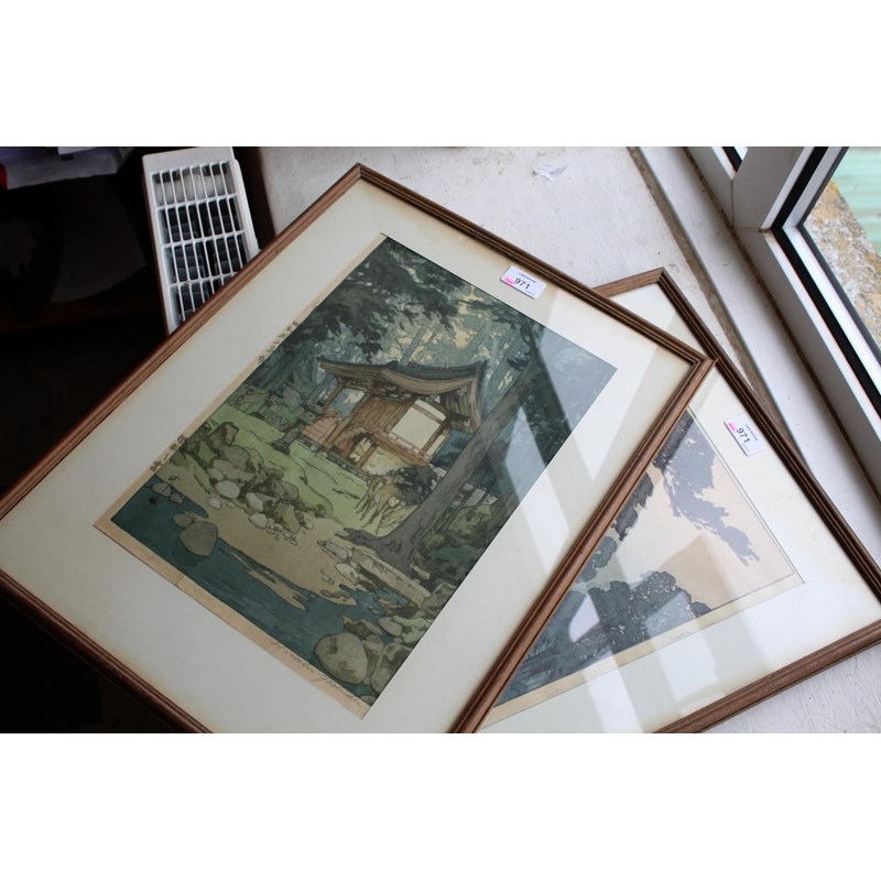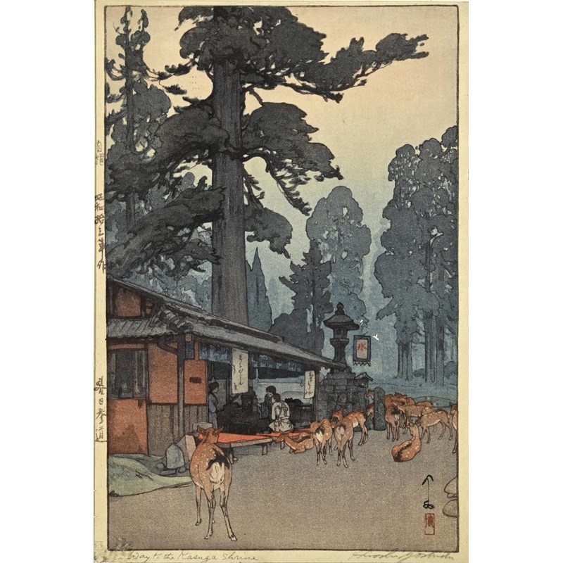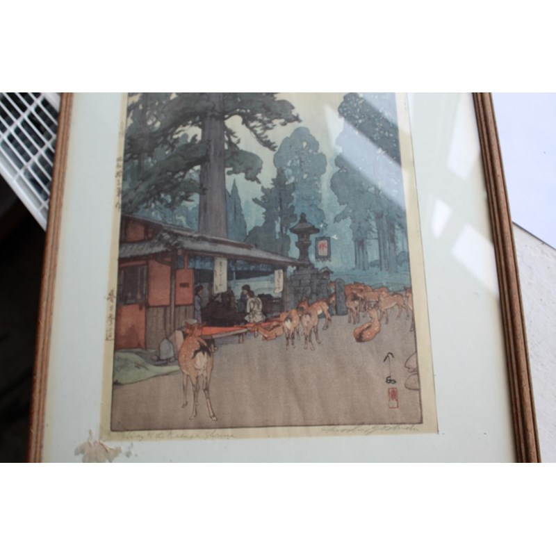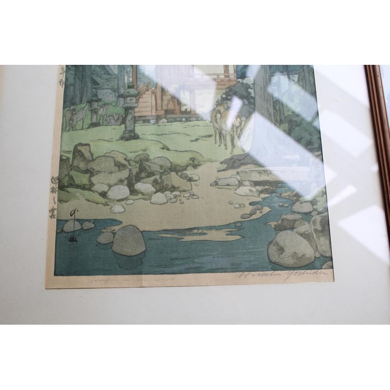 Showa era, two coloured woodcut prints, titled The way to the Kasuga Shrine and The Temple in the Wood, with character marks on one side of the margins, and both signed Hiroshi Yoshido in pencil. Both in original frames and with labels on both for the Rowley Gallery Ltd. 38cms by 26cms and 37cms by 25cms, frames 51cms by 39cms