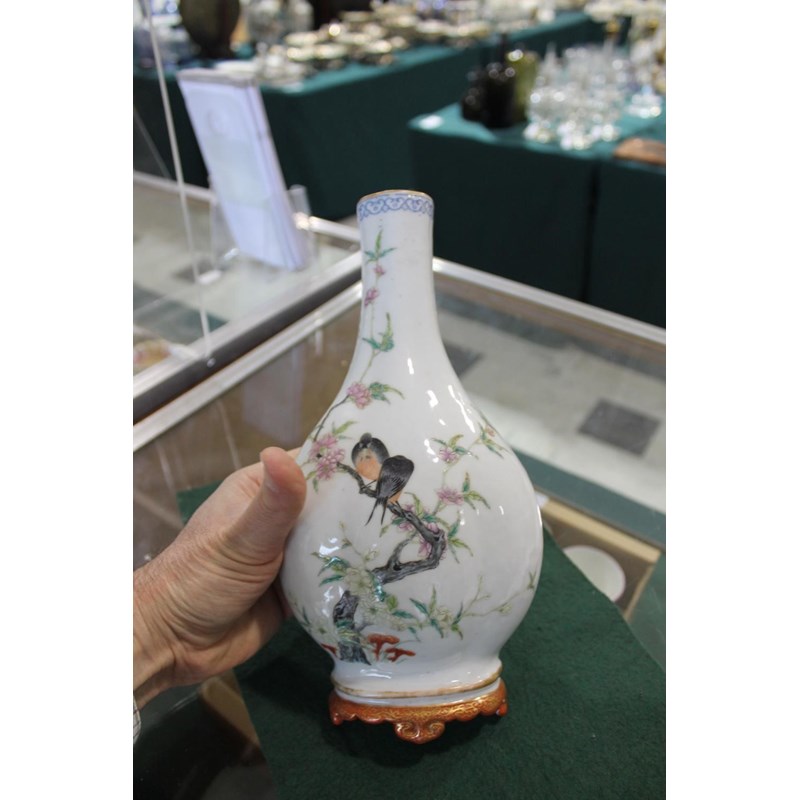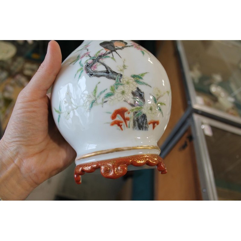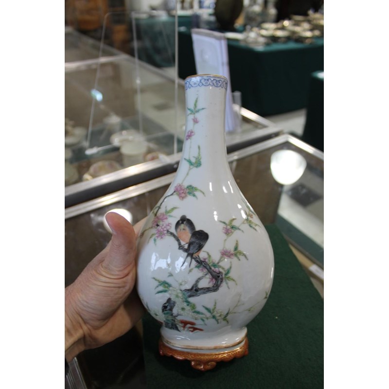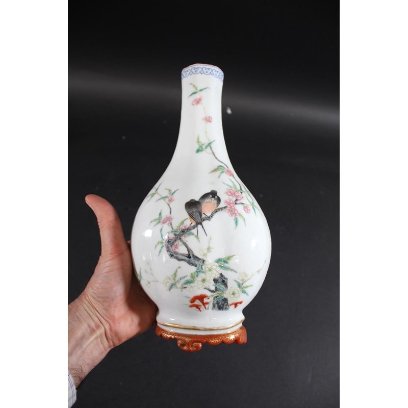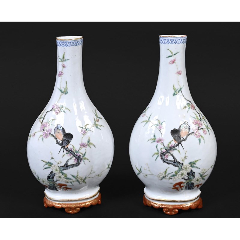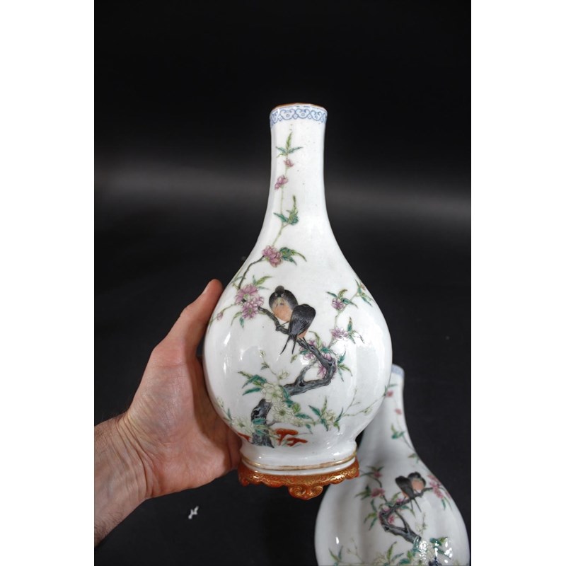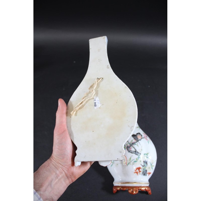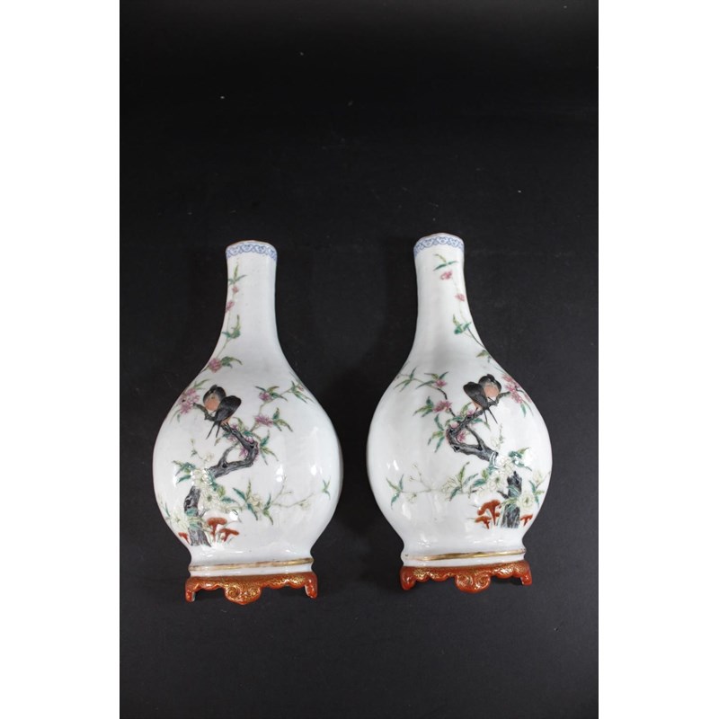 Republic period, the vase shaped wall pockets with a flat back, brightly painted with birds on flowering branches, and with a red and gilded base. Both with Qianlong marks in red.. 28cms high. (2)
