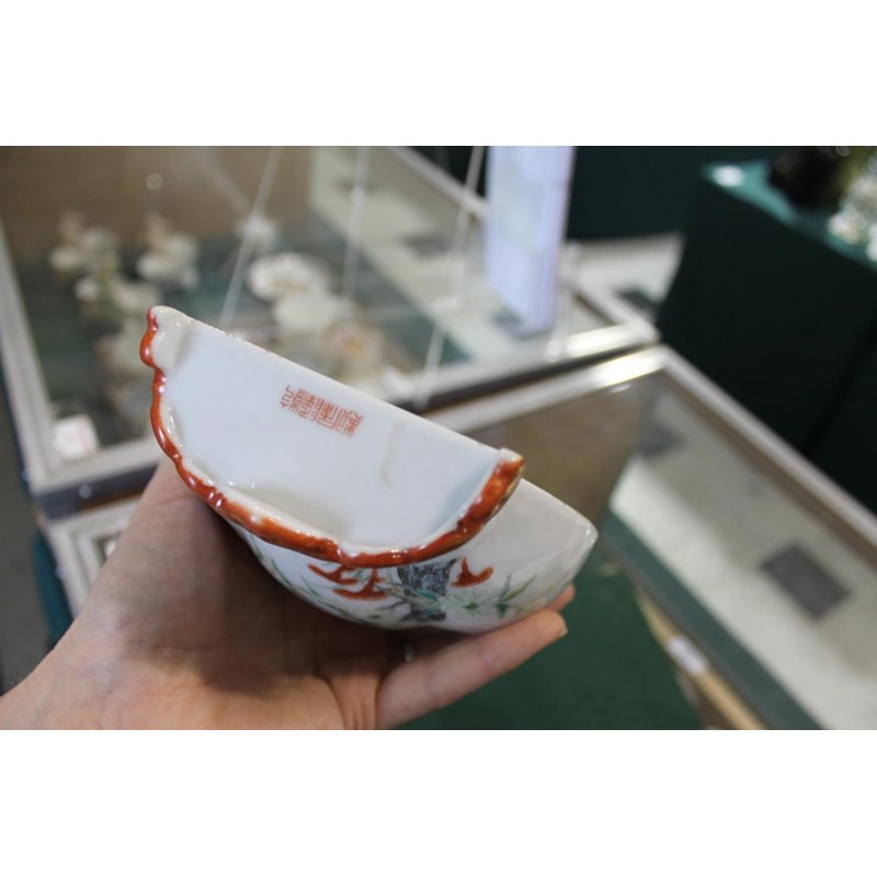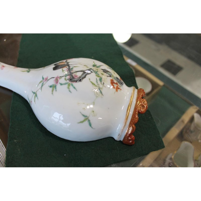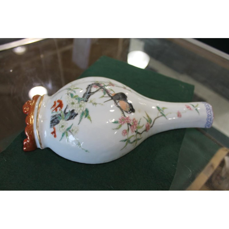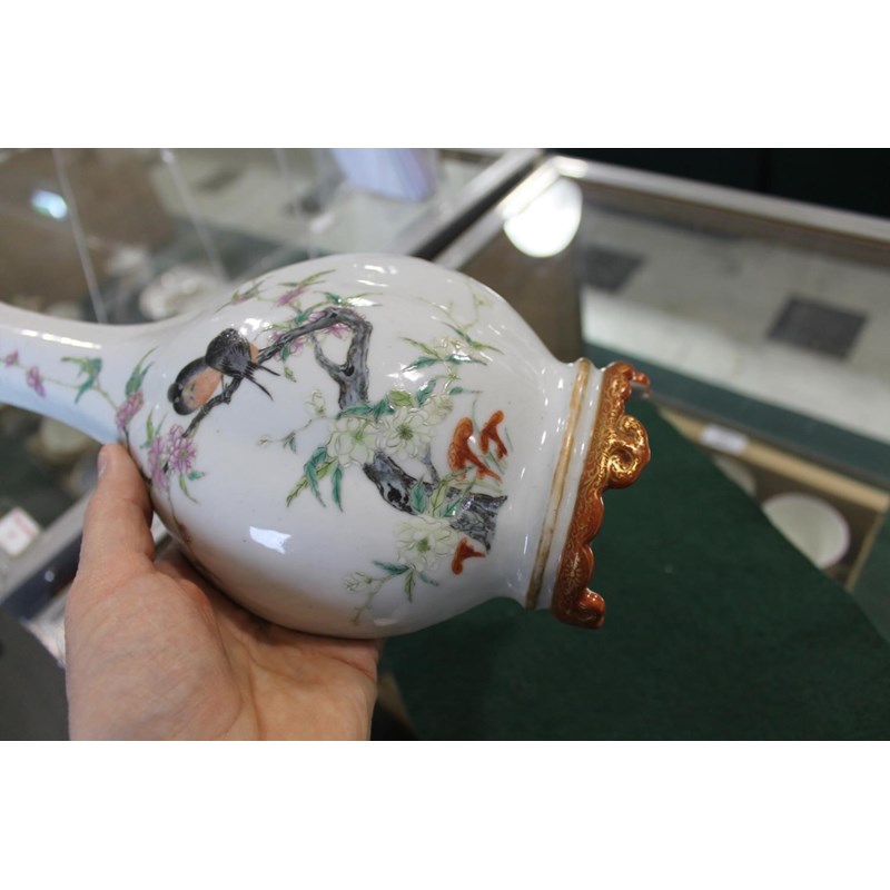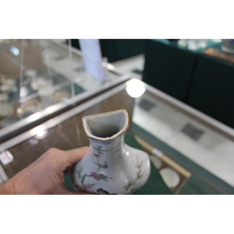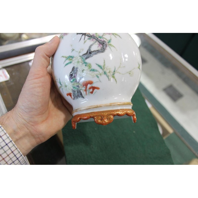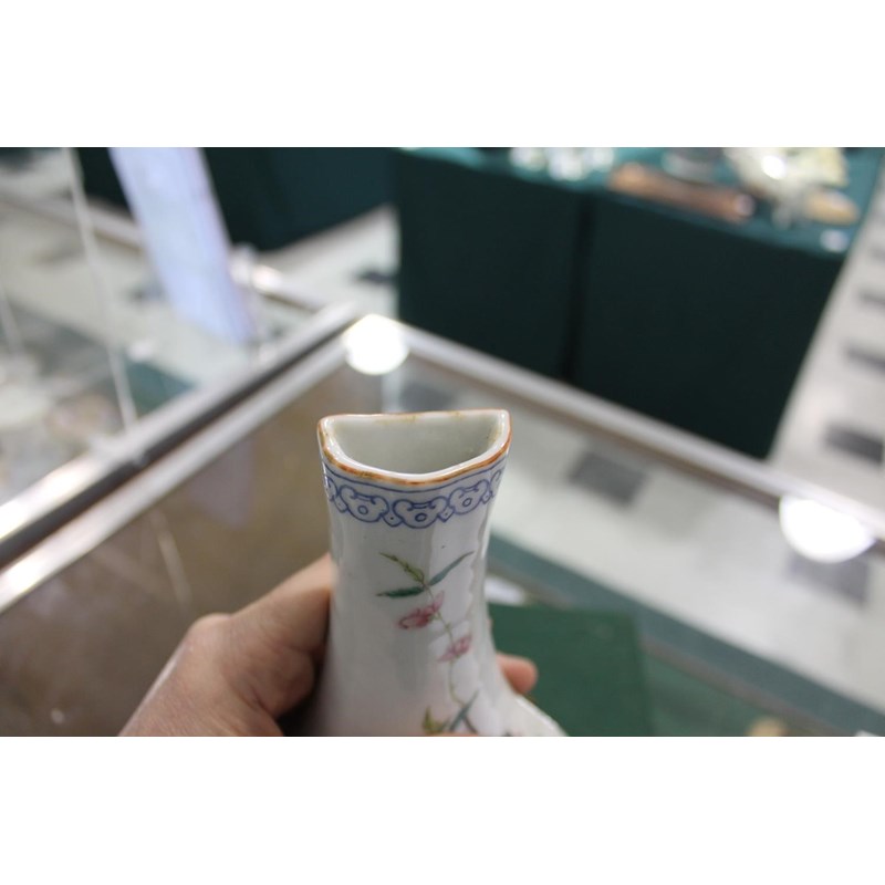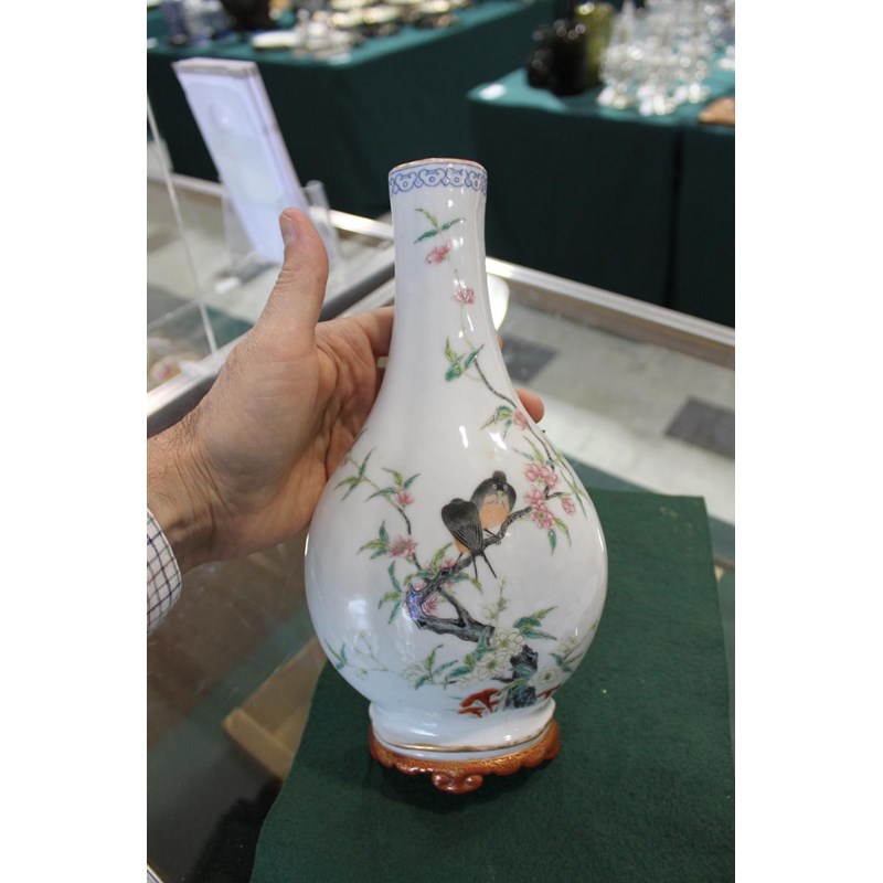 Republic period, the vase shaped wall pockets with a flat back, brightly painted with birds on flowering branches, and with a red and gilded base. Both with Qianlong marks in red.. 28cms high. (2)