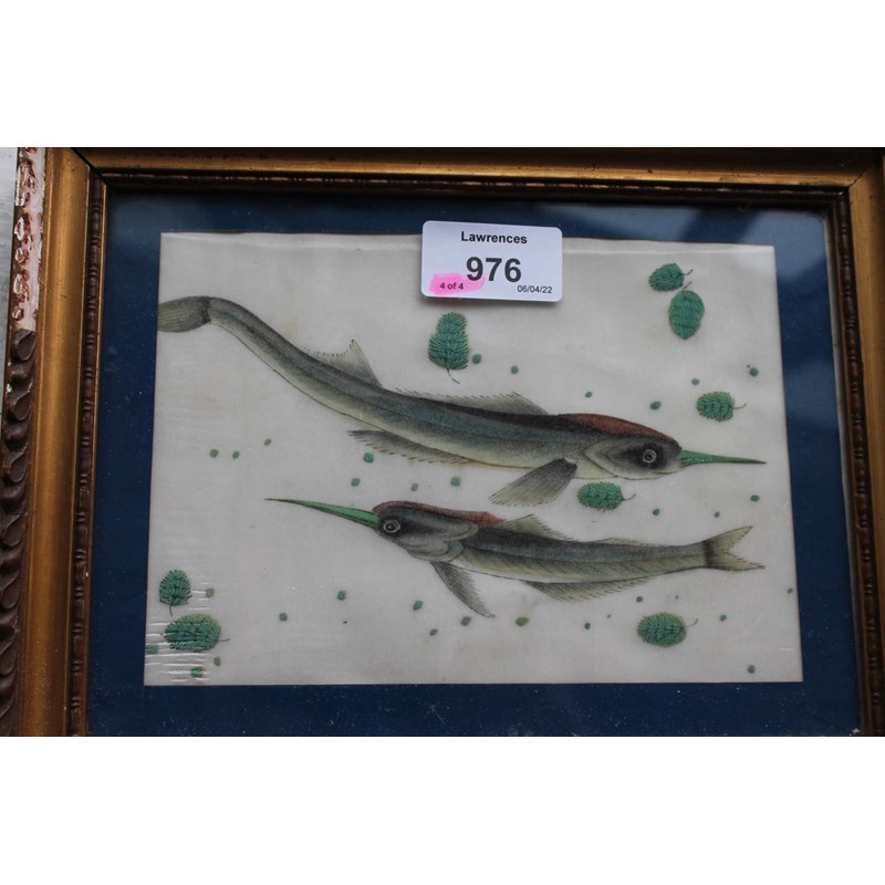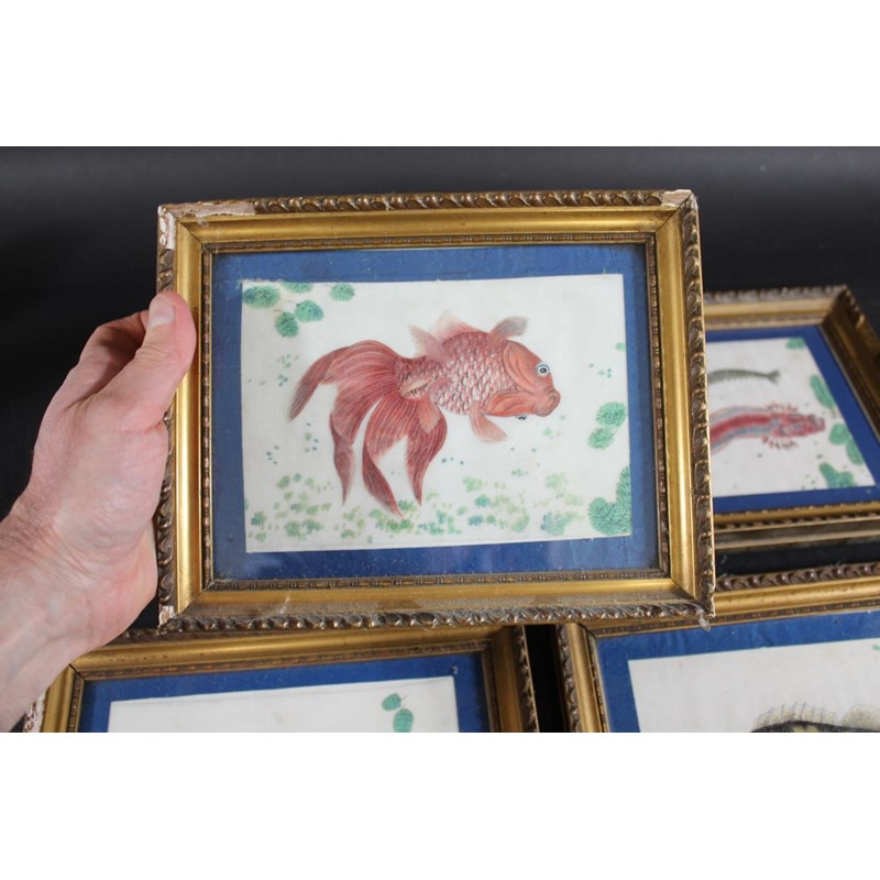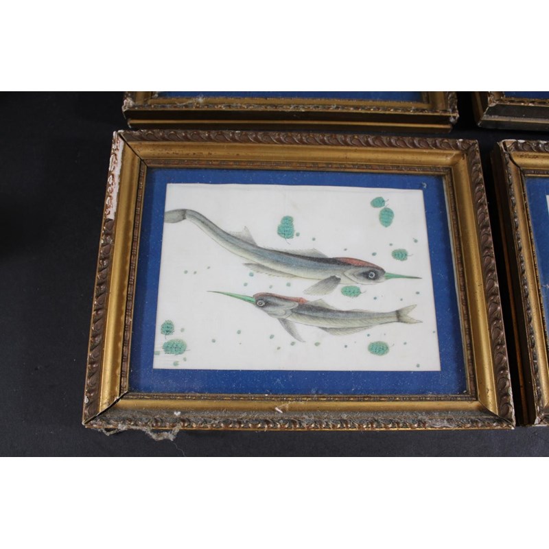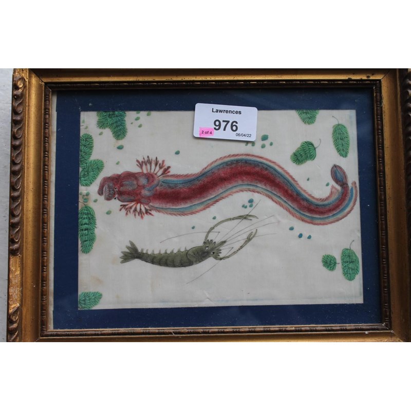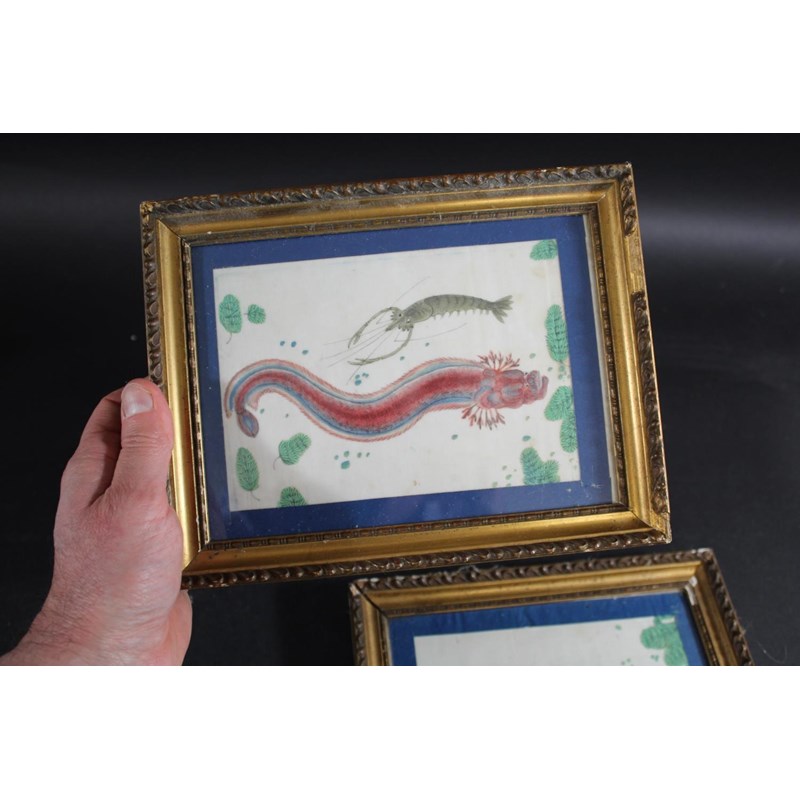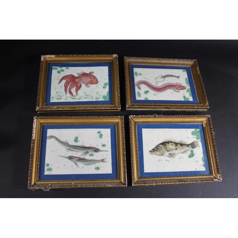 four framed pith paintings with depictions of fish and aquatic creatures. Each mounted in gilded frames, frames 23.5cms by 18cms. (4)