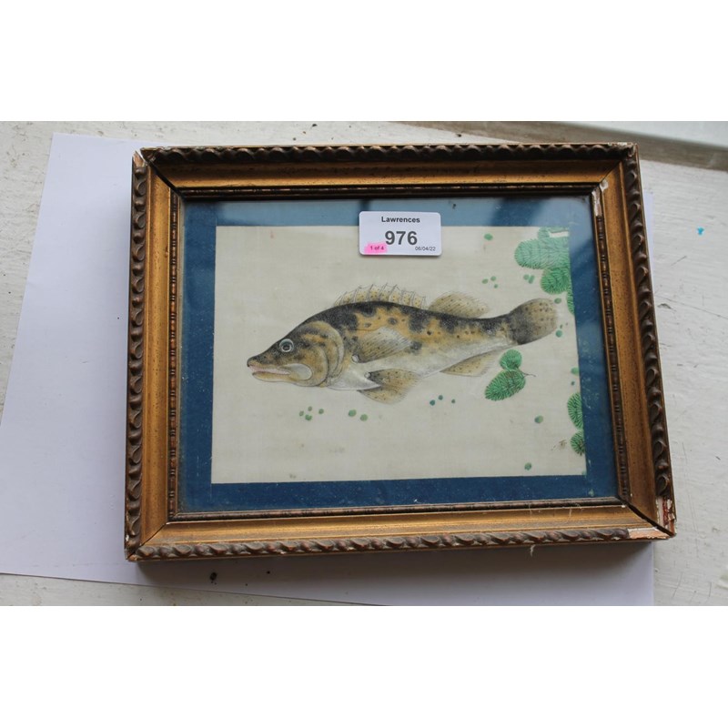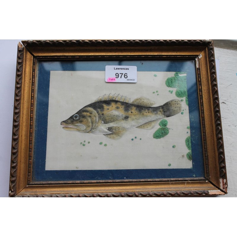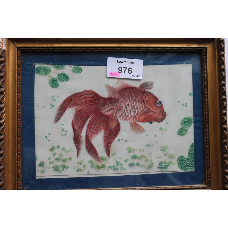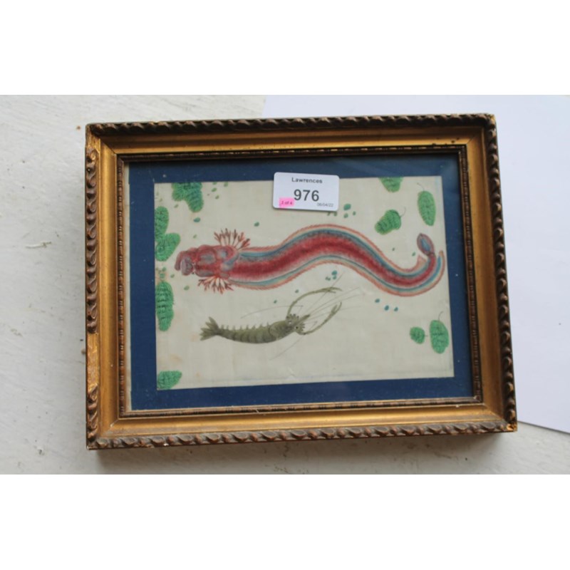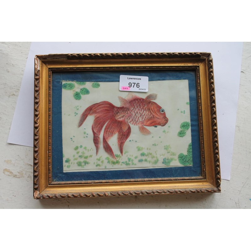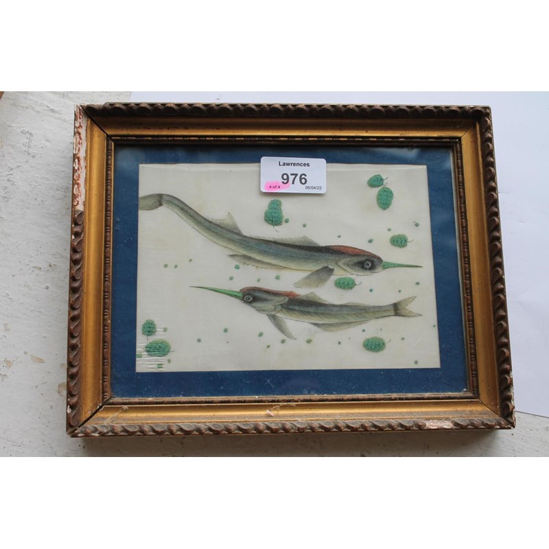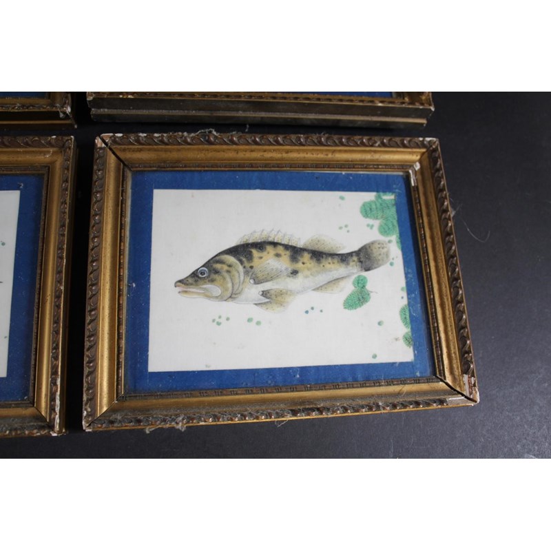 four framed pith paintings with depictions of fish and aquatic creatures. Each mounted in gilded frames, frames 23.5cms by 18cms. (4)
