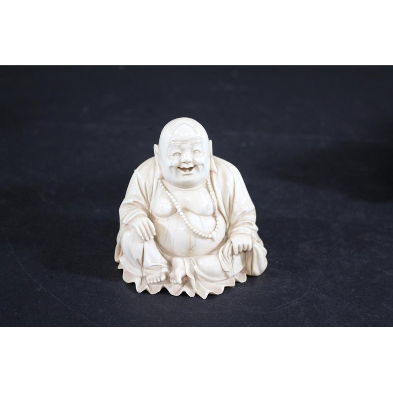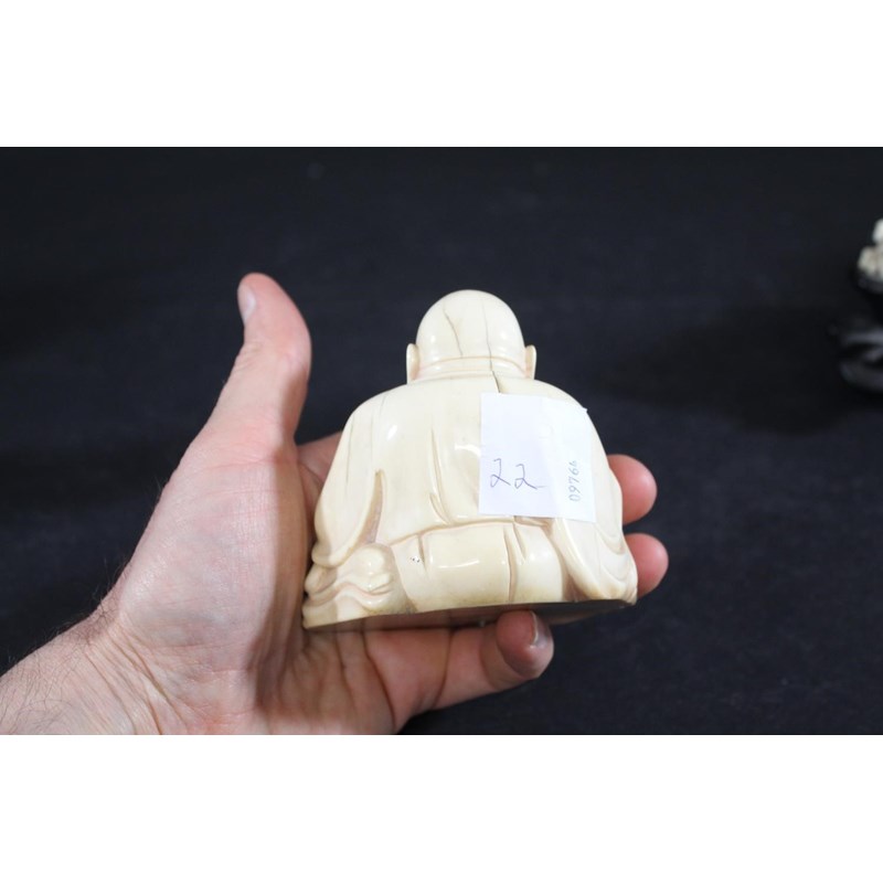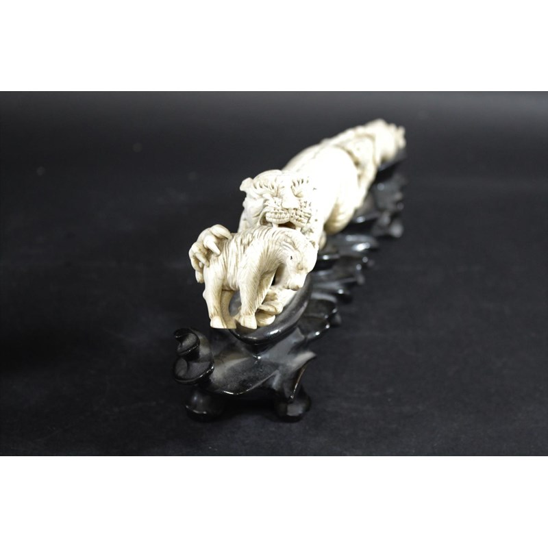 Meiji period, well carved with a large Tiger with an animal in it's mouth, with a smaller Tiger also in motion, mounted on a wooden stand, stand 31cms long. Also with a small ivory Chinese buddha, 9cms high. (2)