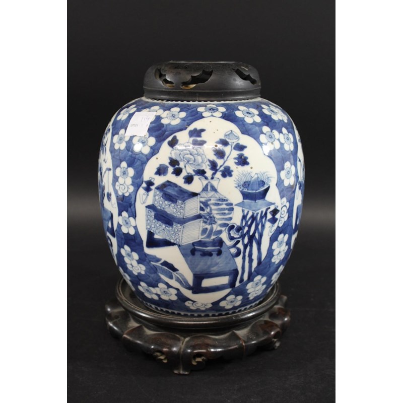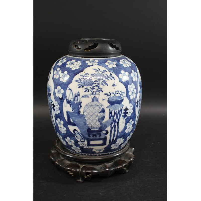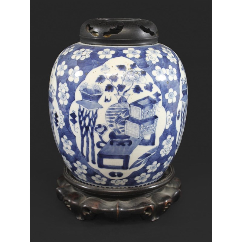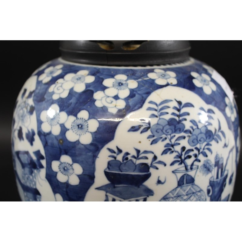 a large late 19thc jar painted with panels of flowers, vases and small pieces of furniture, surrounded by a prunus blossom ground. With a wooden lid and stand, and with a double circle mark to the base,crack to the body. 27cms high (excluding lid).
