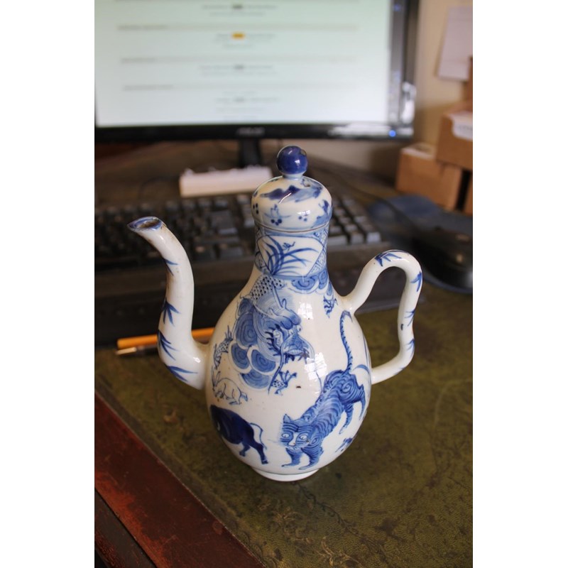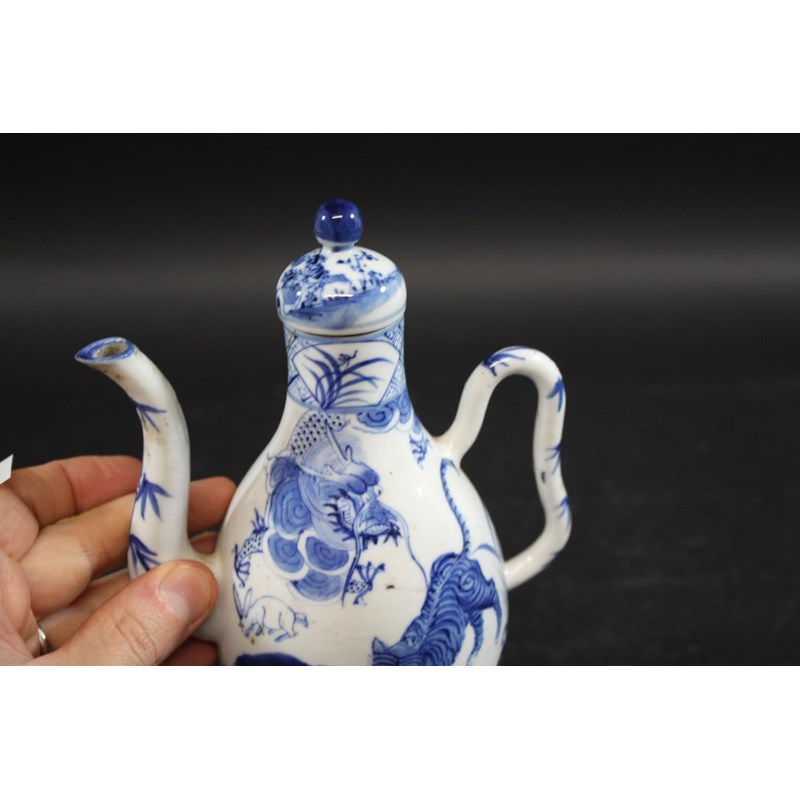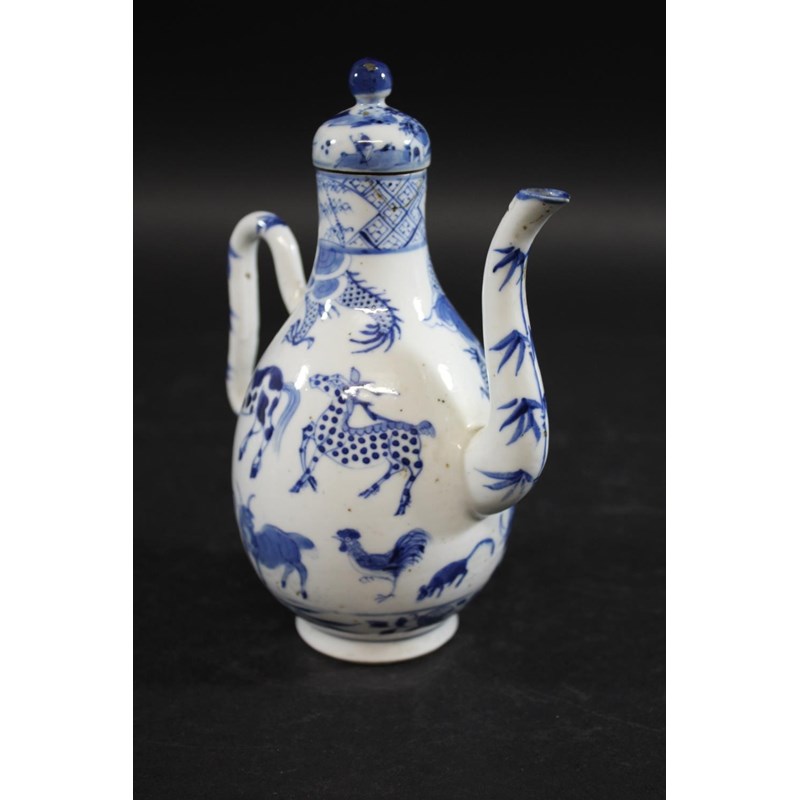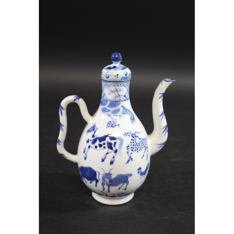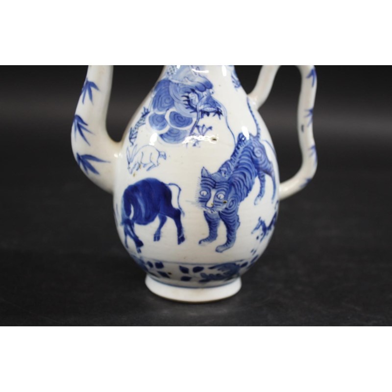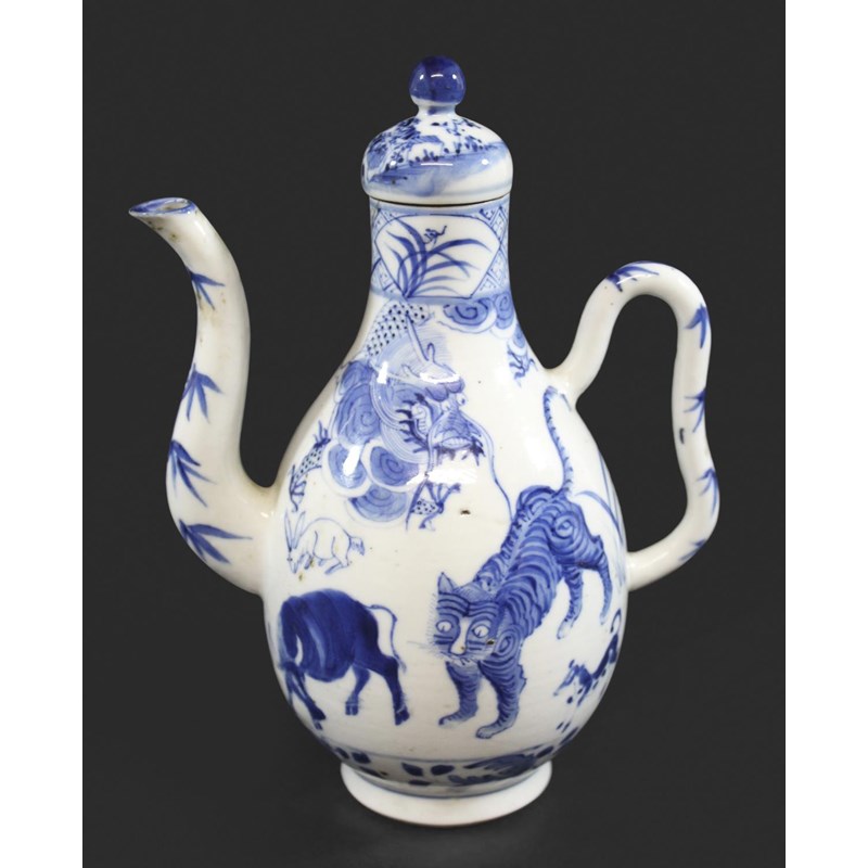 late 19thc but in the Kangxi style, painted with a variety of animals including a tiger, cow, horse, pig etc, painted with a dragon around the neck of the jug and with a domed top lid and curved handle. Small repaired section of the rim, 19cms high