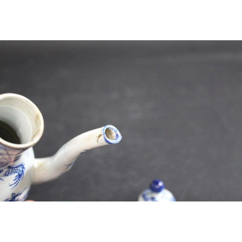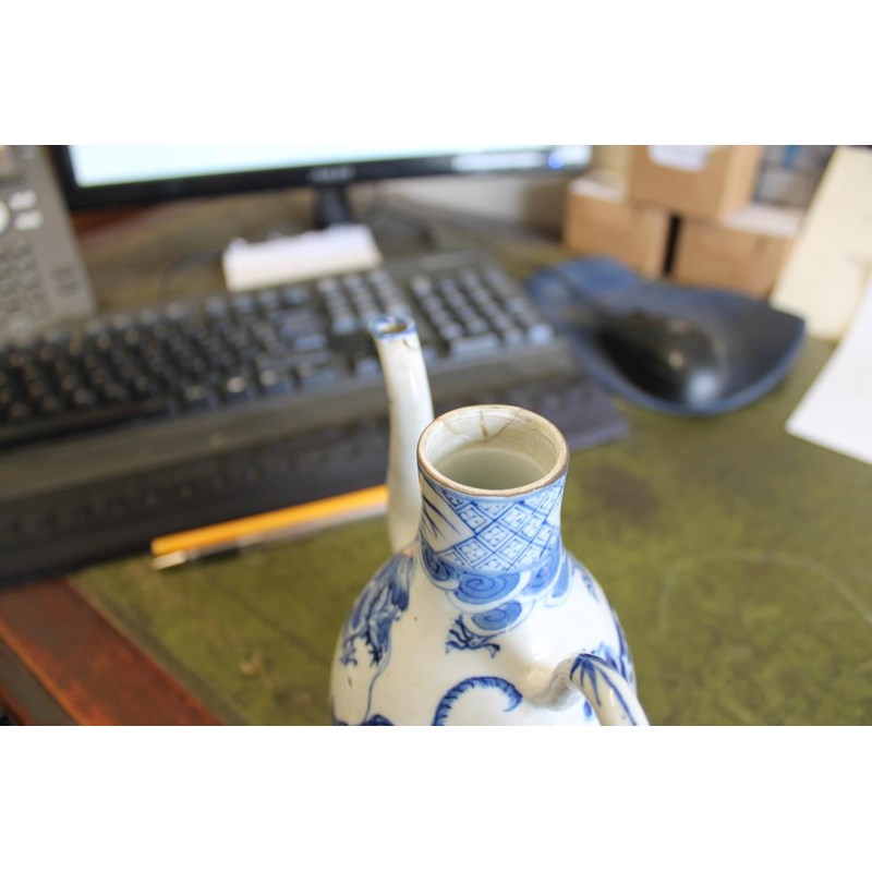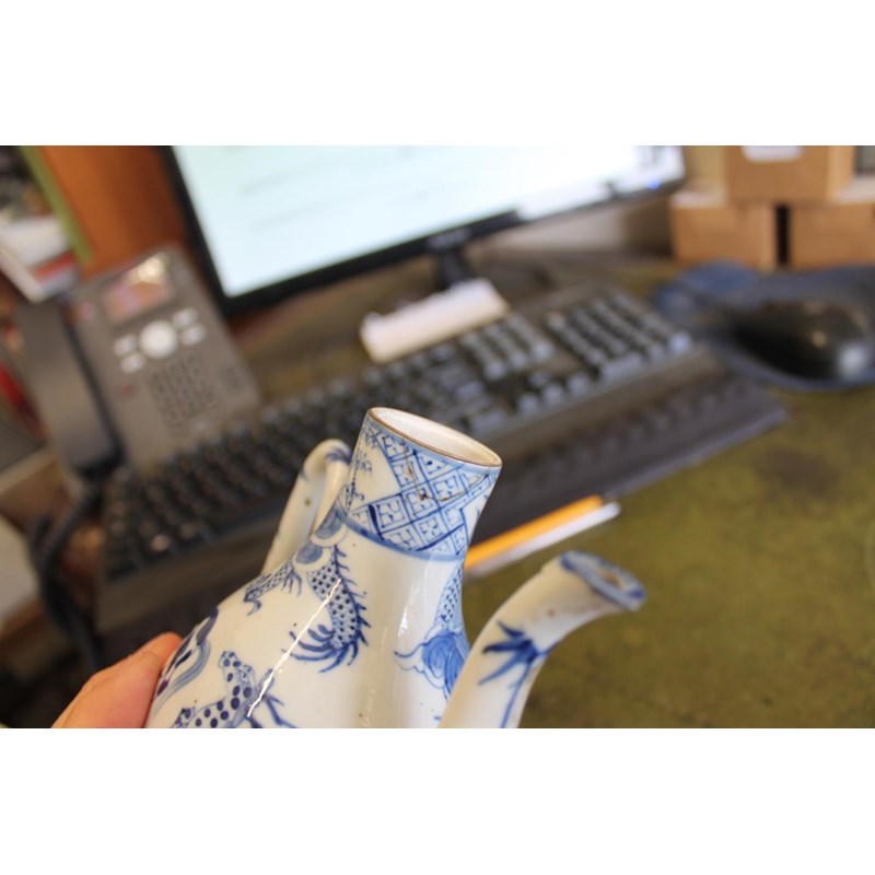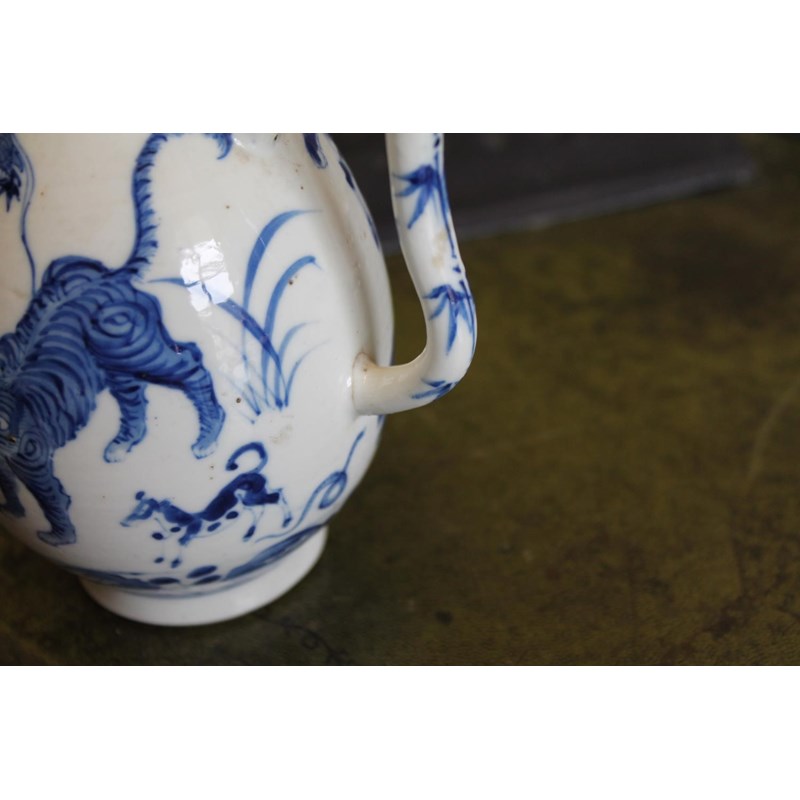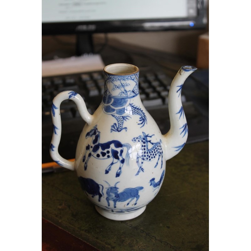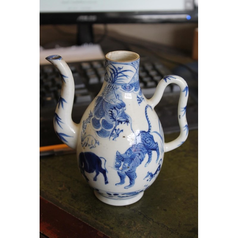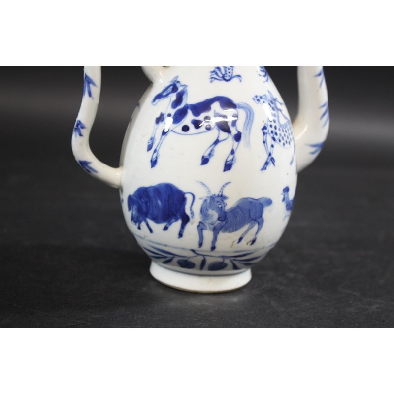 late 19thc but in the Kangxi style, painted with a variety of animals including a tiger, cow, horse, pig etc, painted with a dragon around the neck of the jug and with a domed top lid and curved handle. Small repaired section of the rim, 19cms high