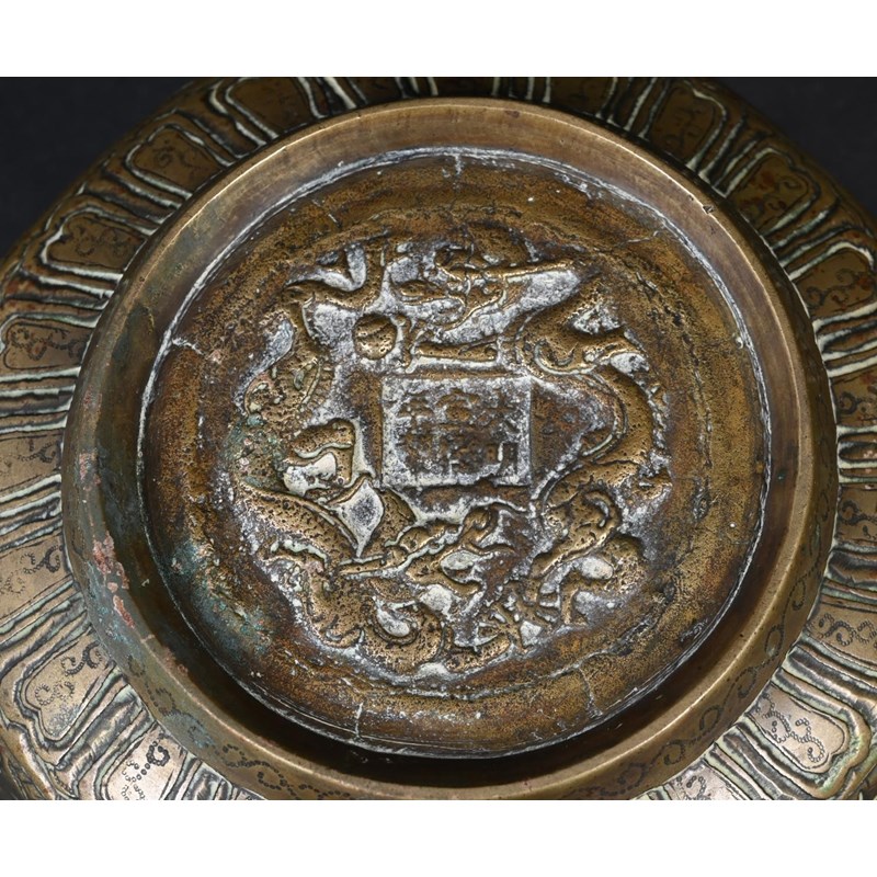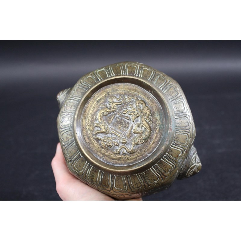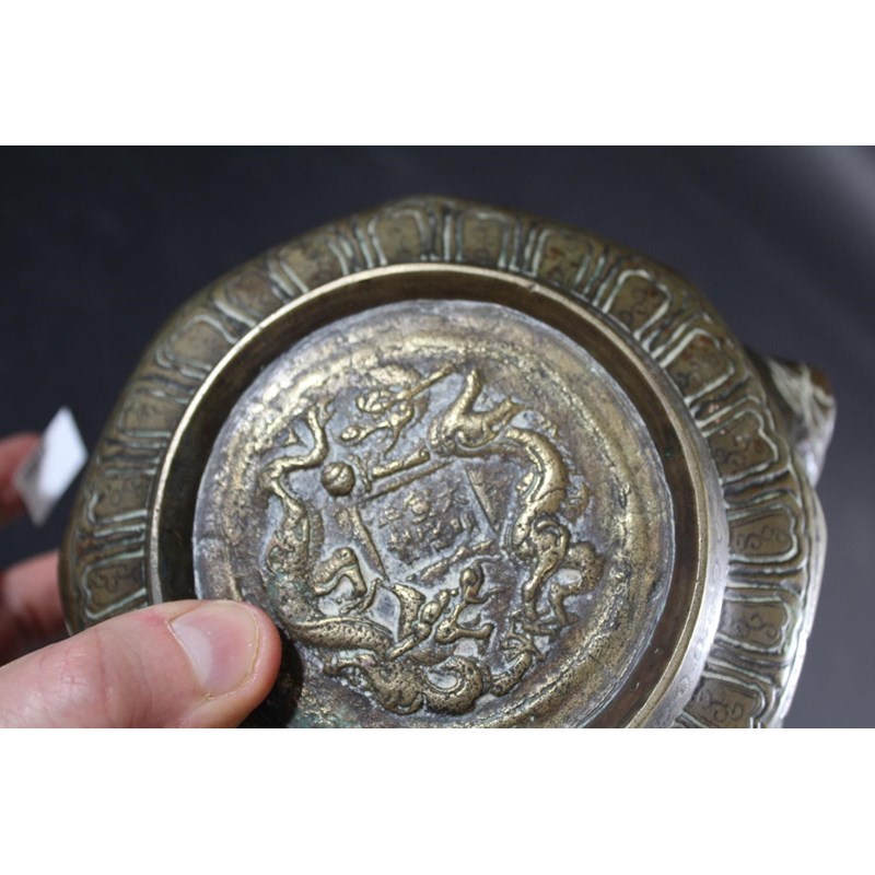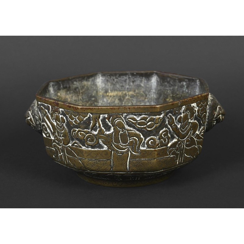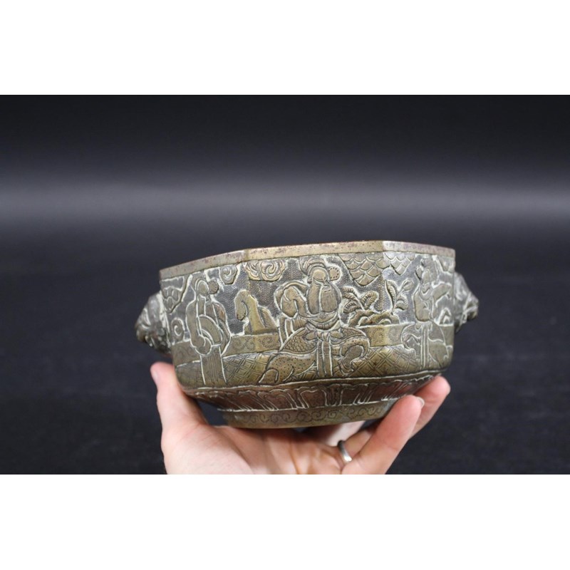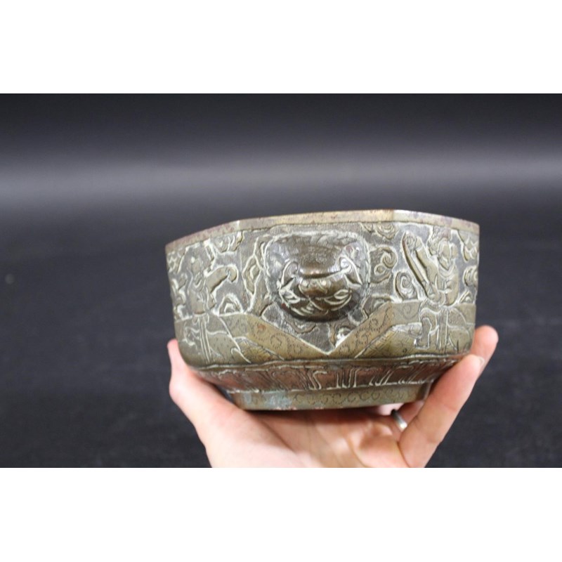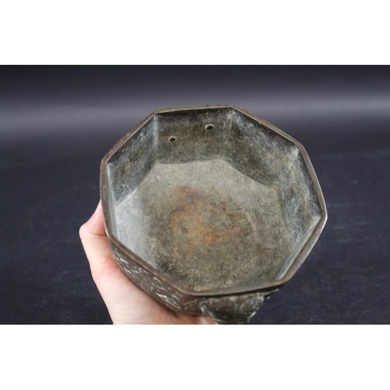 probably 18thc or 19thc, of octagonal form with mask handles, with a variety of raised figures to the body and a dragon to the base. With a seal mark, 18.5cms across including handles