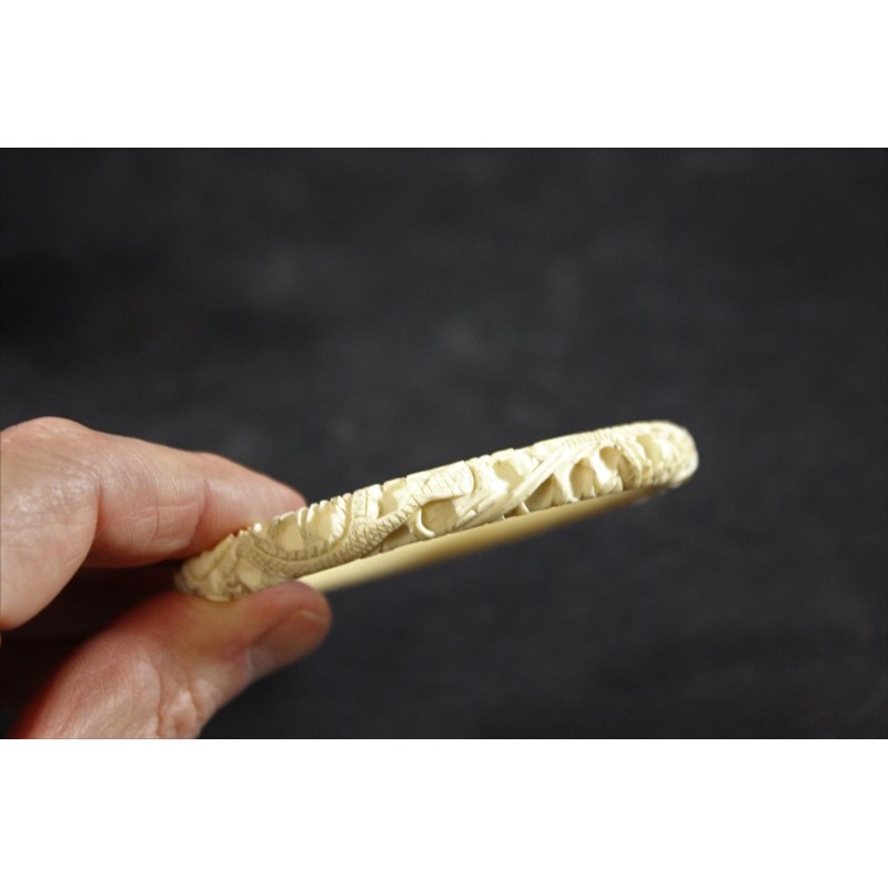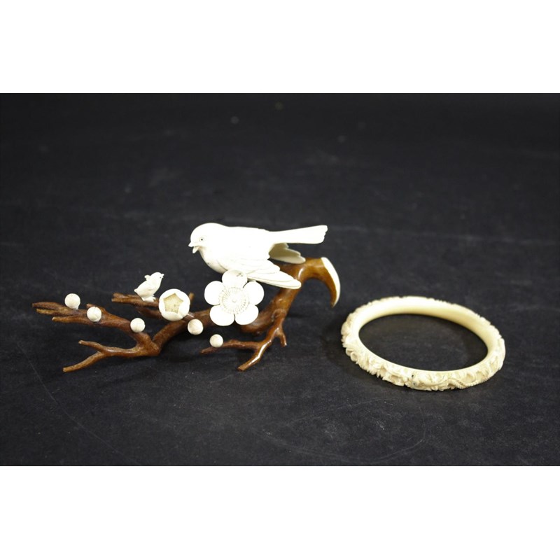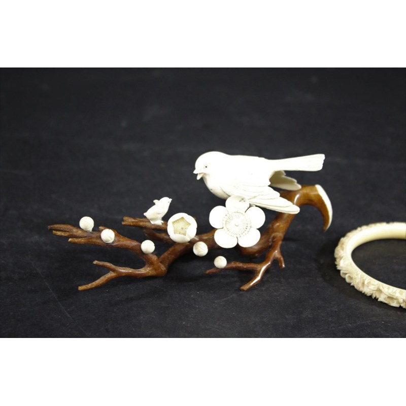 JAPANESE IVORY BIRDS Meiji period, a ivory and stained ivory group of two birds on a tree branch, with flowers and buds, 14.5cms long. Also with a Chinese carved ivory bangle, 8cms diameter. (2)