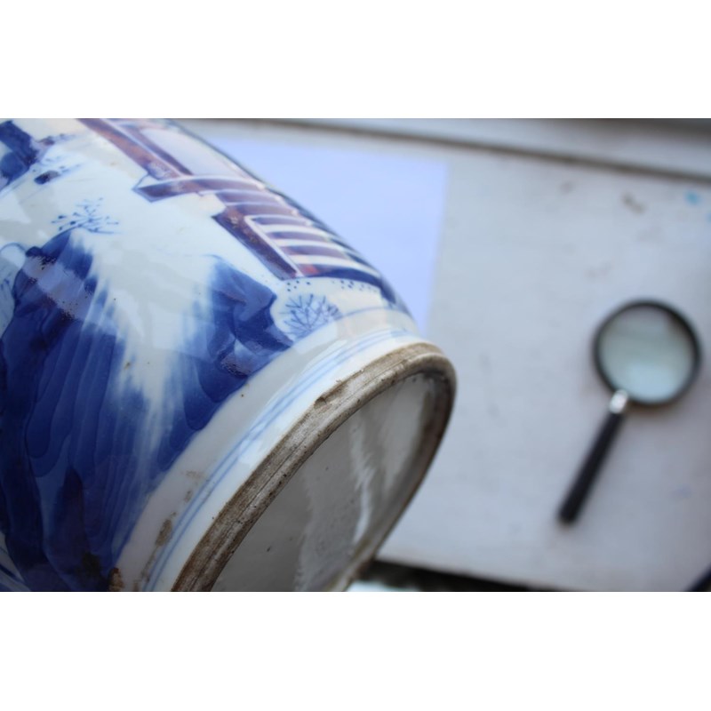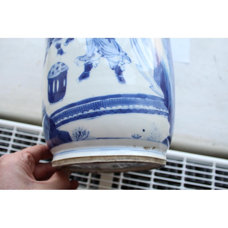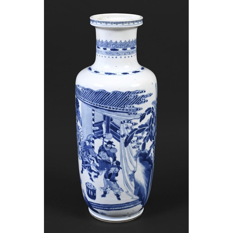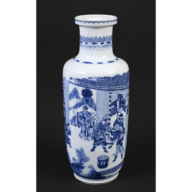 Qing Dynasty Kangxi period (1661-1722), a large vase painted with a court scene with scholar officials conversing in an interior, below with a thin band of key fret and ruyi at the neck. 47.5cms high