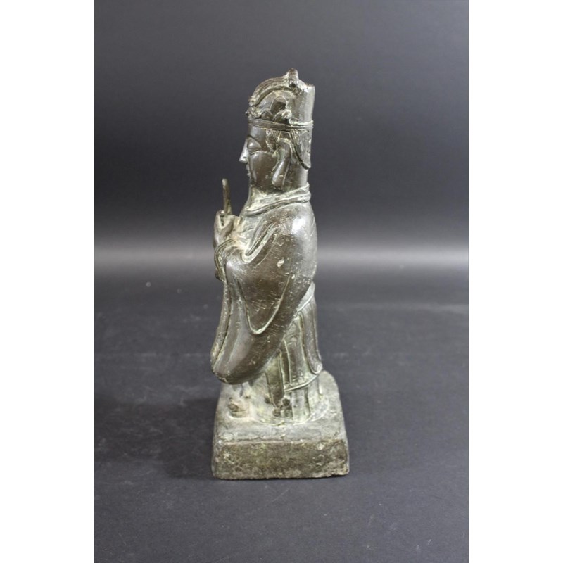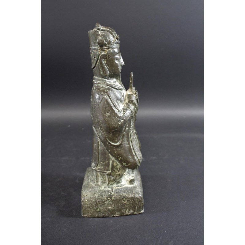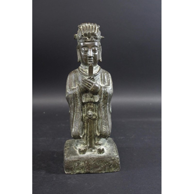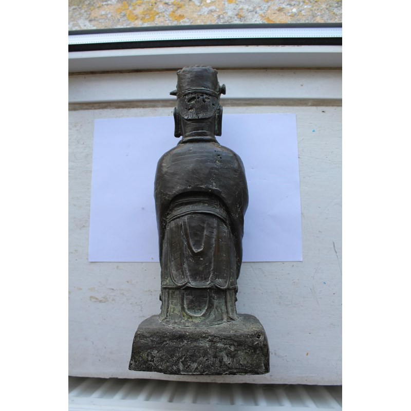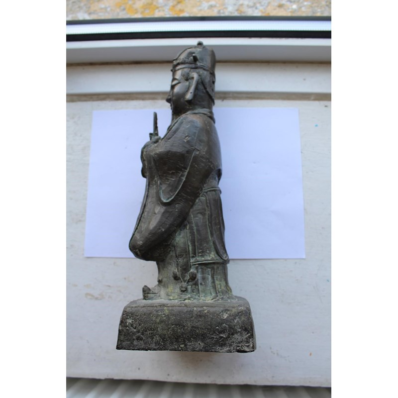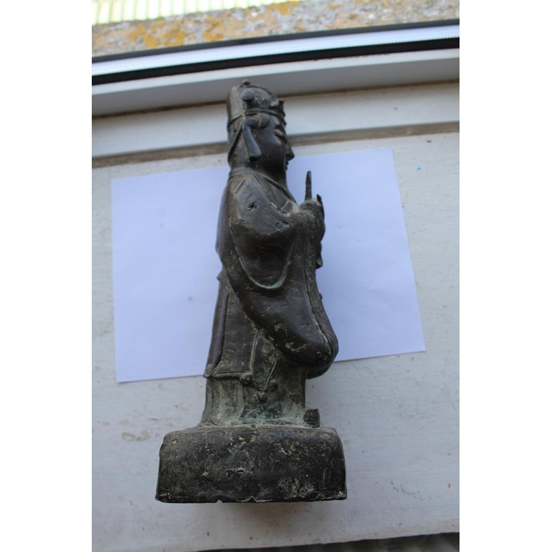 probably 17thc and late Ming Dynasty, a large bronze figure of a scholar holding a hu tablet, possibly a representation of Wen Chang patron saint of scholars. 36cms high