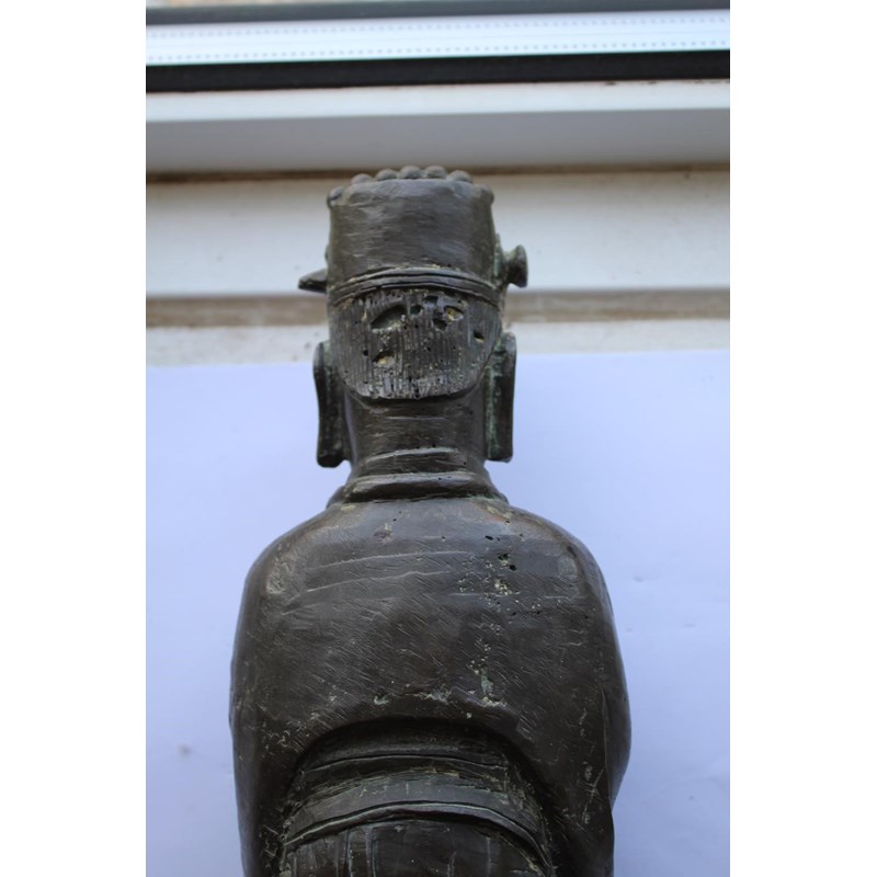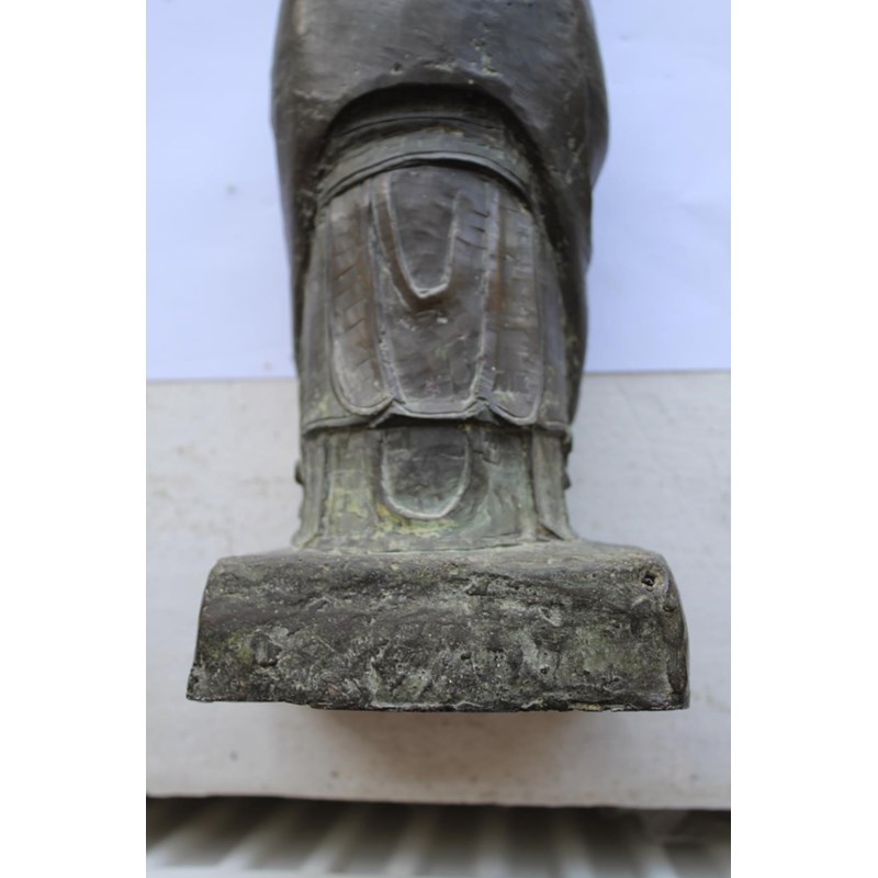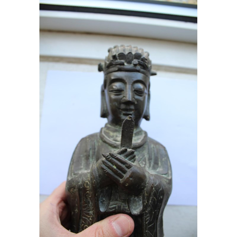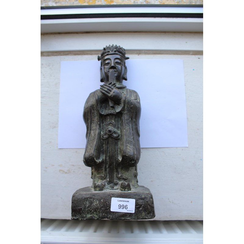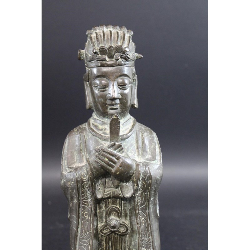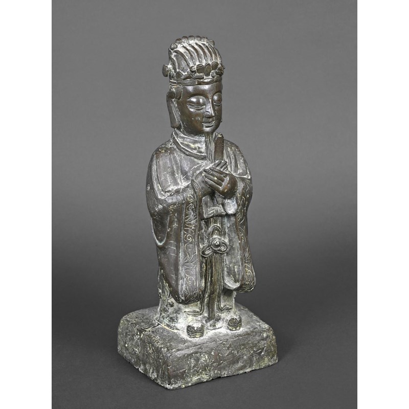 probably 17thc and late Ming Dynasty, a large bronze figure of a scholar holding a hu tablet, possibly a representation of Wen Chang patron saint of scholars. 36cms high