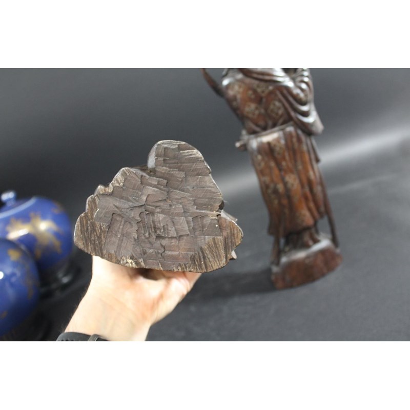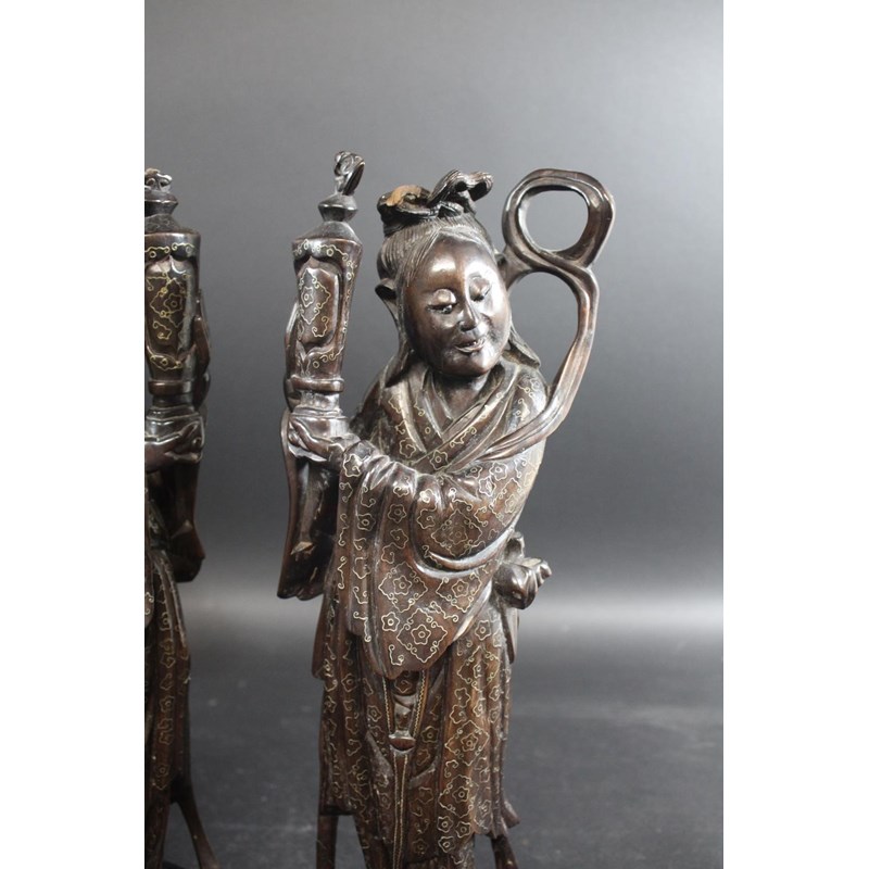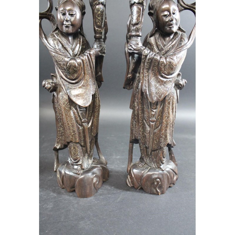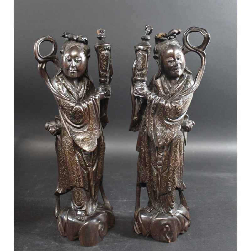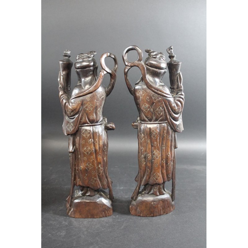 PAIR OF CHINESE CARVED WOODEN FIGURES late 19thc, a pair of carved hardwood figures with silver inlaid decoration. 41cms high. (2)