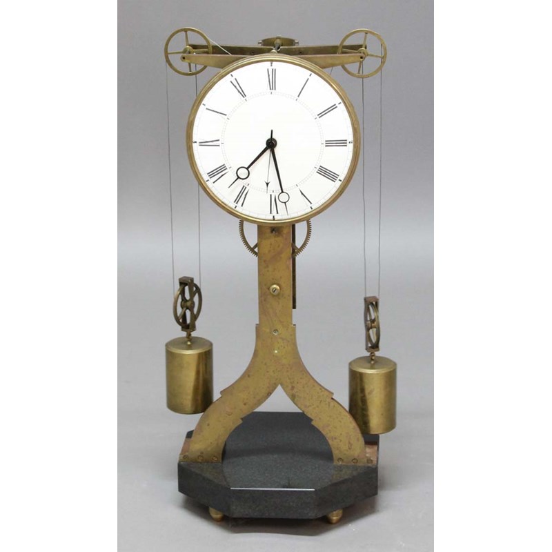 the double weighted pulley movement with calliper type dead beat escapement from a large pinwheel and fine beat adjustment to the crutch, the enamelled 10 inch dial with centre seconds sweep hand and Roman numerals, the bronze frame set on an octagonal base with adjustable feet, height 73cm
