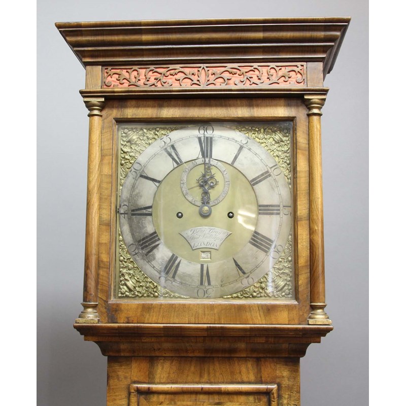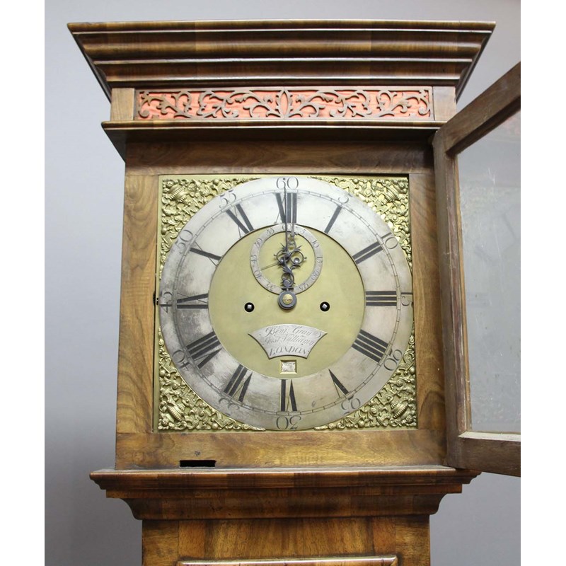 the brass dial with 11 1/2" silvered dial, subsidiary seconds dial and date aperture and a silvered plaque inscribed Benj Gray Just Vulliamy, on a four pillar, eight day movement hourly striking to a bell, the hood with silk backed fretwork panel and 3/4 columns, the trunk with cross and feather banding above a plinth base, with weights and pendulum, height 218cm