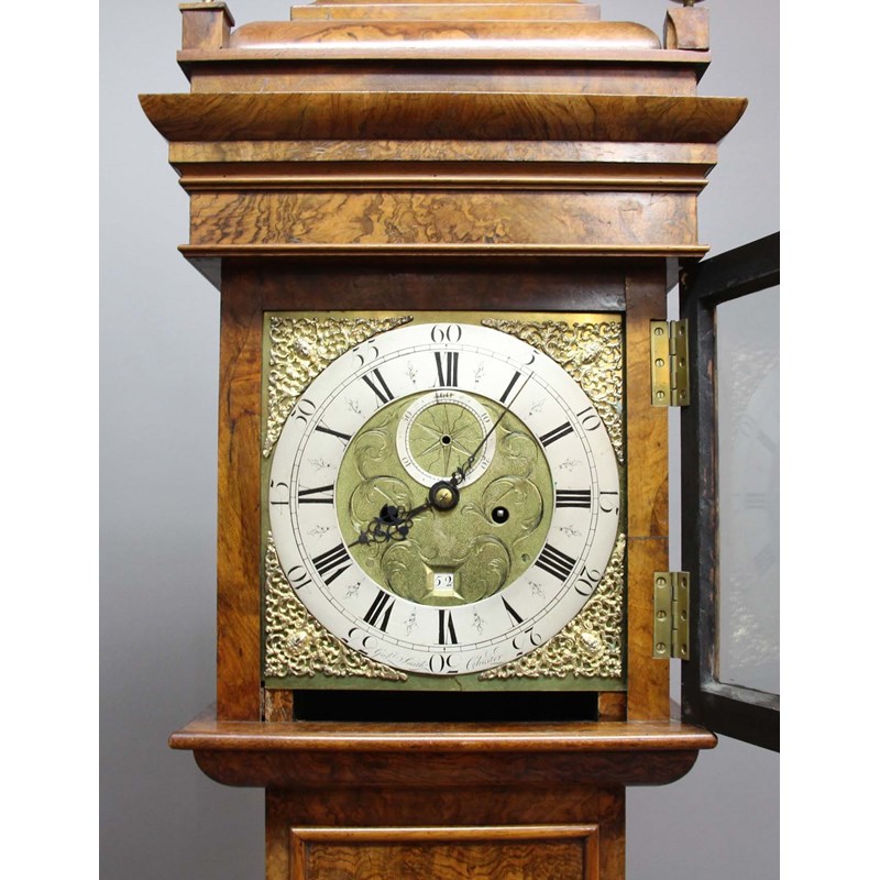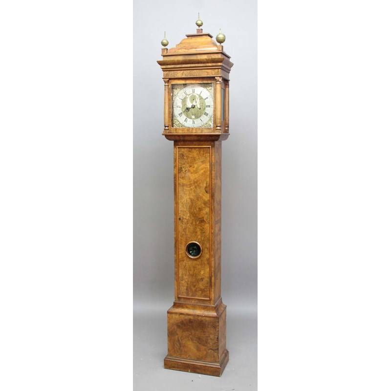 the brass dial with a 10 1/4" silvered chapter ring, subsidiary seconds dial and date aperture, inscribed Gab. Smith, Chester, on a replacement brass, four pillar movement, the caddy top above a square glazed door flanked by columns, the trunk with a rectangular door and circular lenticle, height including orbs 235cm