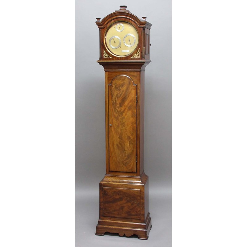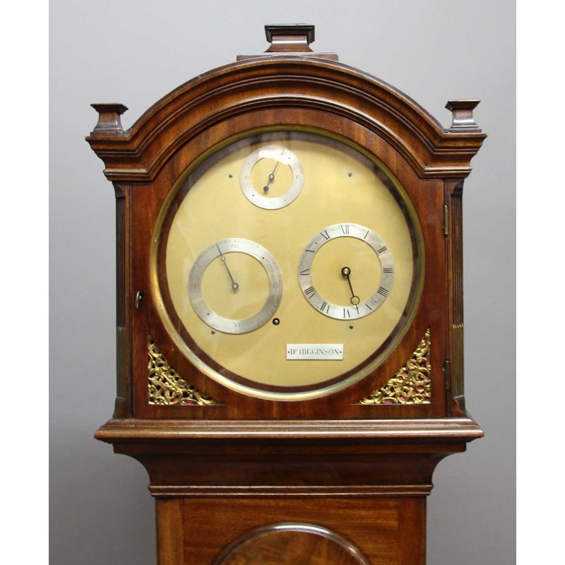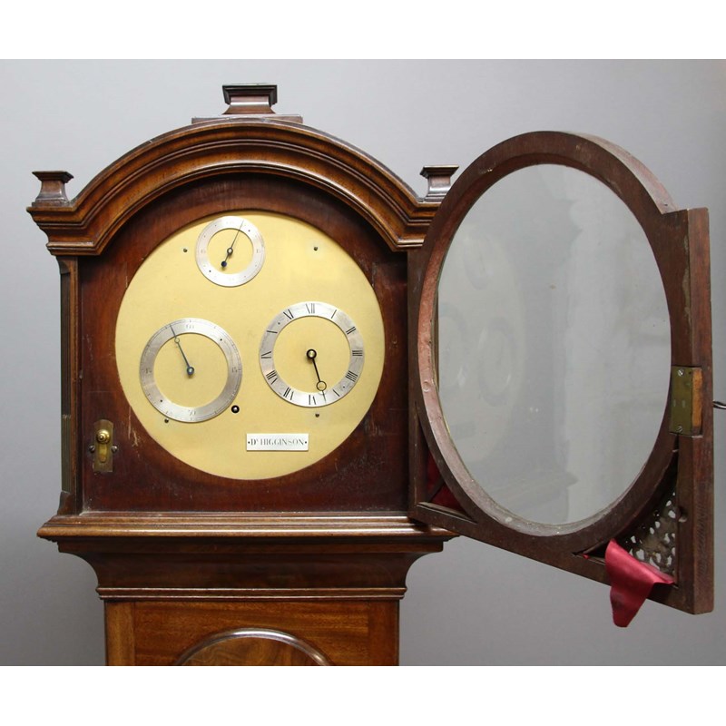 the 10 1/2" dial with three silvered rings for hours, minutes and seconds and inscribed Dk Higginson, on a brass, four pillar movement, the case with domed hood and gilt spandrils, the trunk with domed trunk door, with weight and pendulum, height 198cm