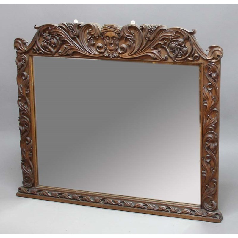 CARVED OAK OVERMANTEL MIRROR, 19th century, the rectangular plate surmounted by a mask and scrolling, flowering foliage, height 120cm, width 140cm