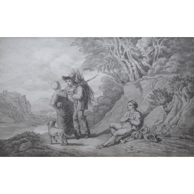 TRAVELLERS BY A RIVER IN A ROCKY LANDSCAPE