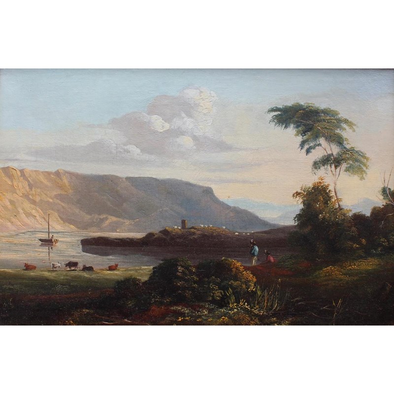 FIGURES AND CATTLE BY AN ESTUARY IN A MOUNTAINOUS LANDSCAPE