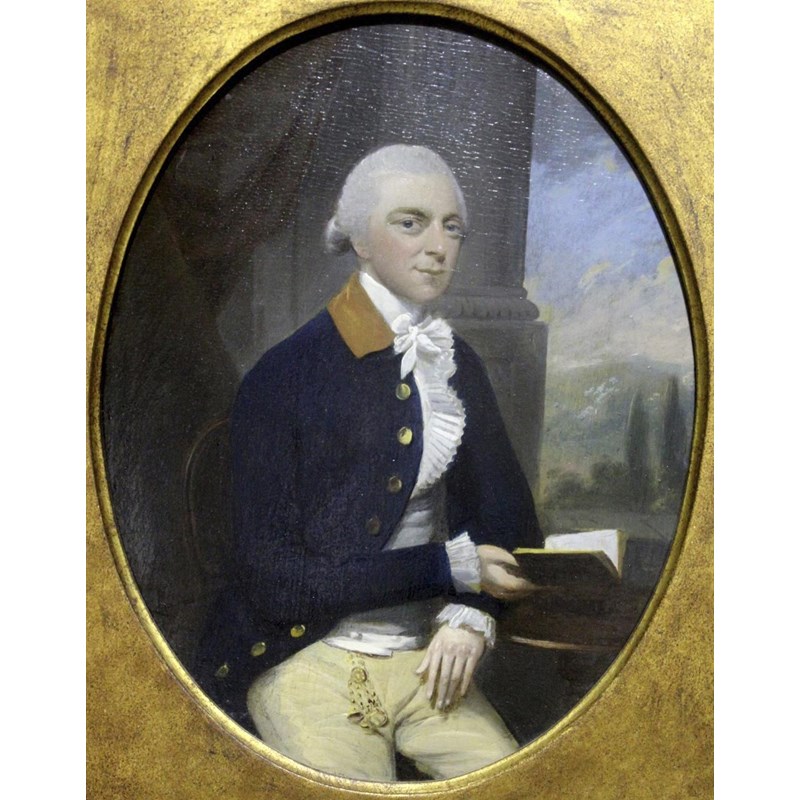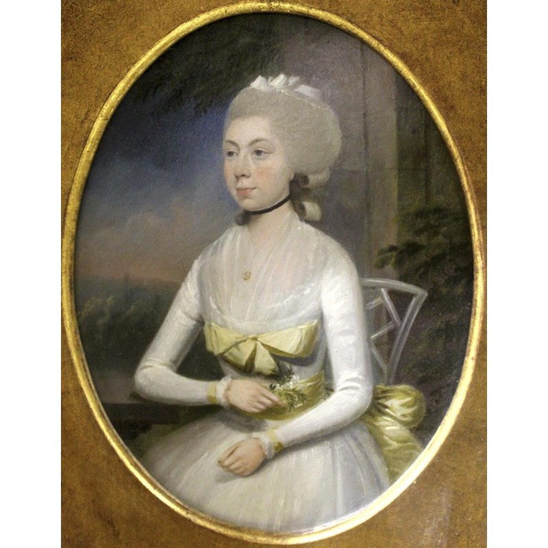 A near pair, each seated long half length, she wearing a white dress with a yellow sash, he wearing a blue coat, mustard breeches and holding a book, oil on panel, oval