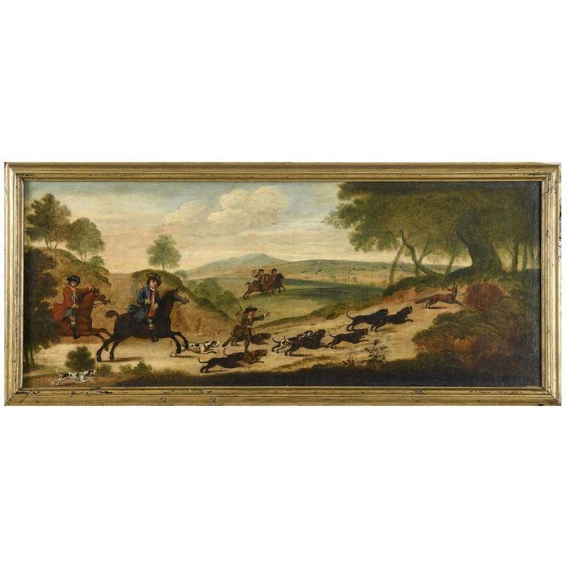ENGLISH PROVINCIAL SCHOOL, 18th CENTURY FOXHUNTING Oil on canvas 57.5 x 139.5cm.