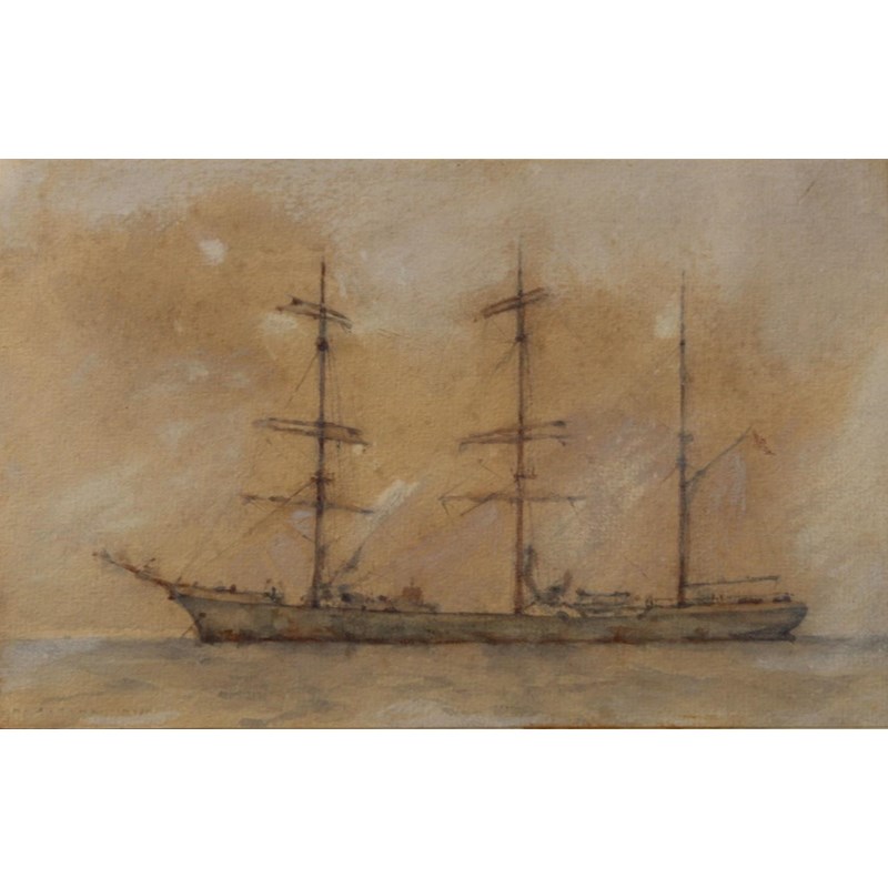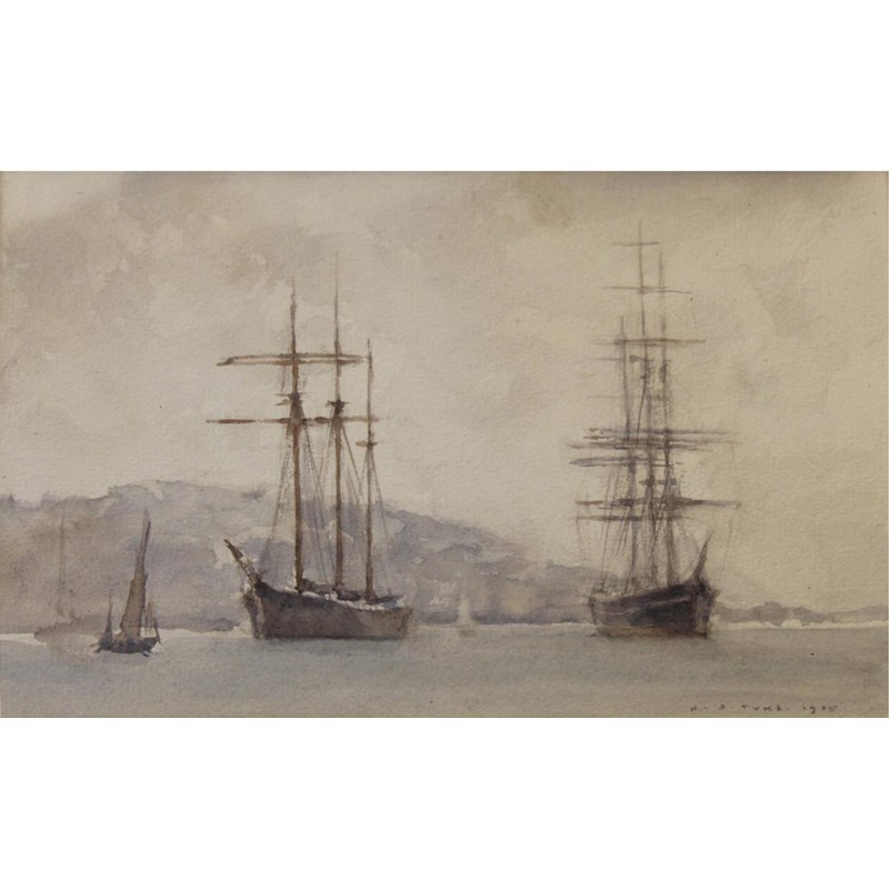 HENRY SCOTT TUKE, RA, RWS (1858-1929) WINDJAMMERS LYING IN THE CARRICK ROADS, FALMOUTH, AWAITING ORDERS Signed and dated 1925, watercolour and pencil 13 x 20.5cm.; with another by the same hand, of Cutty Sark, signed and indistinctly dated, 13.5 x 21cm. (2) Provenance: The former item a wedding gift to the vendor's ancestors, Mr and Mrs J V Ratcliffe, 1925 (with separate note reading With all good wishes/ from H. S. Tuke/ Sept 14.1925)