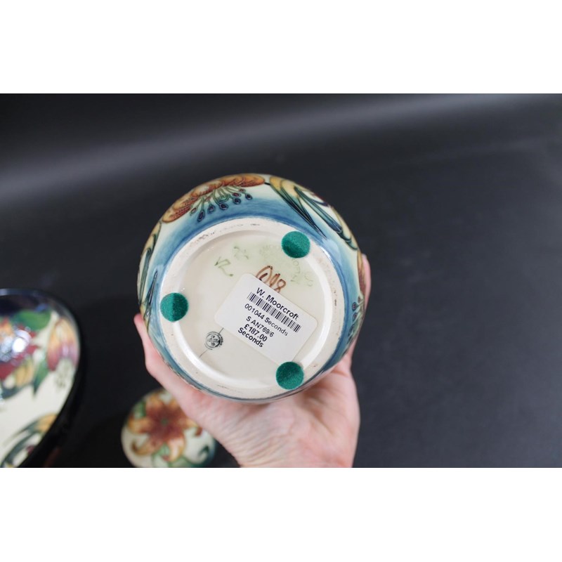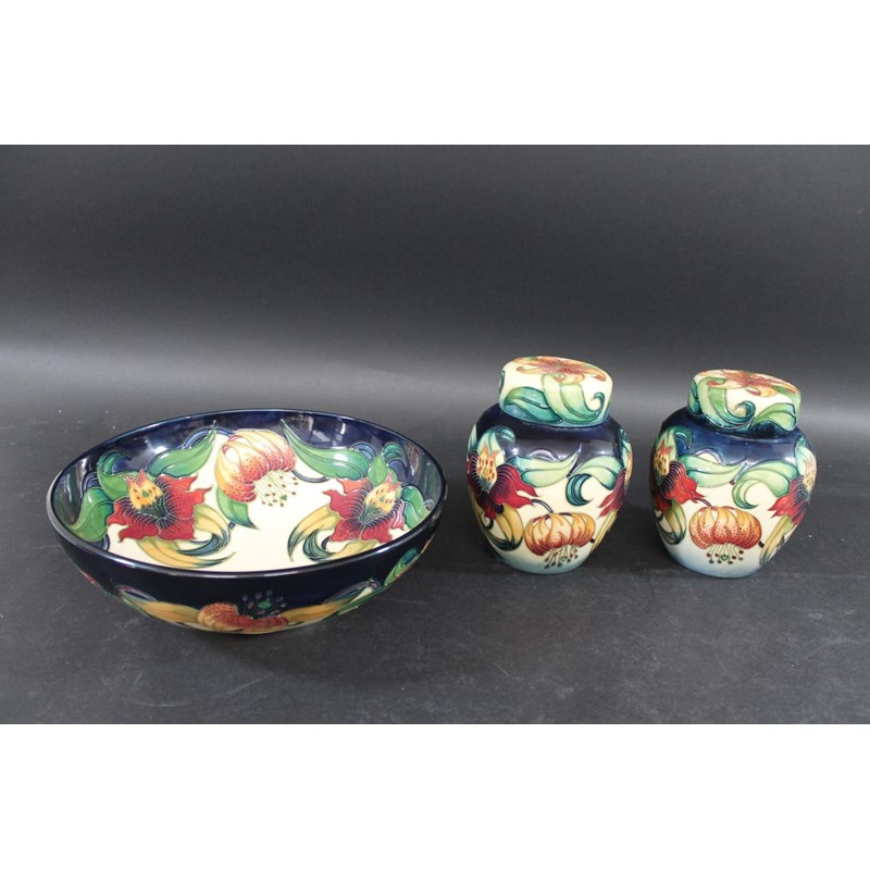 a large bowl in the Tiger Lily design, dated 98, second quality with red dot (25cms diameter). Also with a pair of lidded ginger jars in the same design, dated 98, also second quality (16cms high). (3)