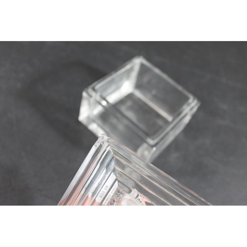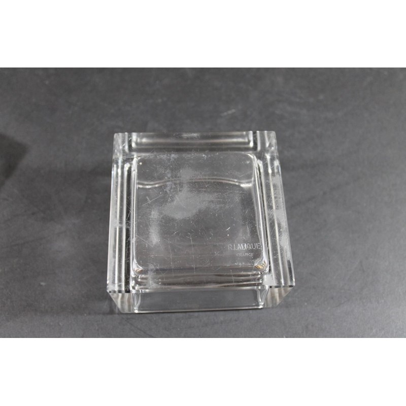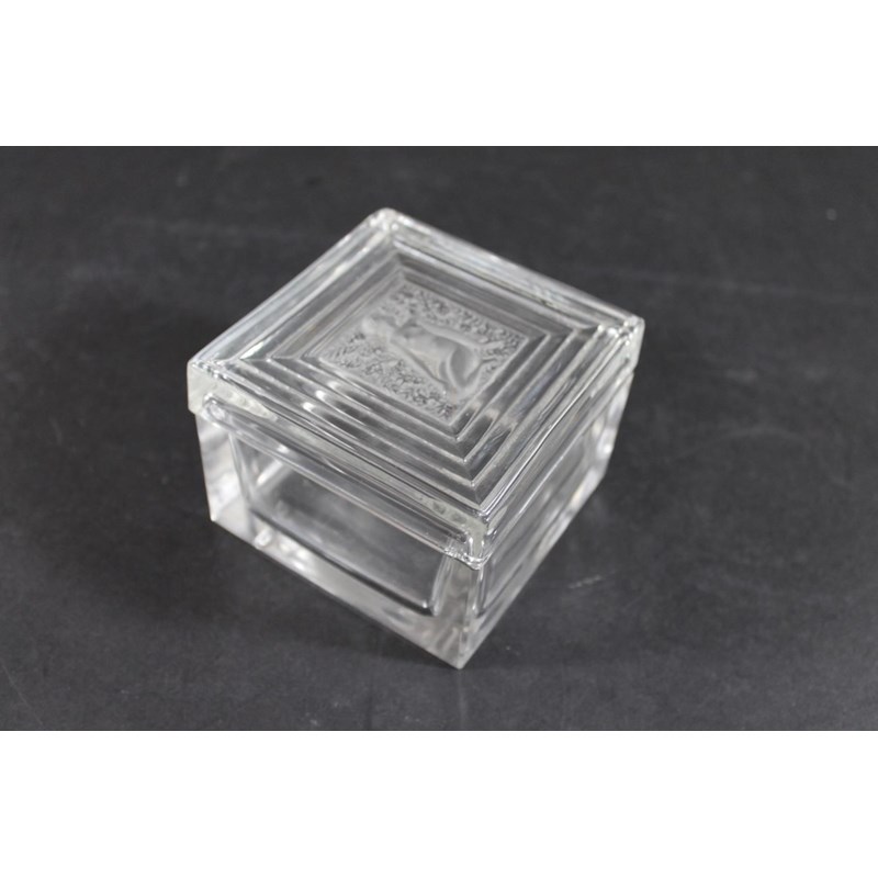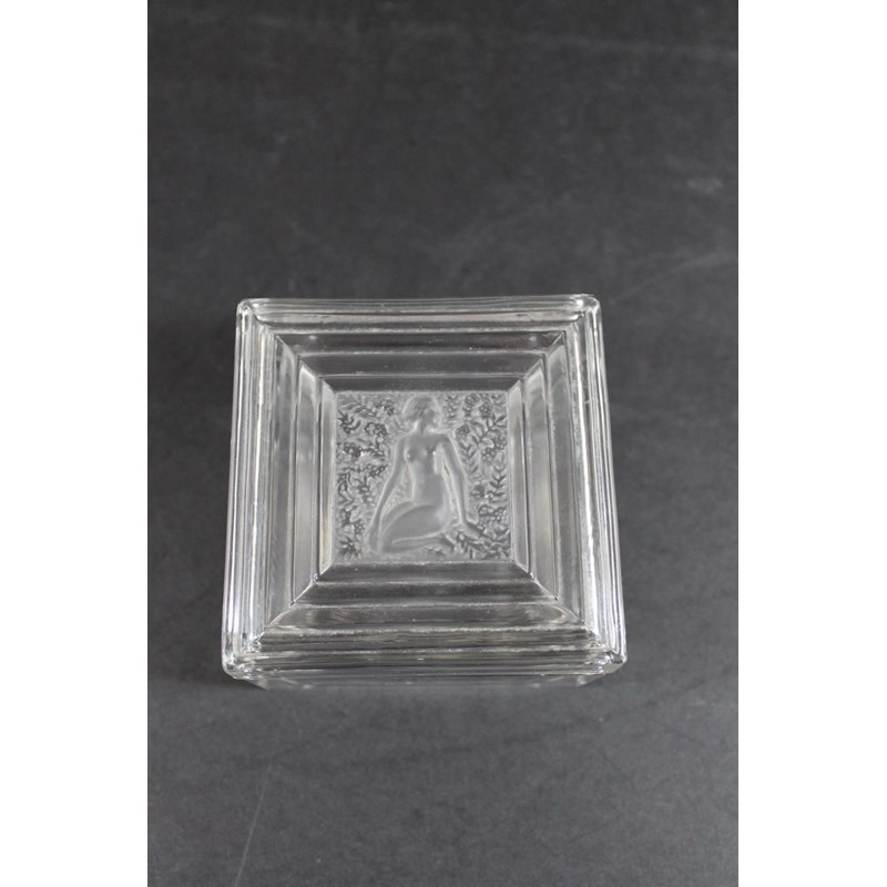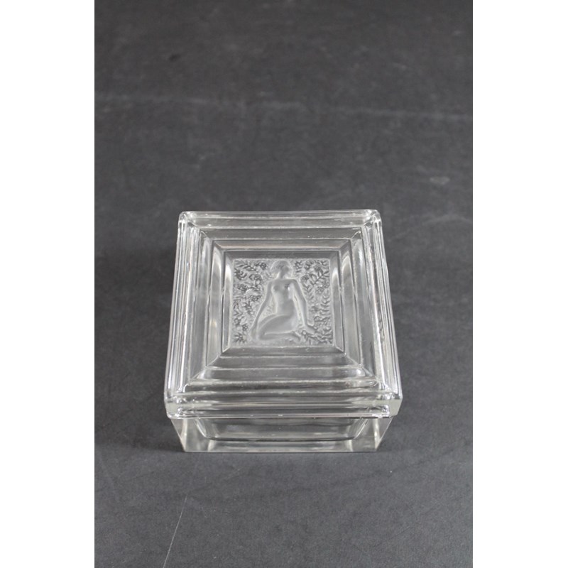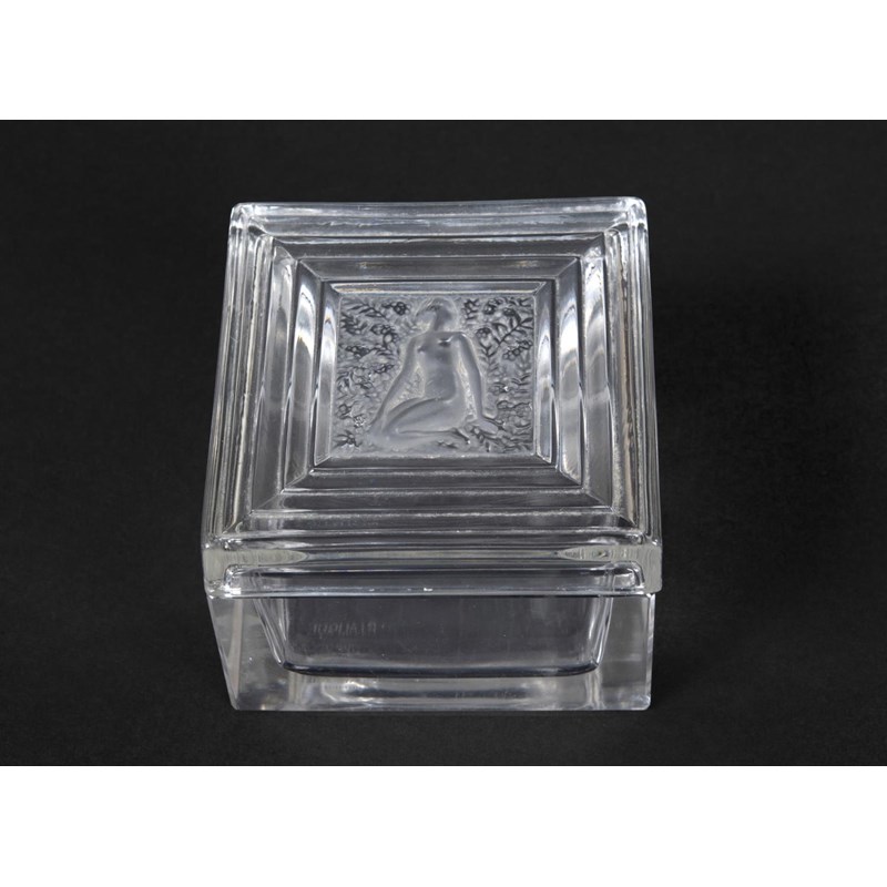 a circa 1930's square box, the lid with a central frosted glass section and with a depiction of a nude female figure amongst foliage. Small chip to the underside of the lid, signed R Lalique. 9cms square, 7cms high