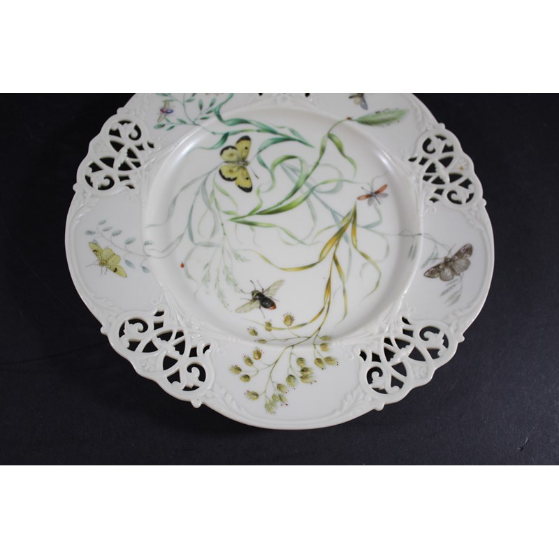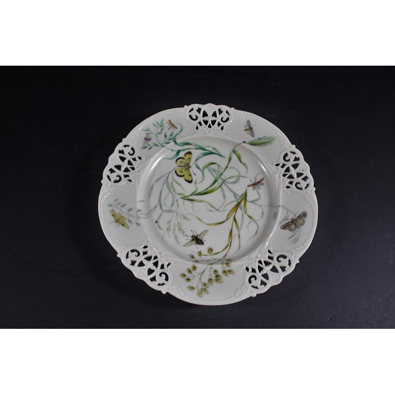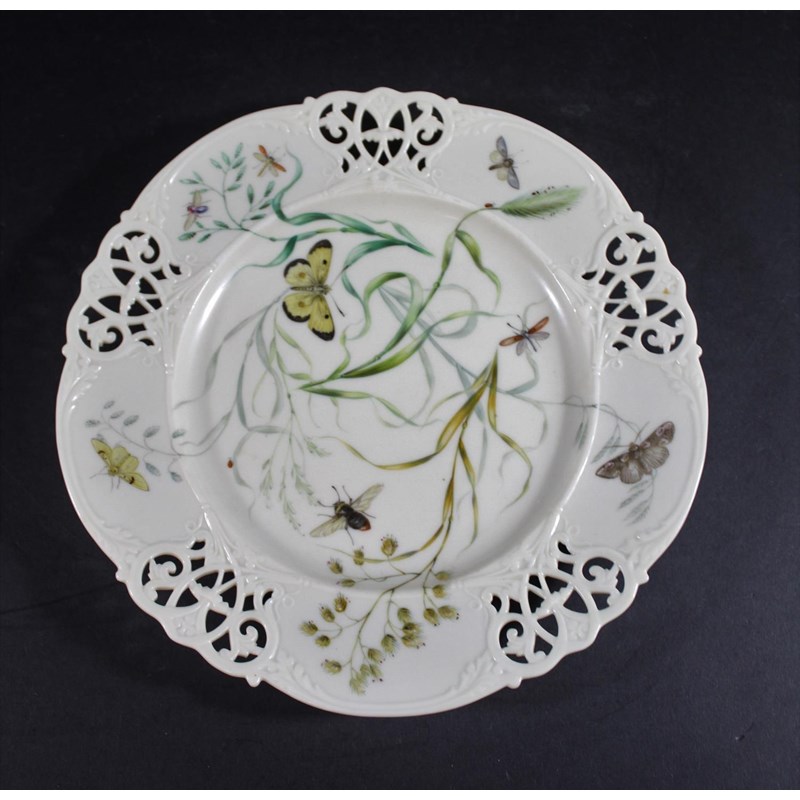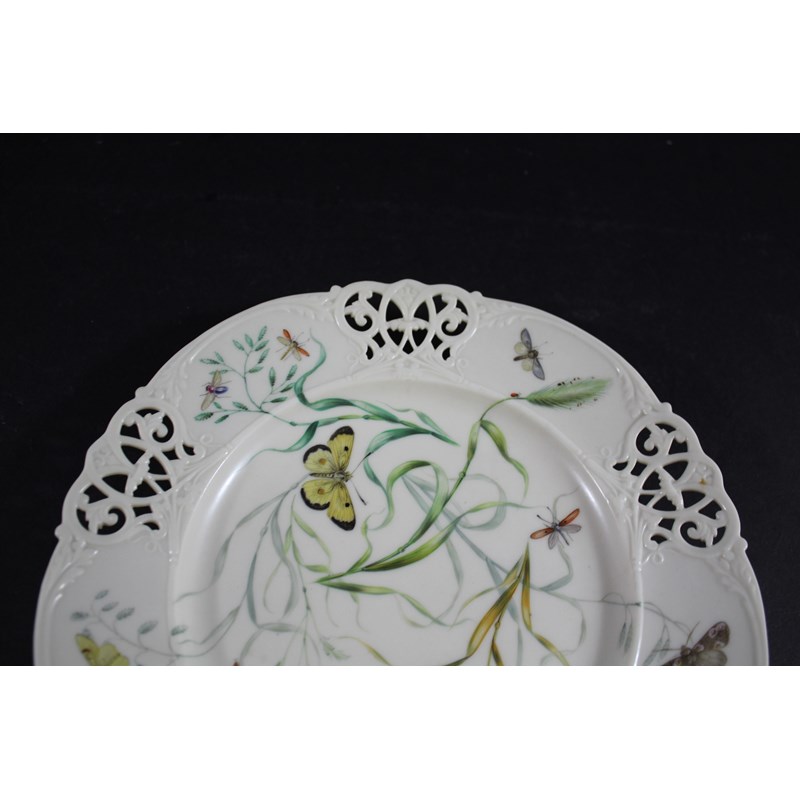 circa 1860-1870, a Victorian plate with a pierced rim, intricately painted with butterflies and insects surrounded by foliage. Impressed Royal Worcester mark, 23.5cms diameter