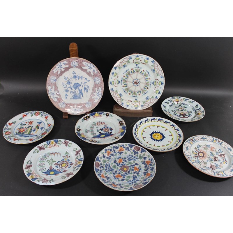 9 various 18thc delft polychrome plates, including one example painted with a sun motif at the centre (22cms dia), one painted with a bird on a branch (22.5cms dia), a larger blue and white plate painted in the centre with a Chinese figure and a manganese border (27cms dia), and various other plates. All in mixed condition with various damages. (9)