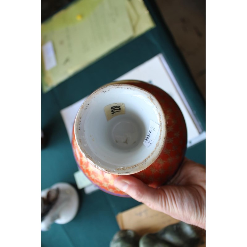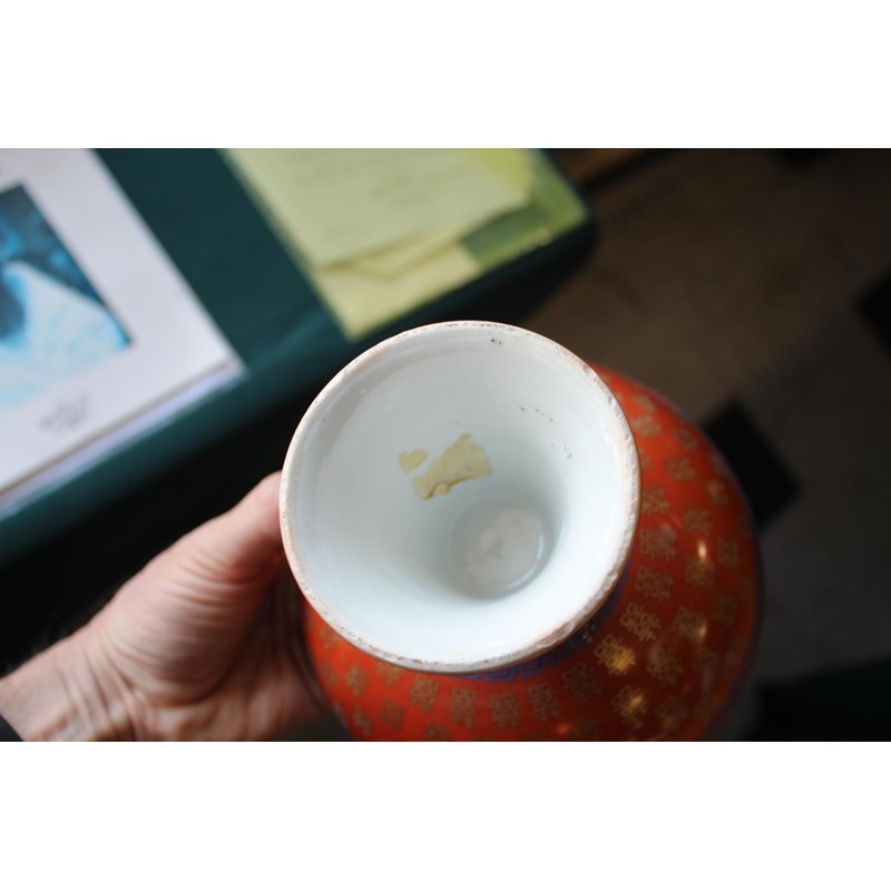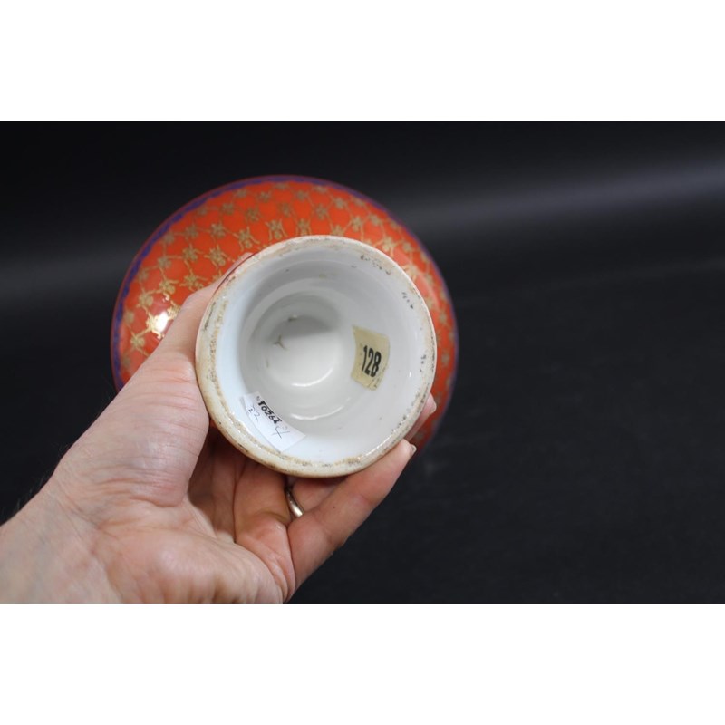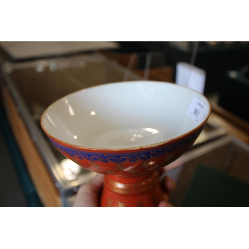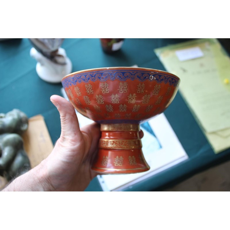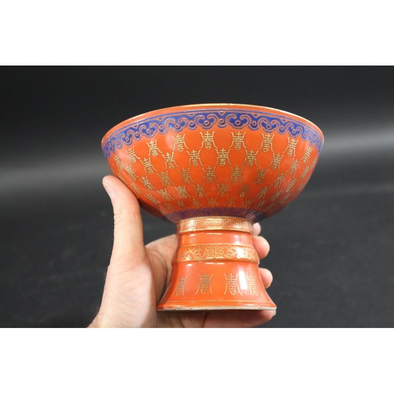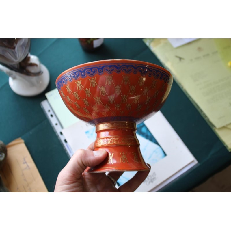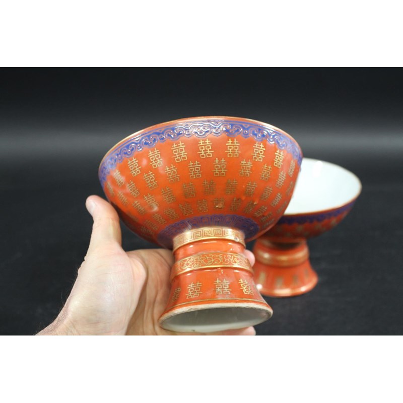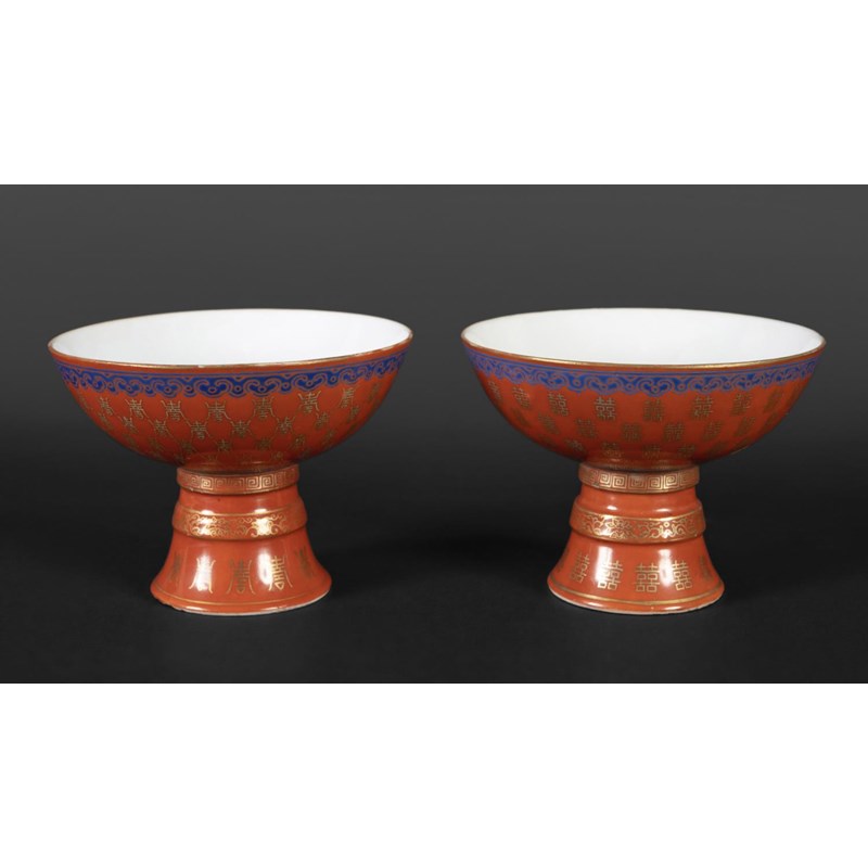 19thc, the circular bowls supported on tapering bases, with a variety of gilded Chinese shou symbols on a coral ground, and bands of blue painted decoration. 12.5cms high, 16.5cms diameter. (2)