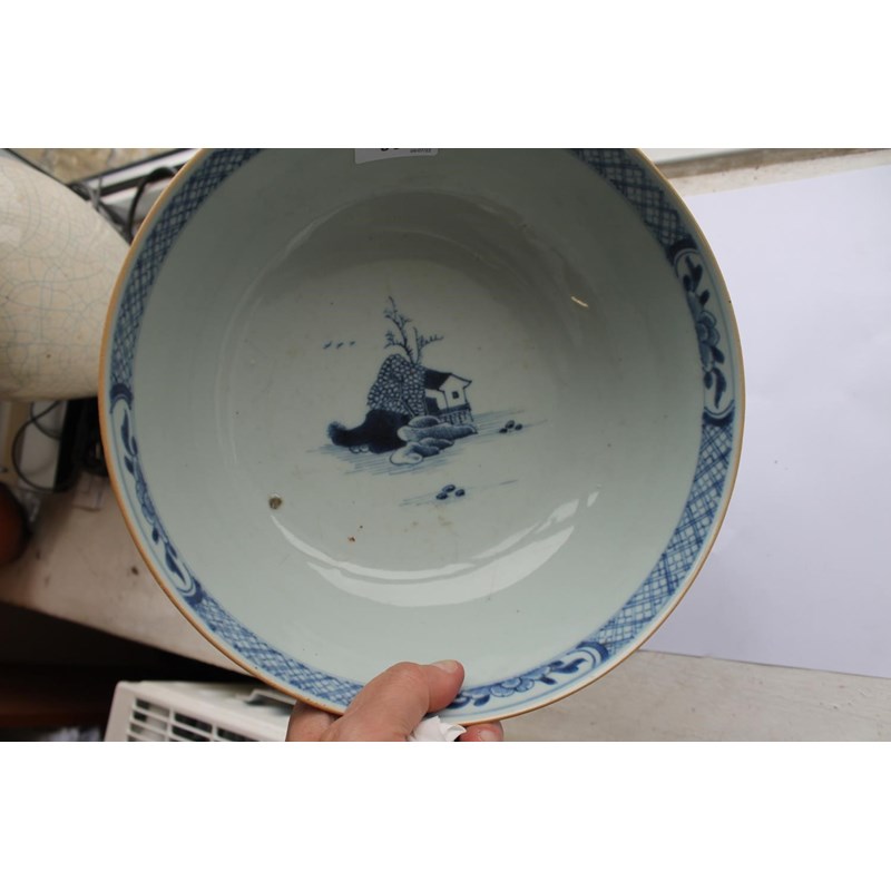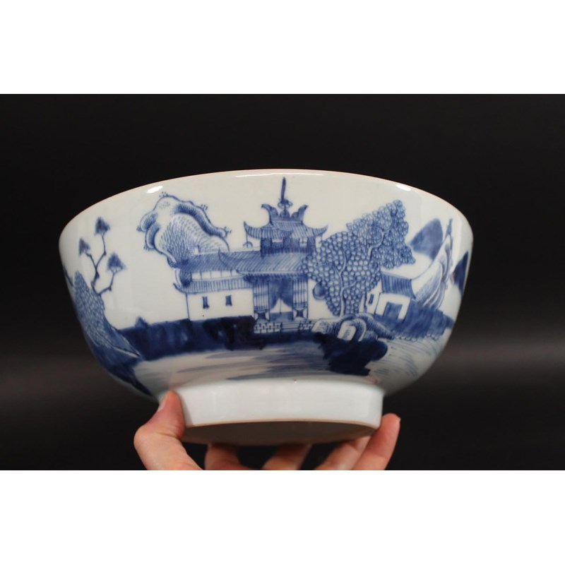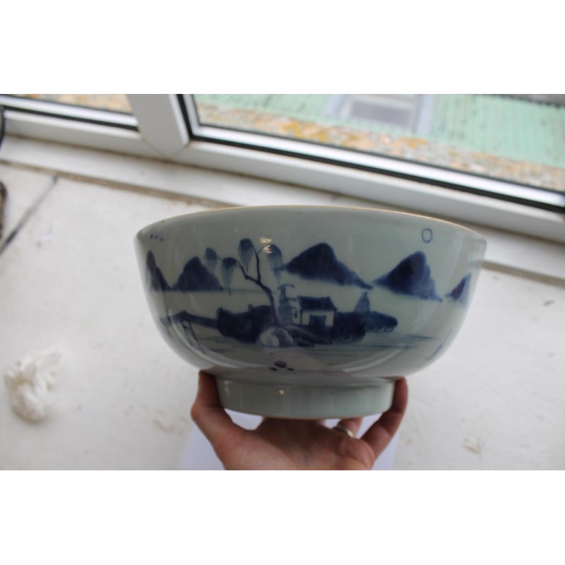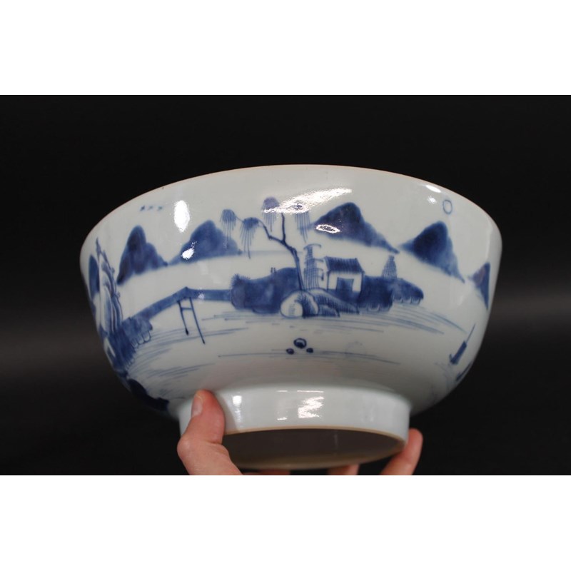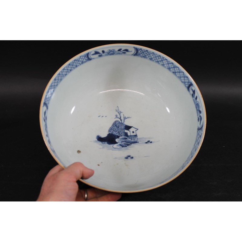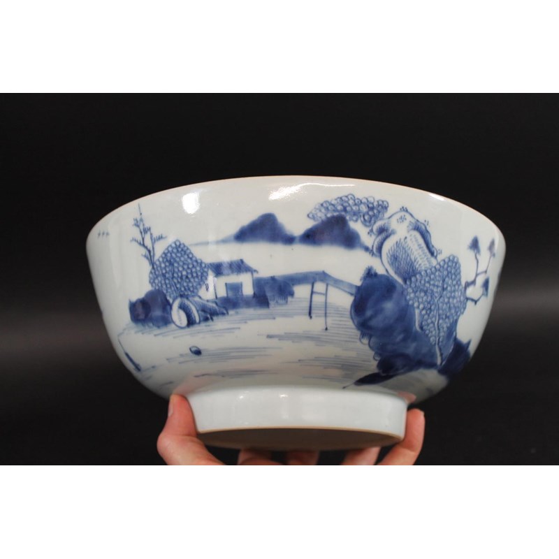 18thc, a large blue and white bowl, painted with buildings by water within mountainous landscape scenes, also painted with boats, flowering trees etc. 25.5cms diameter