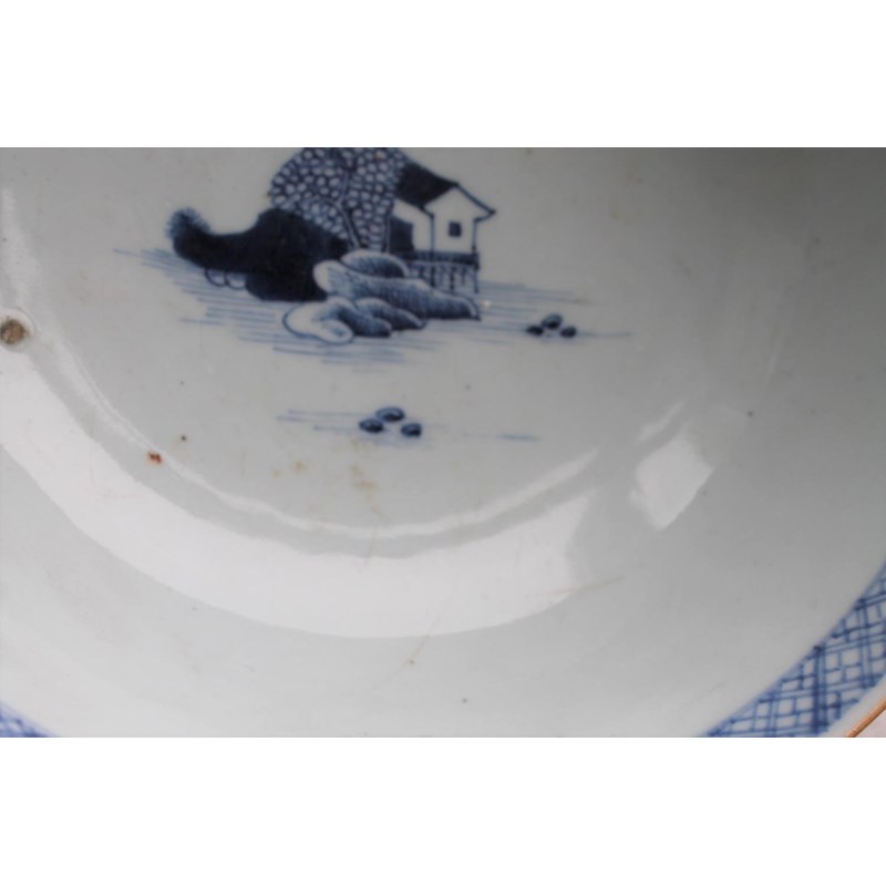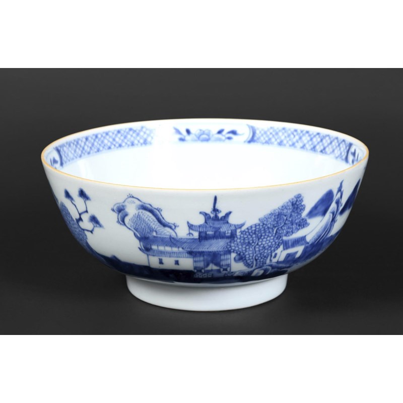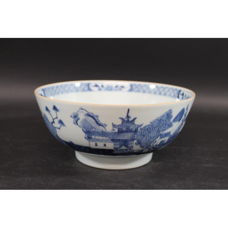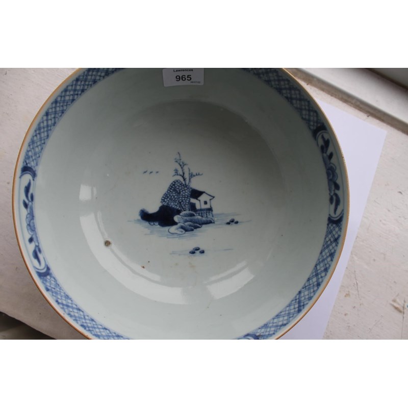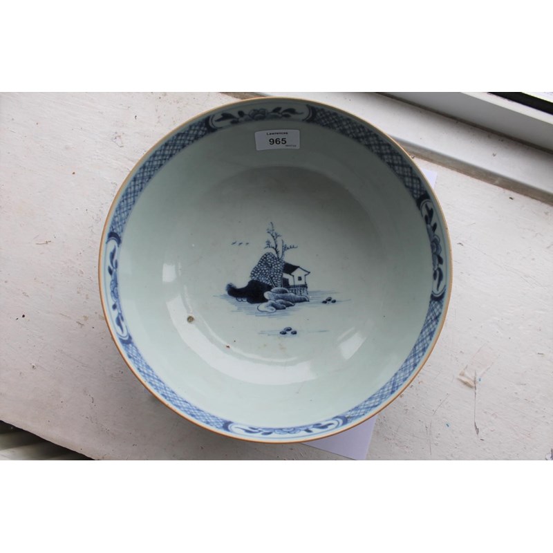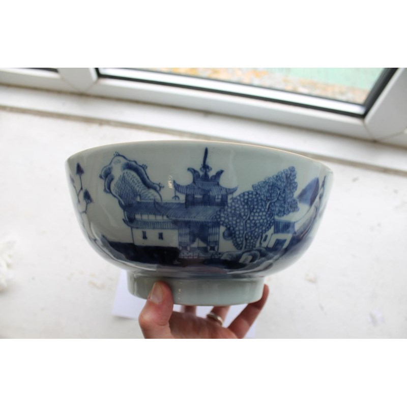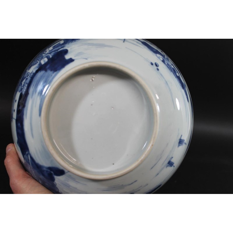 18thc, a large blue and white bowl, painted with buildings by water within mountainous landscape scenes, also painted with boats, flowering trees etc. 25.5cms diameter