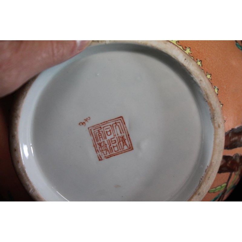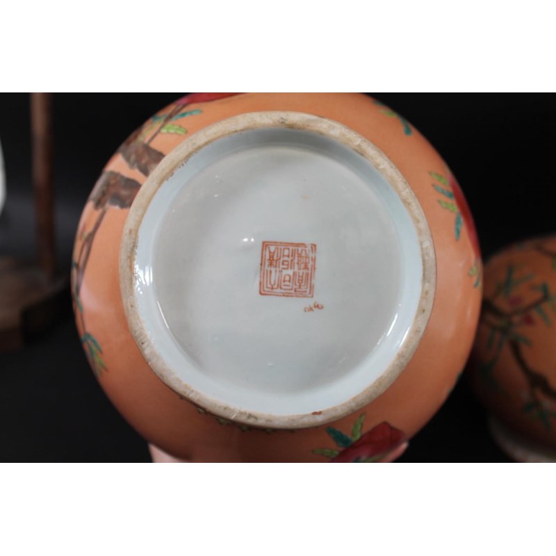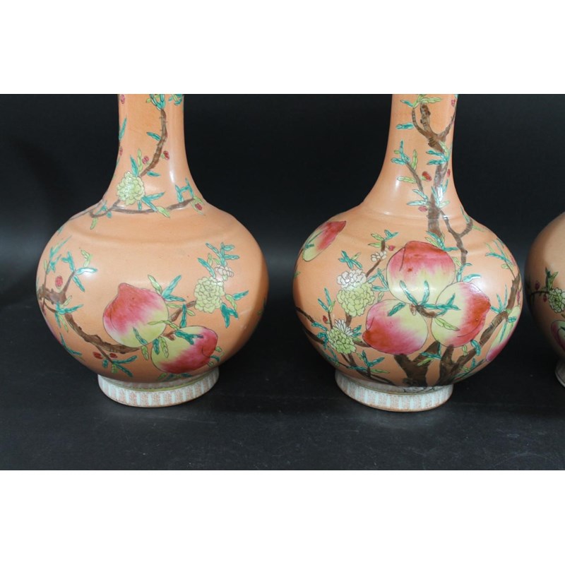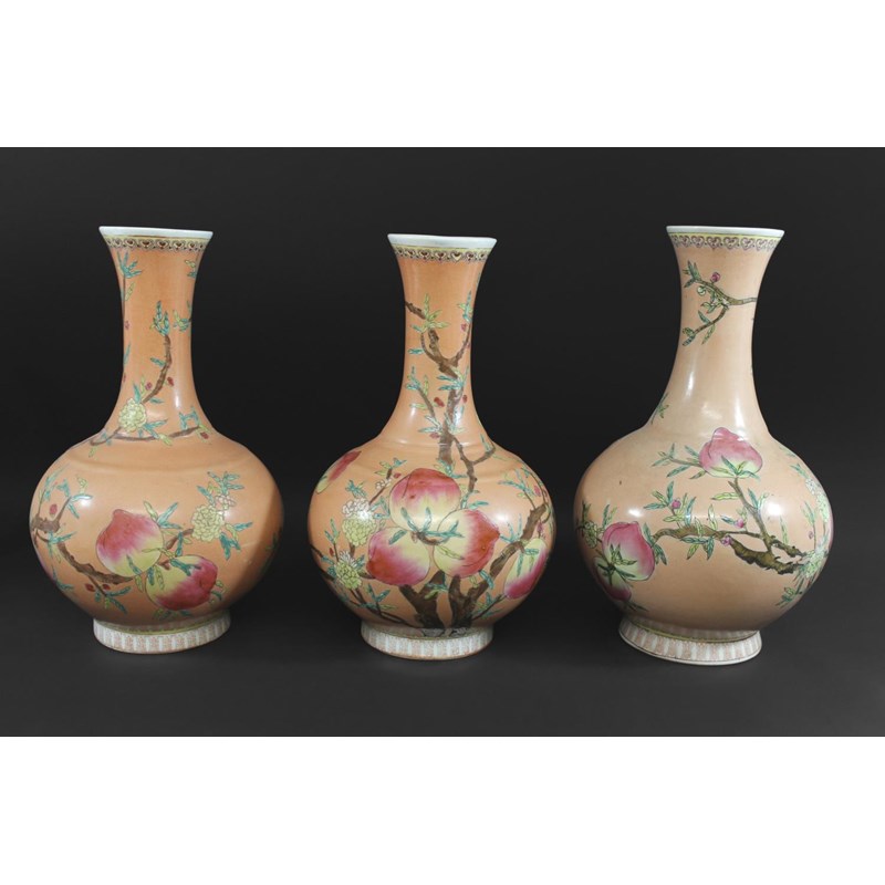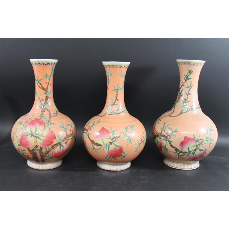 a set of three 20thc vases, the bottle shaped vases painted with peaches on flowering branches on a peach coloured ground. Each with pseudo seal mark to the base. 38.5cms high. (3)