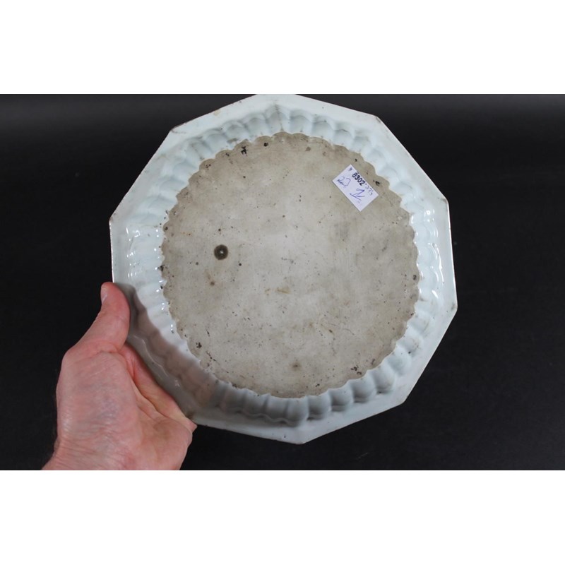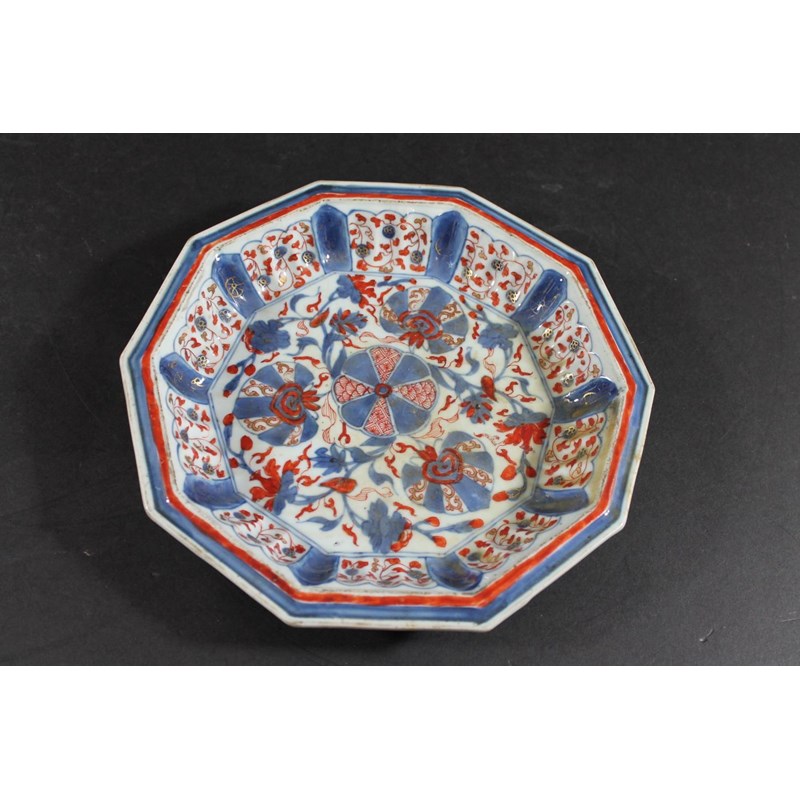 18THC CHINESE IMARI DISH a decagonal shaped dish with fluted sides, painted in imari colours with various flowers and foliage and a red and blue border around the rim. 22.5cms by 22.5cms