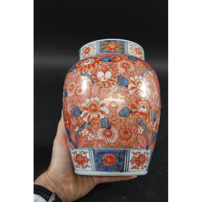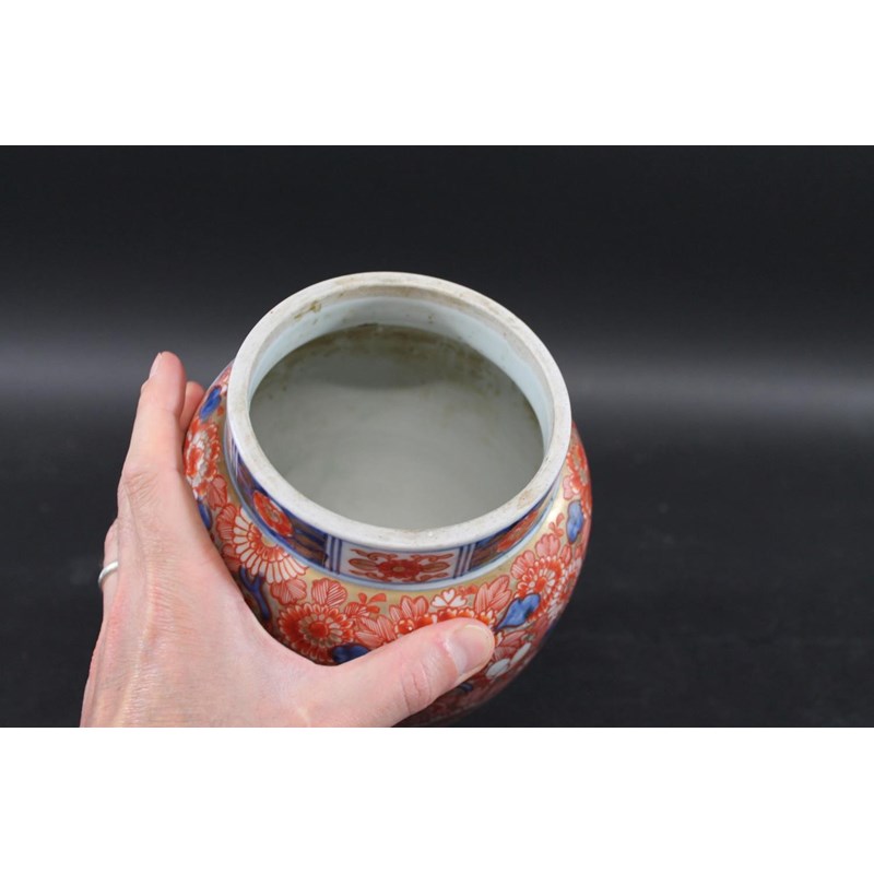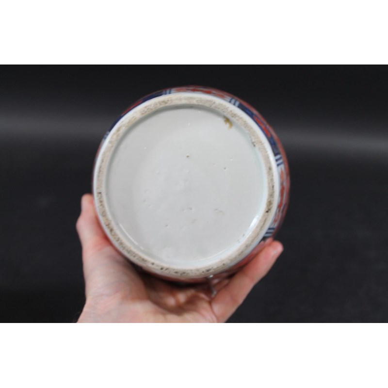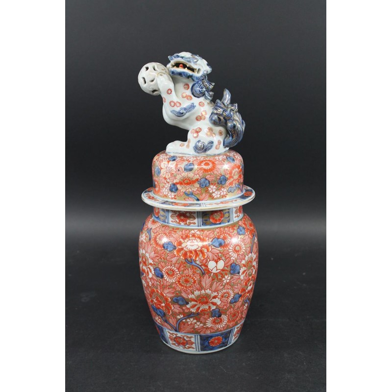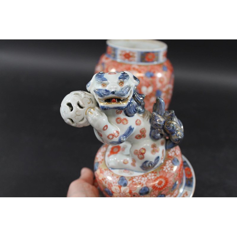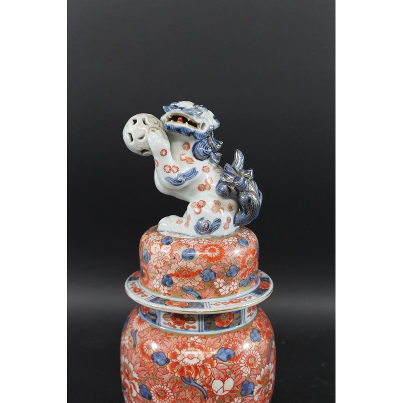 CHINESE IMARI JAR & COVER a lidded jar and cover with large Dog of Fo finial, profusely painted with Chrysanthemum in Imari colours. 38.5cms high